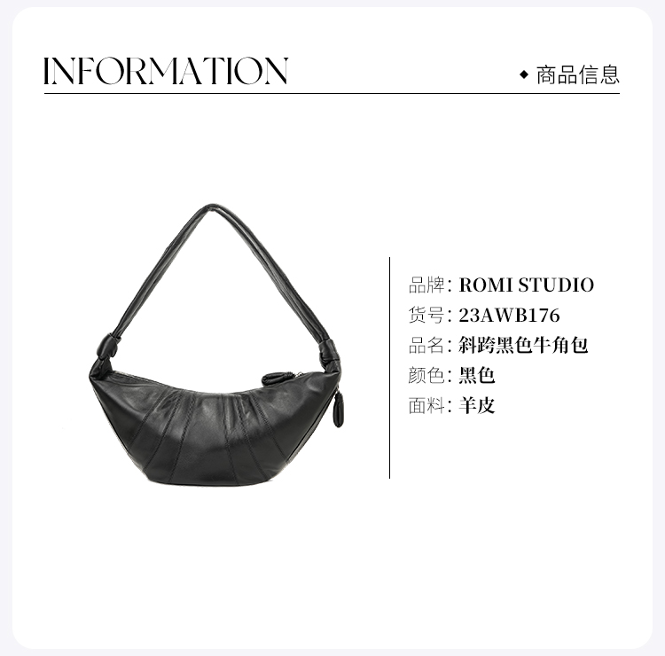 ROMI STUDIO"侘寂风"全羊皮大容量单肩斜跨黑色牛角包23AWB176
