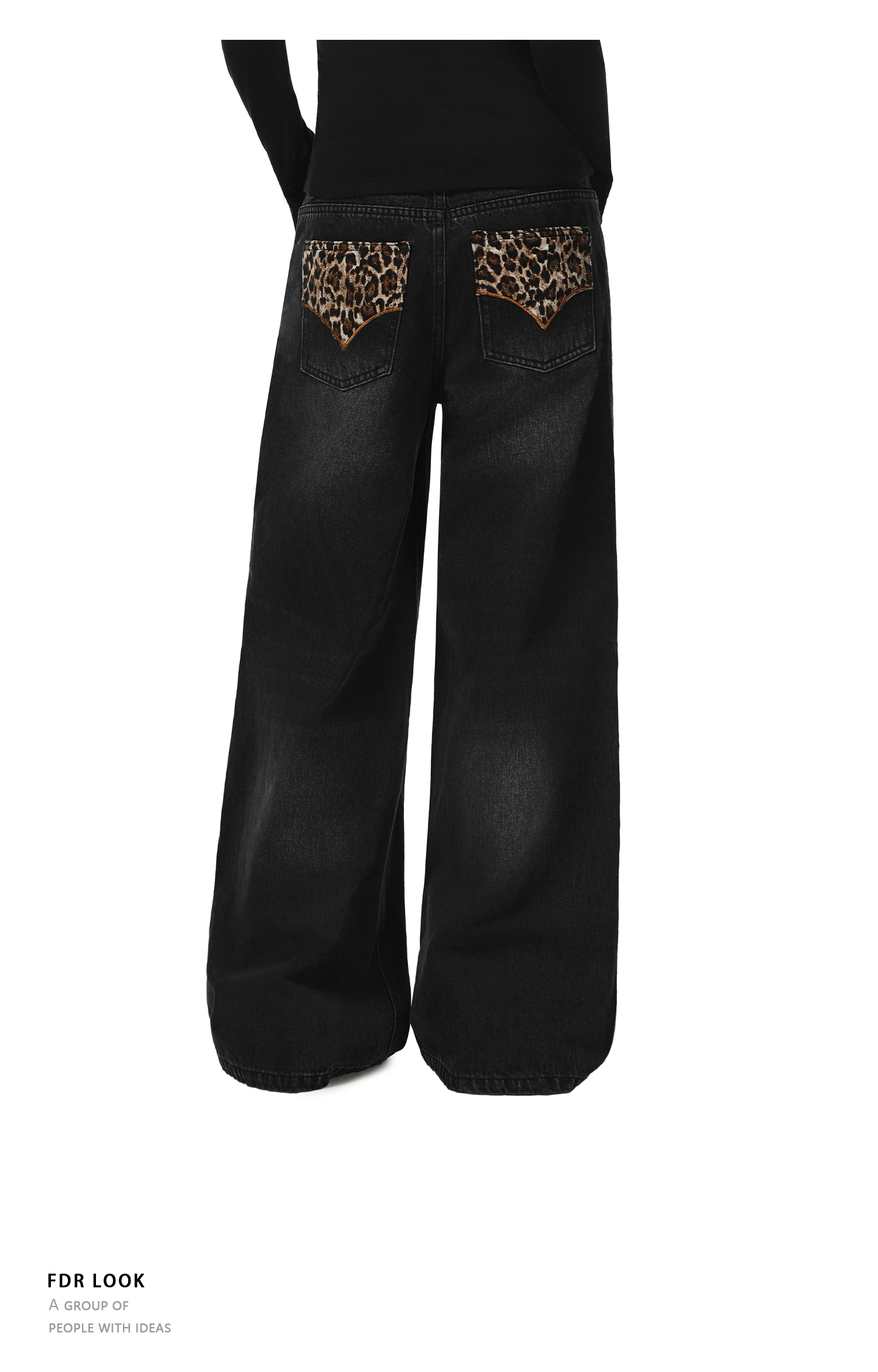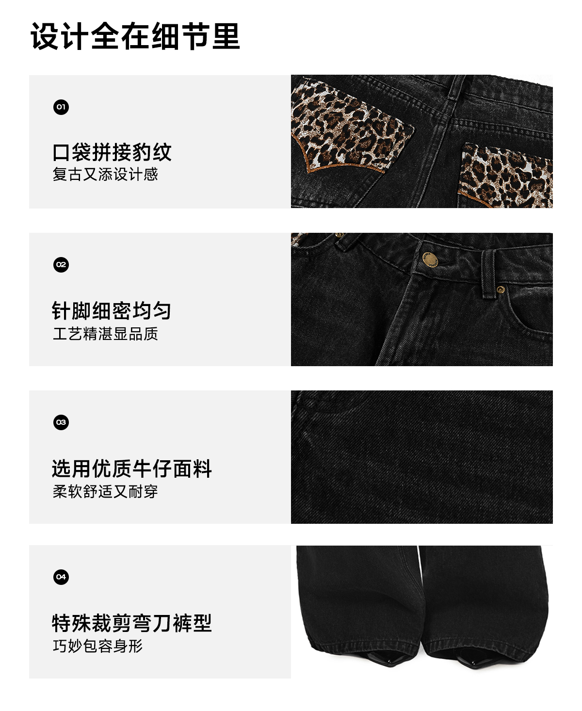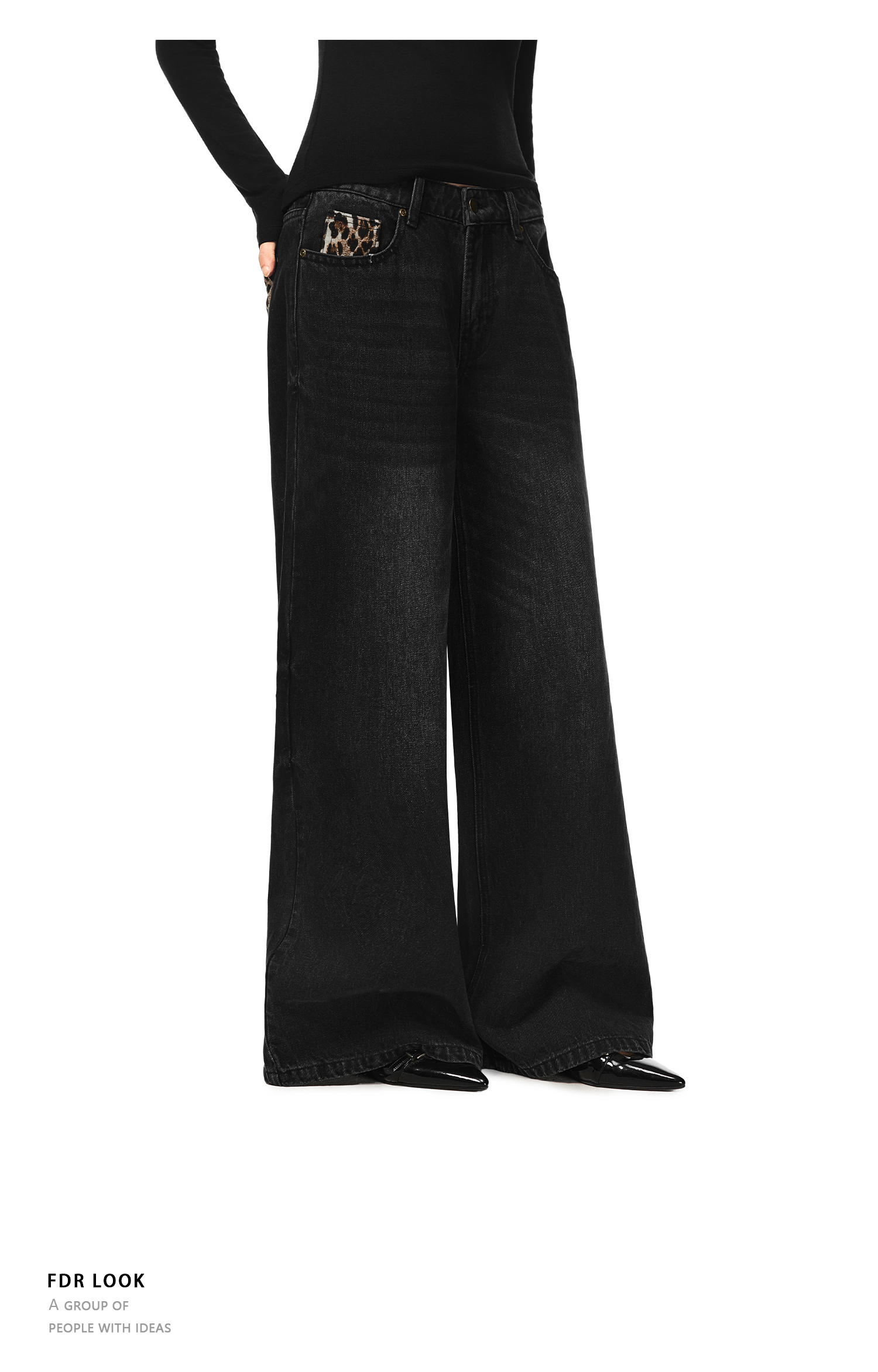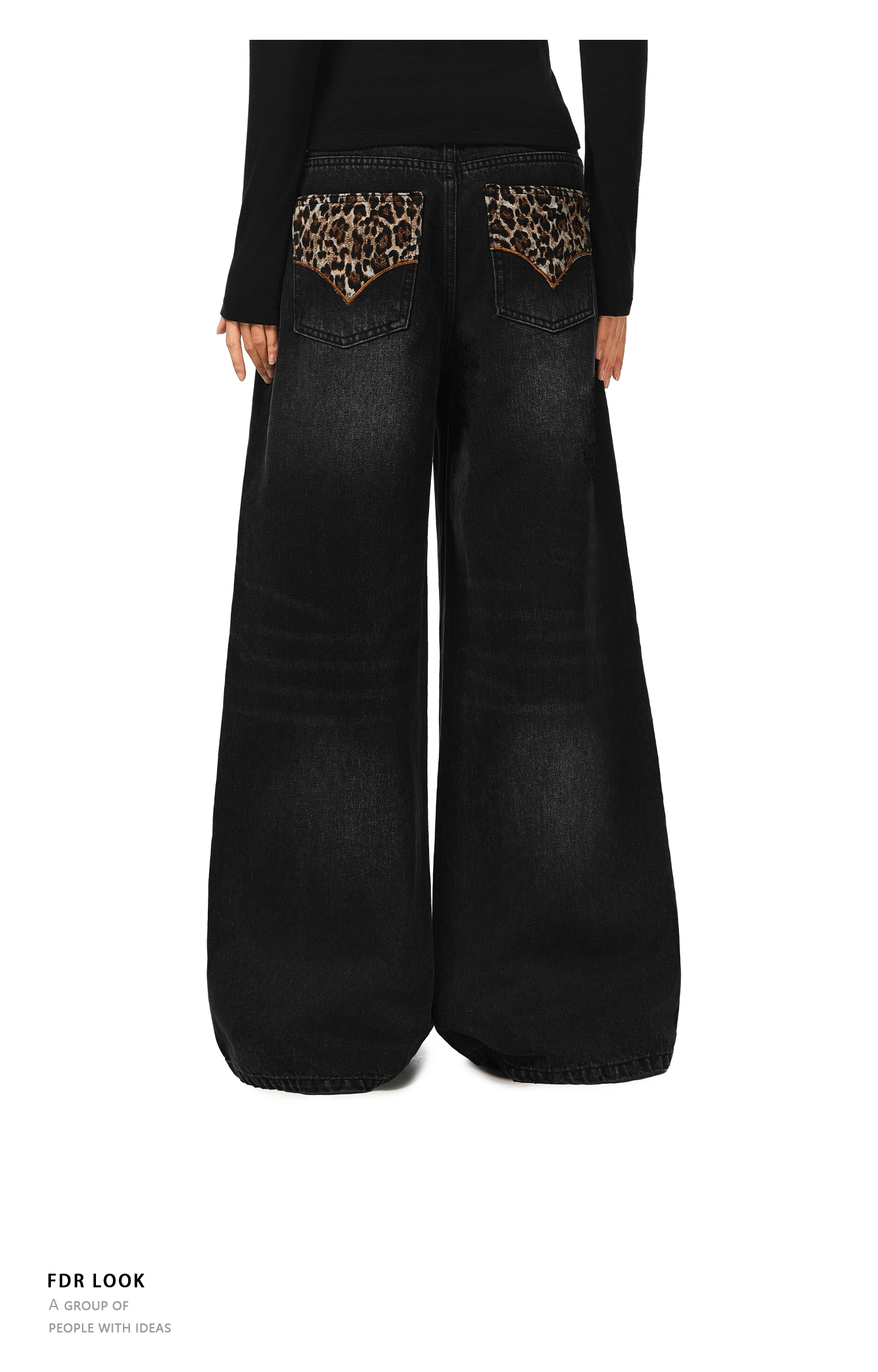 FDR官方店 豹纹拼接洗水直筒阔腿牛仔裤女2025新款小个子百搭长裤