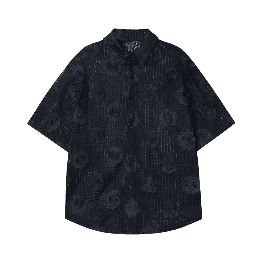 CS84夏季时尚针织条纹拼接玫瑰男士衬衫潮流宽松复古上衣休闲短袖