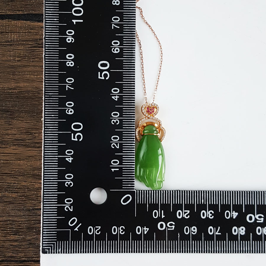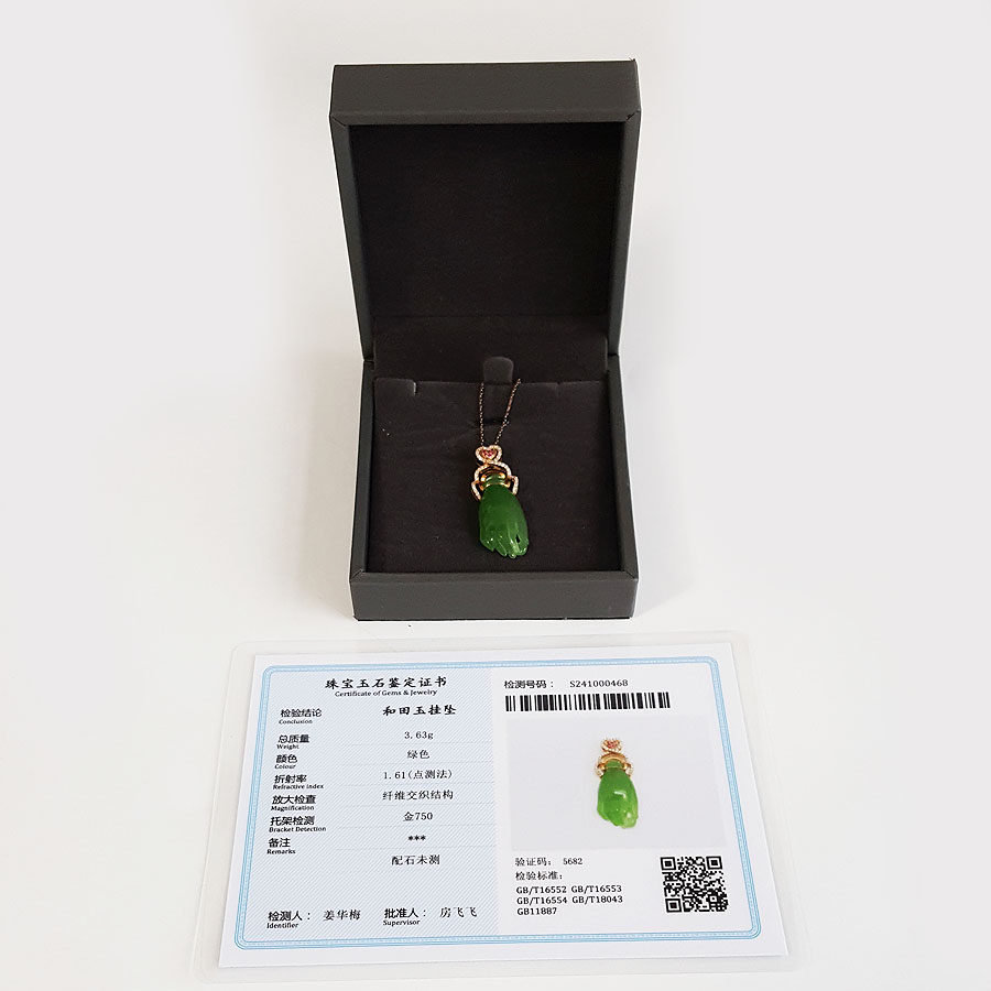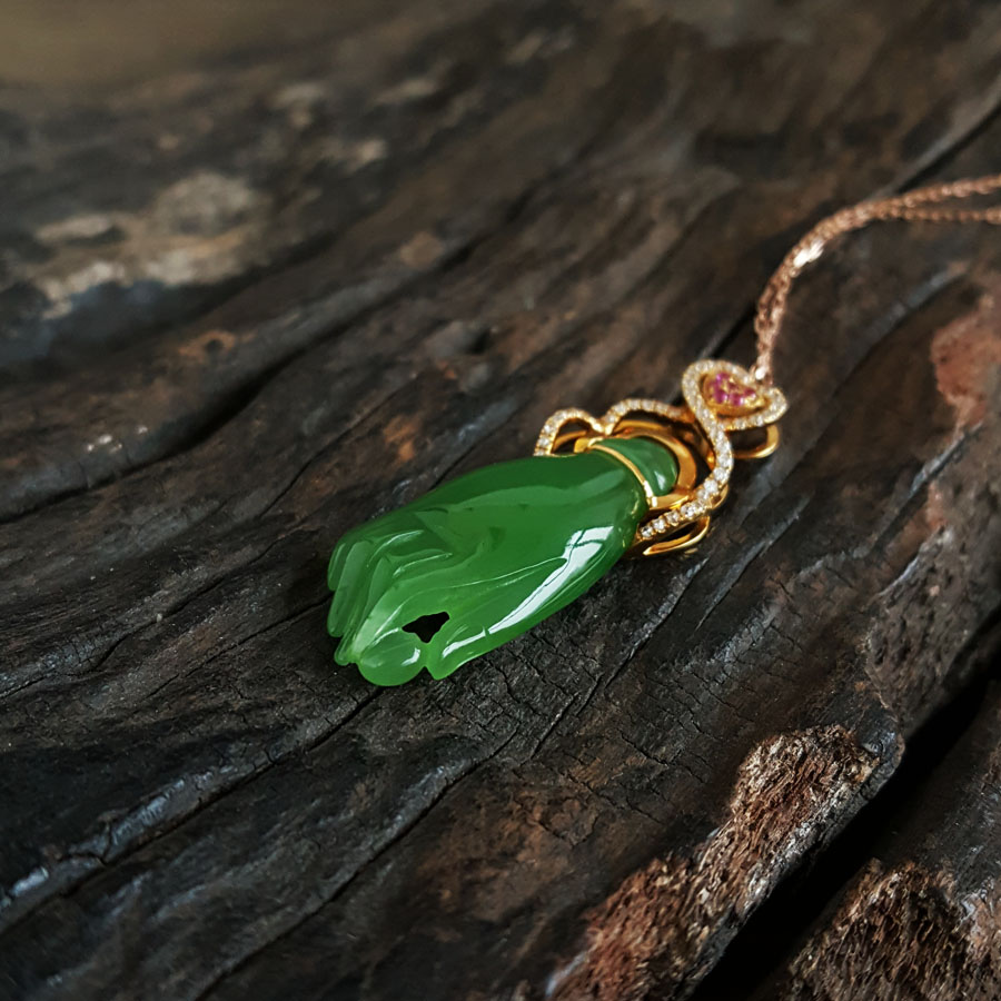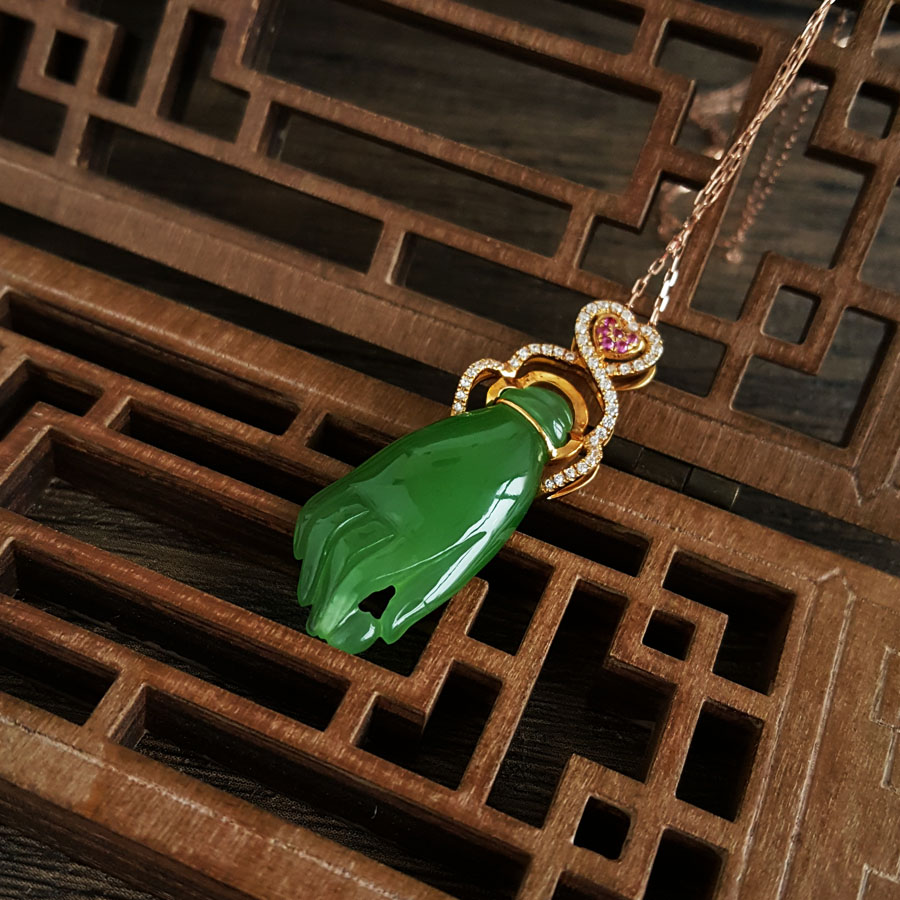 名称 | AU750黄金镶天然菠菜绿无黑点佛手造型和田玉碧玉吊坠项链 |