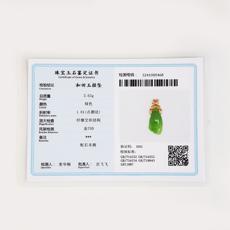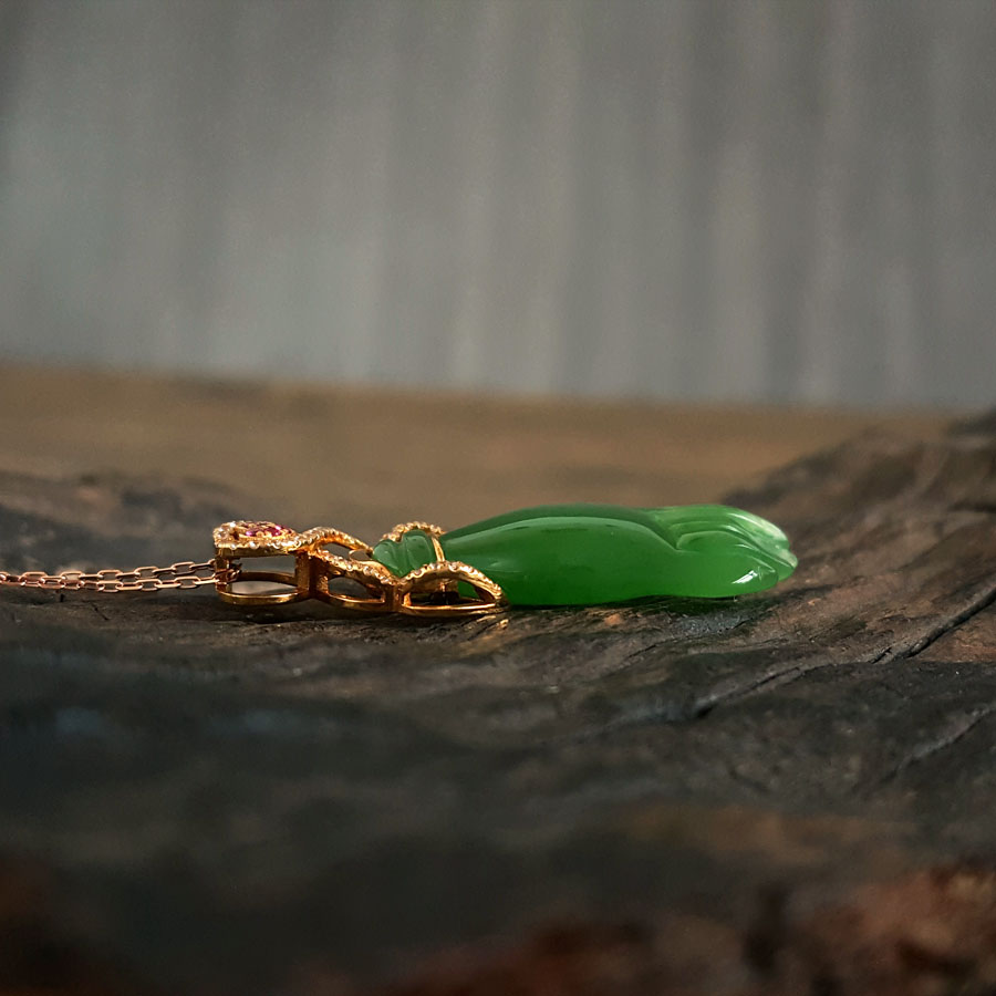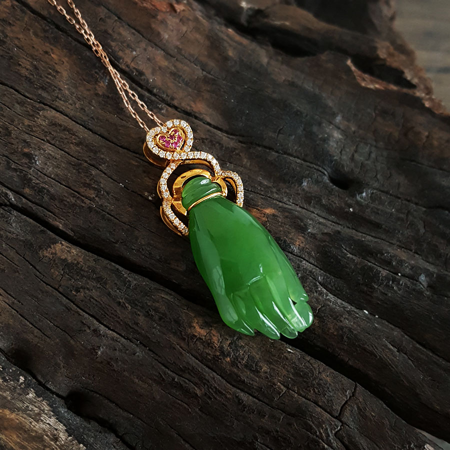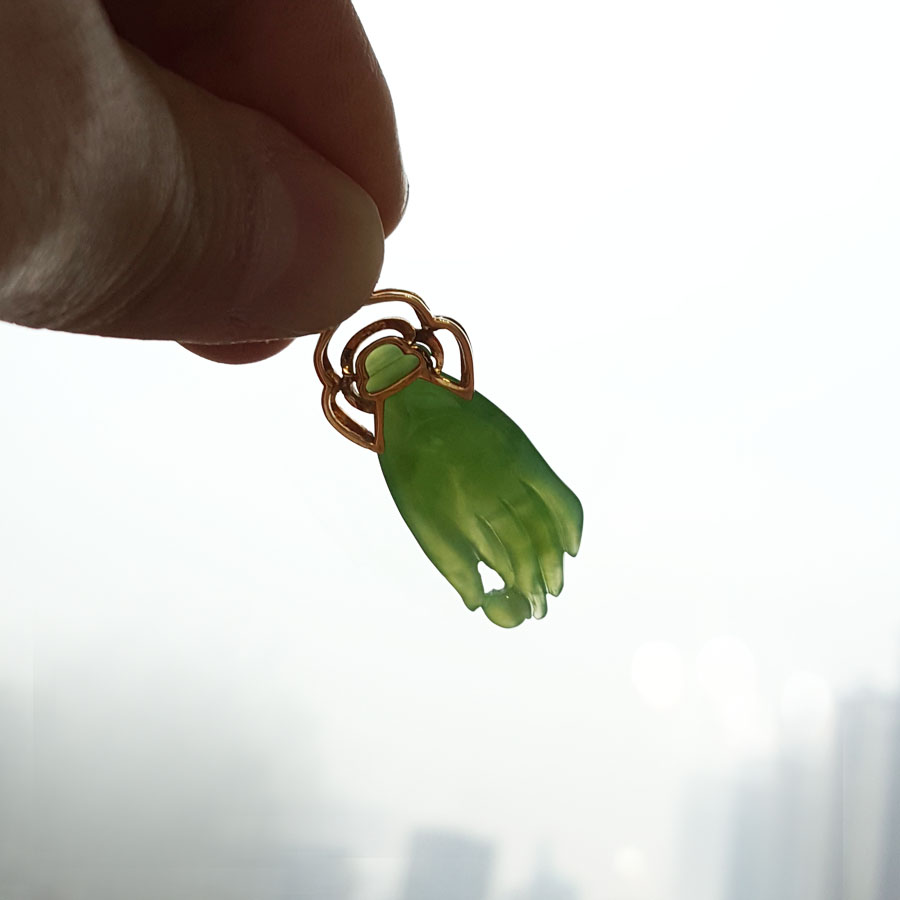 名称 | AU750黄金镶天然菠菜绿无黑点佛手造型和田玉碧玉吊坠项链 |