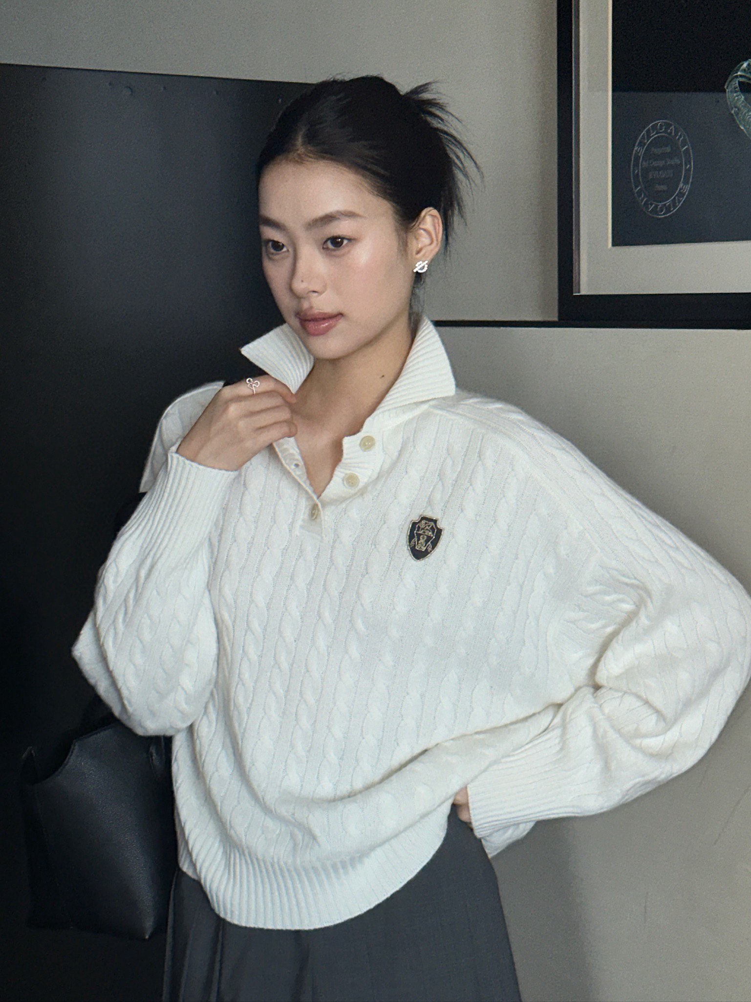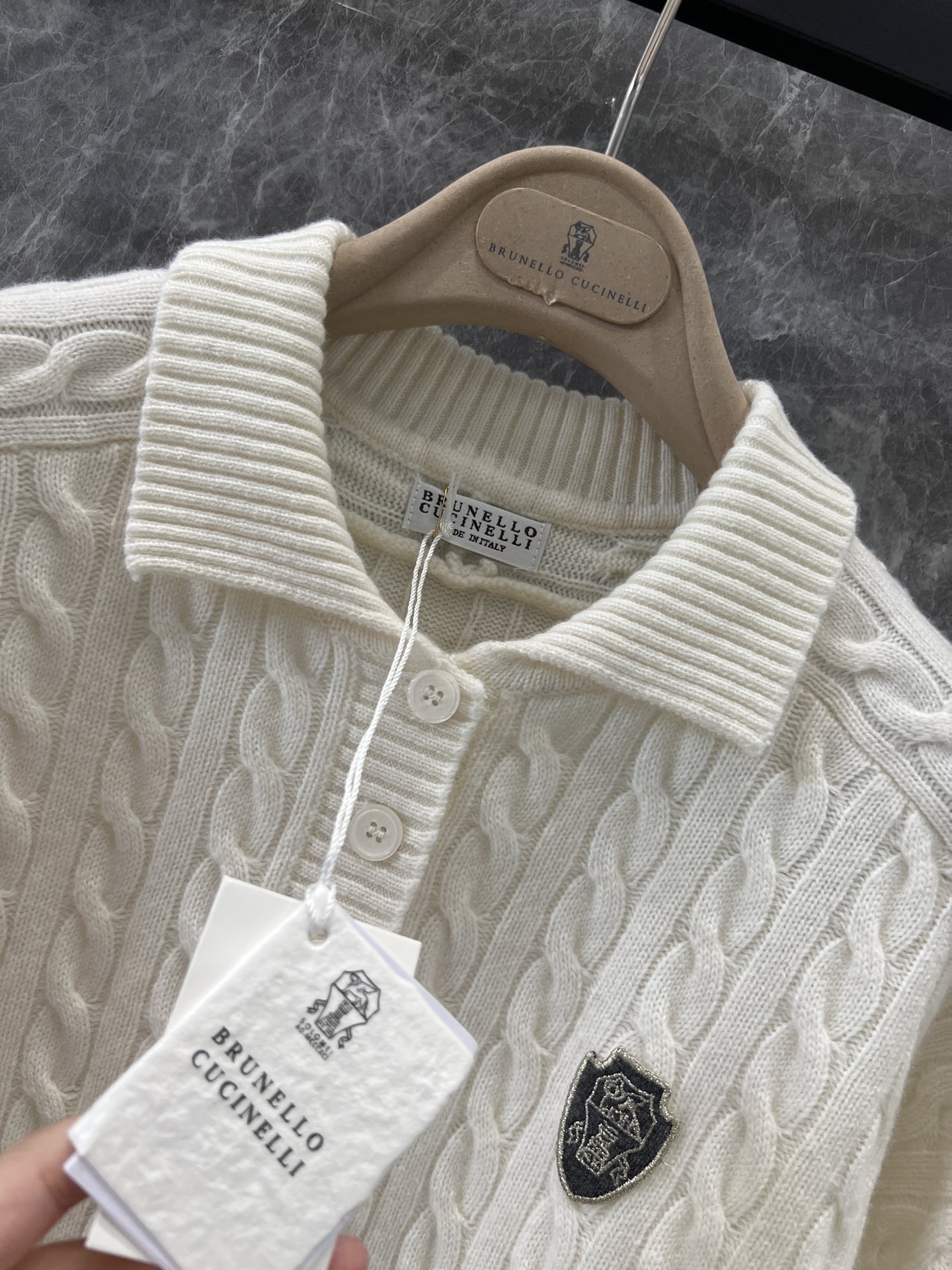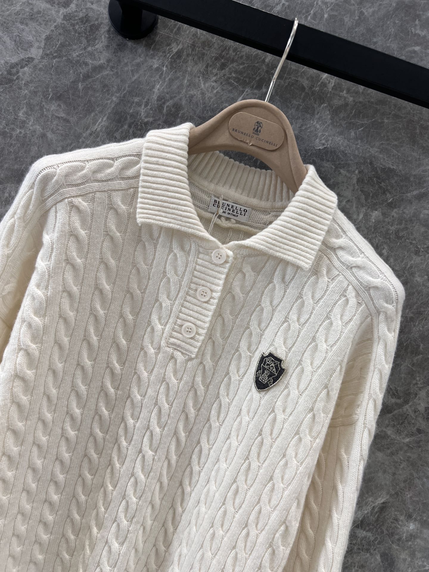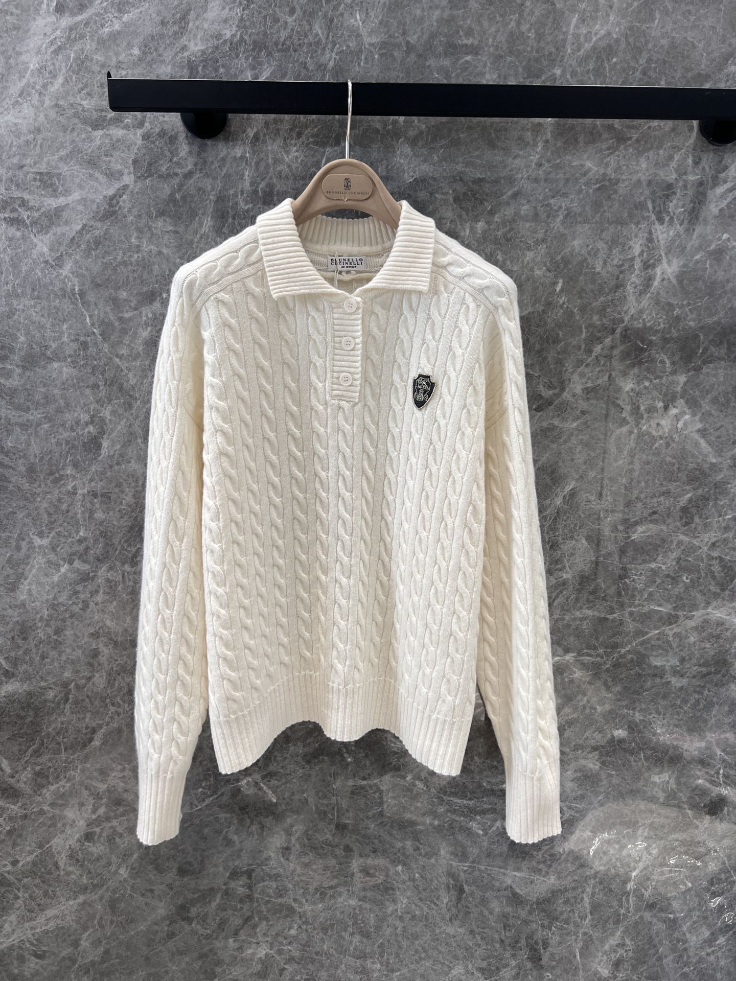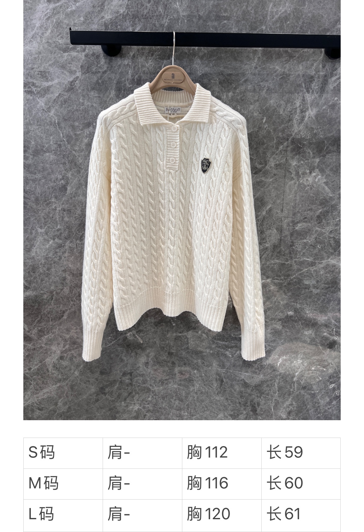 Brunello Cucin*lli 24AW秋冬新款 老钱金丝徽章绞花羊绒廓形Polo毛衣丨⚠独家高版出品!经久不衰的简约基础设计,轻松打造都市时尚风采。复古立体绞花织法—灵魂提升复古美学。立体有型的片铺有序的绞花设计,增添设计感同时高极感一目了然,是审美与工艺的莞美结合,上身有型更显瘦。尺码表S/M/L