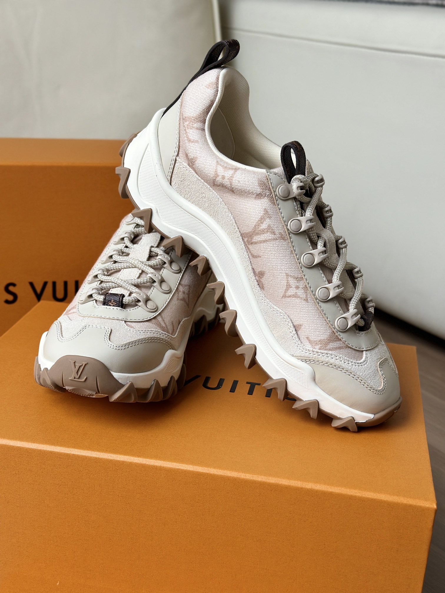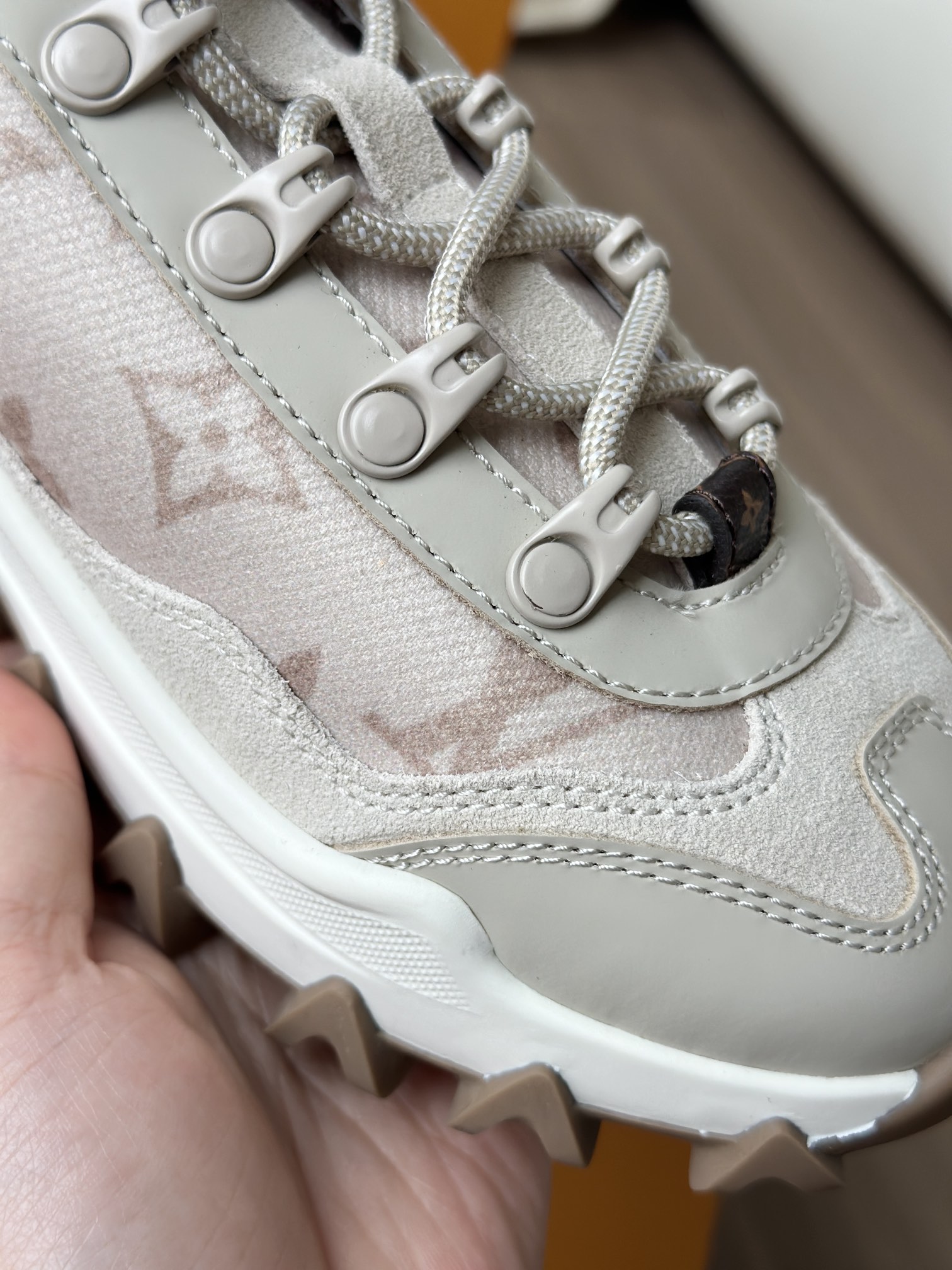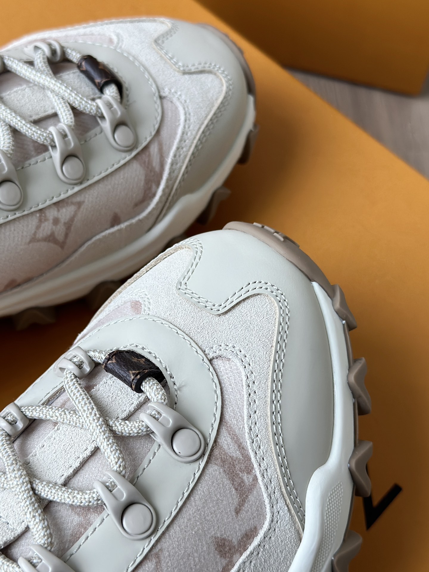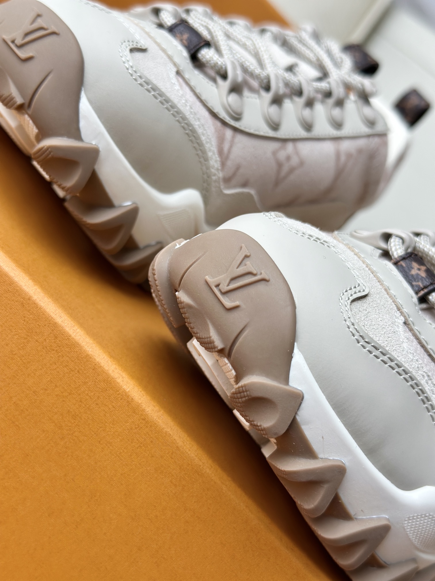 标志性 Monogram 帆布拼接透气网布,锯齿状厚底自带增高气场,既保留了品牌辨识度,又注入了户外机能感