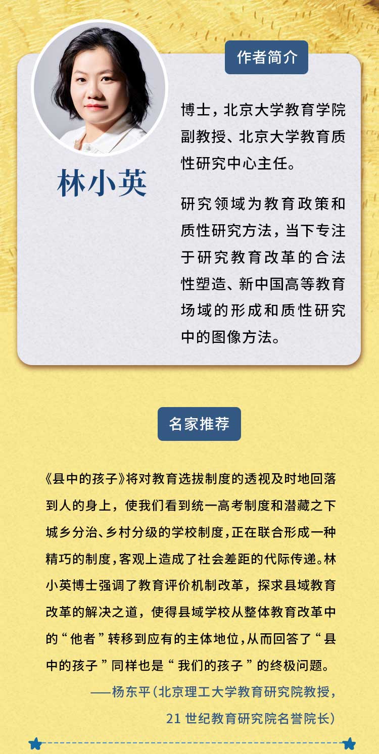 林小英博士,北京大学教育经济研究所/教育学院长聘副教授、北京大学教育质性研究中心主任。研究领域为教育政策和质性研究方法,当下专注于研究教育改革的合法性塑造、新中国高等教育场域的形成和质性研究中的图像方法。代表作有《县中的孩子:中国县域教育生态》。