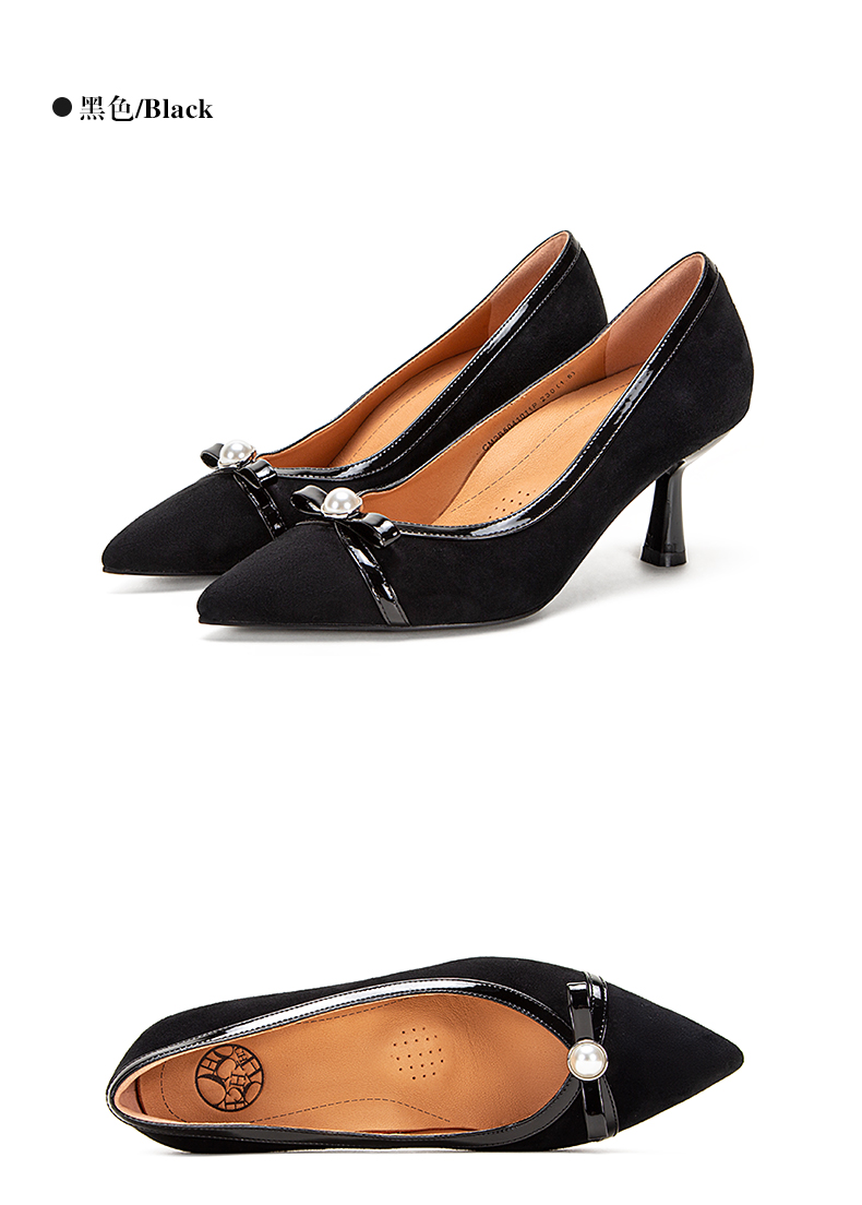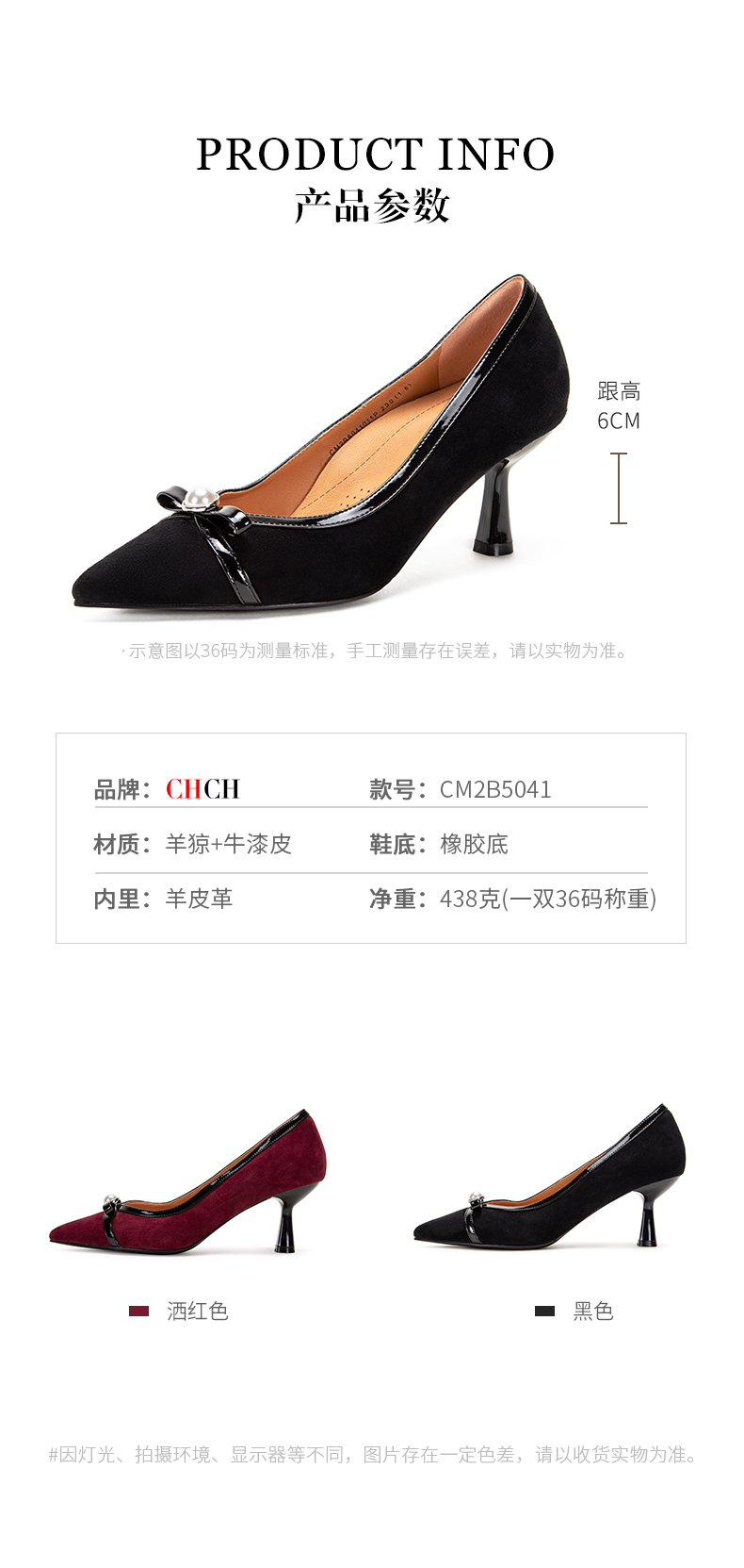 CHCH平衡鞋磨砂翻皮单鞋女春2024年新款蝴蝶结粗跟浅口黑色女鞋