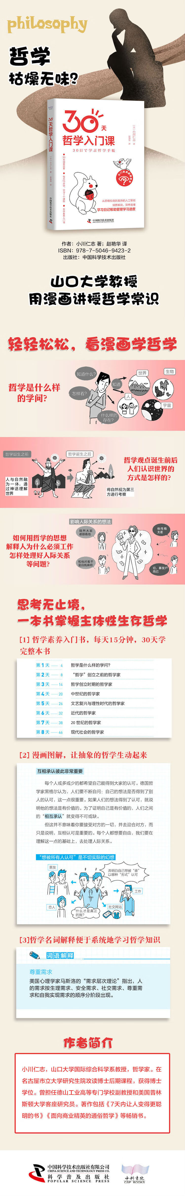 前 言 哲学从未像今天这样备受关注。原因何在?本就僵化停滞不前的世界,现在又受到流行性传染病的袭击,人们变得无所适从。 人们迫切地需要从根本上重新审视自己的工作、人际关系,甚至是生活方式。哲学既是一门重新审视它们的学问,同时也是一种工具。正如您能在本书所看到的,用哲学的思维方式思考事物的本质并将其用于指导现实生活。 然而遗憾的是,直到今天人们仍对哲学有一种误解。人们认为只有阅读深奥难懂的哲学经典,并进行艰难的讨论才是运用哲学。其实,这仅仅是对哲学的研究,而不是真正的运用哲学。 运用哲学是指人们应用哲学知识,用自己的头脑来思考世界和自己的人生。然而,人们要做到这些并非易事。即使是学者,也要花费很多年的时间才能掌握哲学这门学问,更何况是运用哲学。更麻烦的是,日本并没有一个合适的地方,能够让初学者轻松地学习哲学知识并将其用于现实生活。 为了解决这两个问题,我构思并创作了本书,目的是使读者通过阅读本书,在30天之内就能学到哲学的基础知识,并进行简单的哲学思考。当然,您只用30天不可能了解哲学的 全貌。但是,如果您只是想掌握哲学的大概情况,那本书完全能满足您的要求。要学习哲学的基础知识,您首先要读书。之后,您就可以自己独立思考,或者与其他人进行哲学层面的对话了。 希望本书能够帮助您打破僵局,走出困境。下面,让我们一起开启30天的哲学学习之旅吧!——哲学家 小川仁志