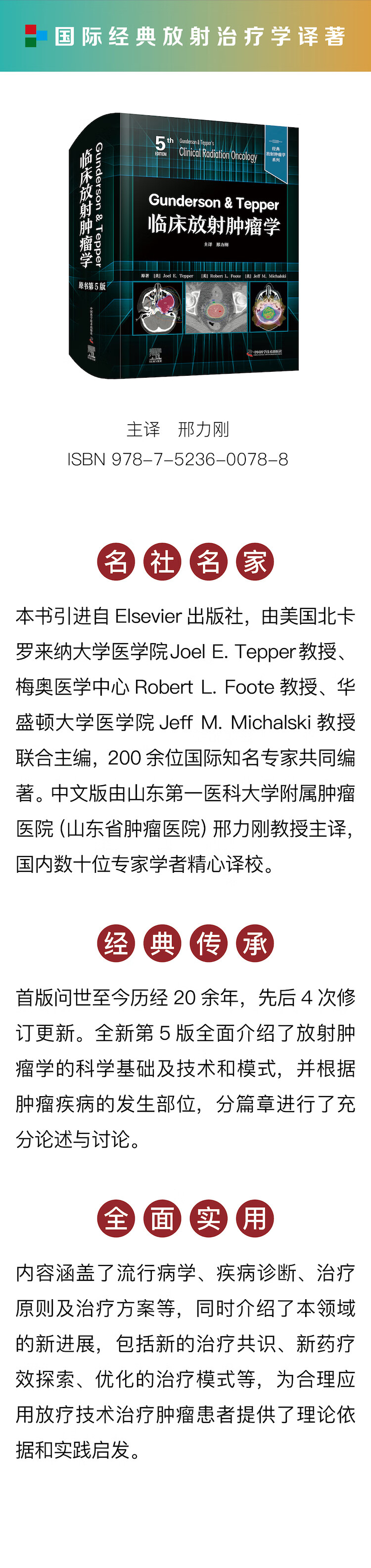 本书引进自 Elsevier 出版社,由美国北卡罗来纳大学医学院 Joel E. Tepper 教授、梅奥医学中心Robert L. Foote 教授、华盛顿大学医学院 Jeffff M. Michalski 教授联合主编,200 余位国际知名专家共同编著。该书首版问世至今历经 20 余年,先后 4 次修订更新。全新第 5 版全面介绍了放射肿瘤学的科学基础及技术和模式,并根据肿瘤疾病的发生部位,分篇章进行了充分论述与讨论,涵盖了流行病学、疾病诊断、治疗原则及治疗方案等,同时介绍了本领域的最新进展,包括更新的治疗共识、新药疗效探索、最佳治疗模式等,为合理应用放疗技术治疗肿瘤患者提供了理论依据和实践启发。本书内容全面,图文并茂,适合放射肿瘤专业医师、放射治疗师、肿瘤外科医师、肿瘤内科医师及广大医学生阅读参考。
