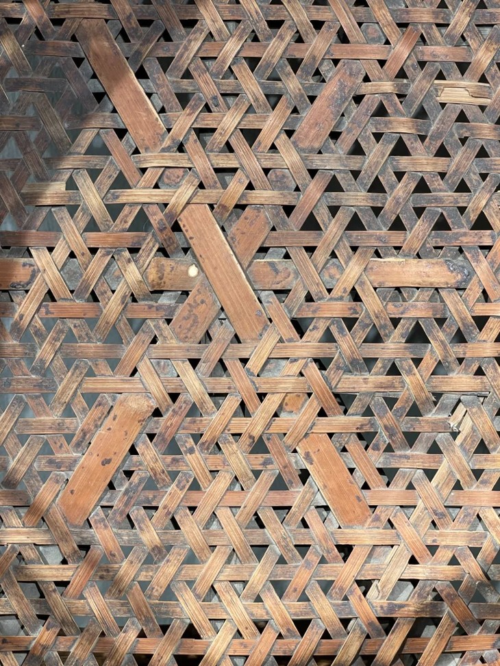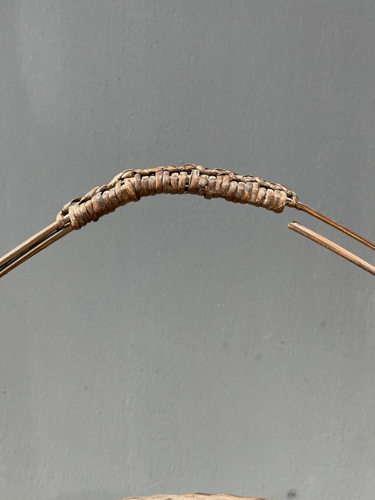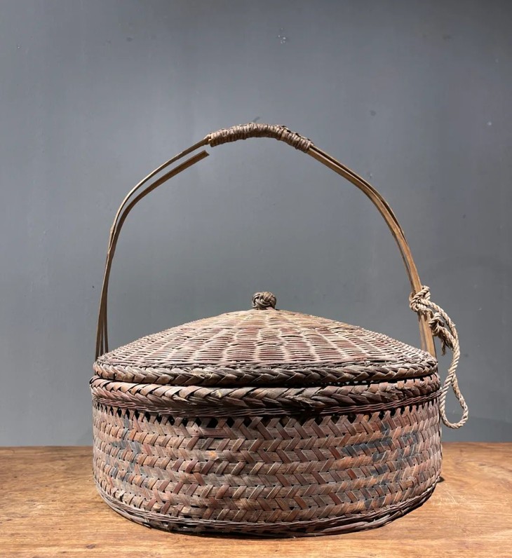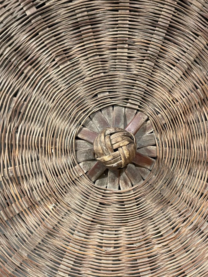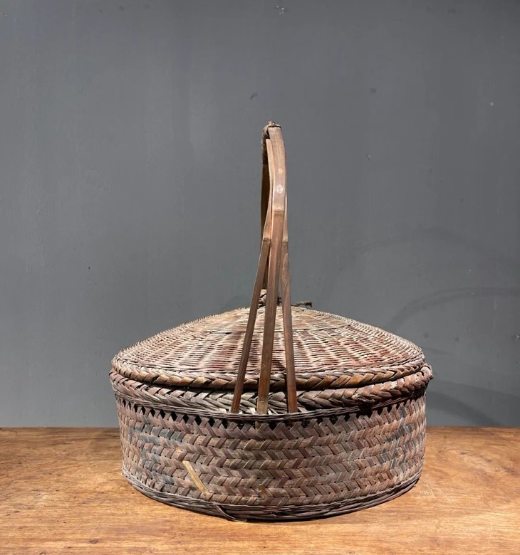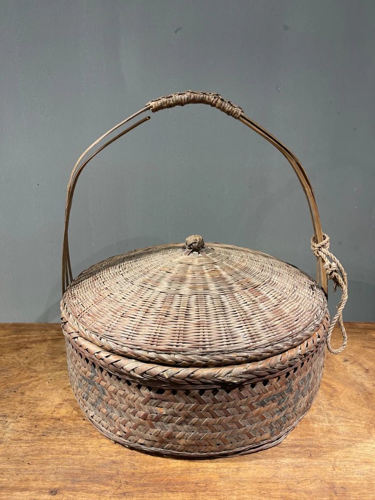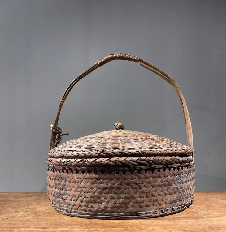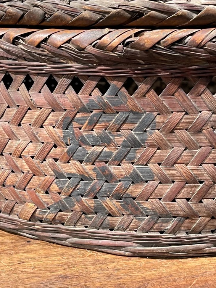 依这件竹编手提圆形大盖篮,如图所示,提把稍散落,可以缠竹篾或是线修复,除此以外,基本保存良好。