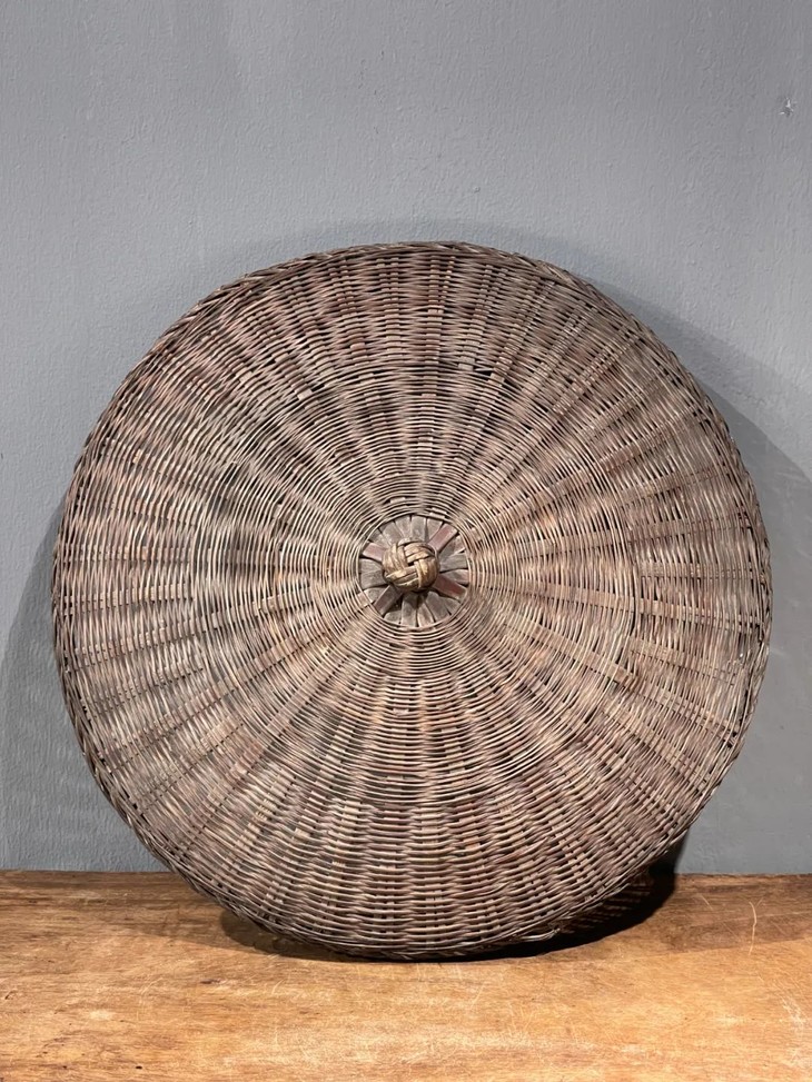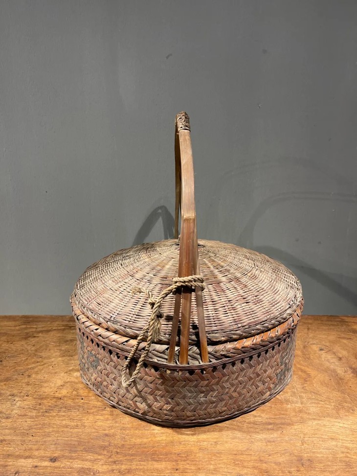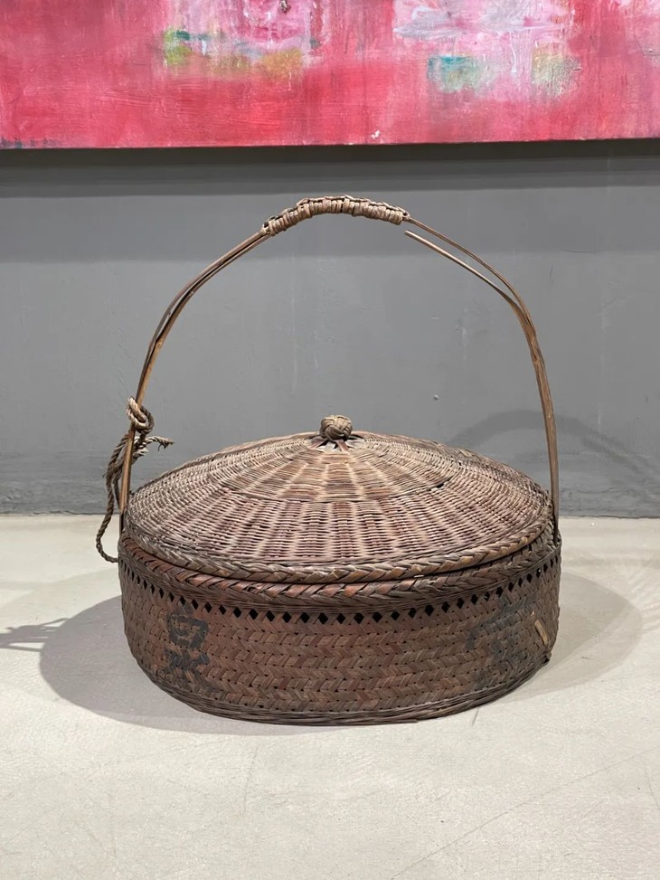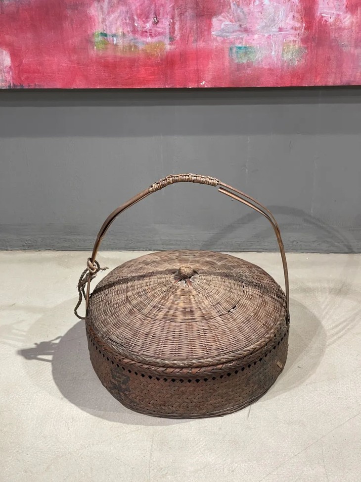 这是一件民国时期相较高端的竹编器物,由其使用的竹篾与精致的盖钮可知这件造型简约却制作精细的大提篮非同凡响,整体风格比例合谐美观,虽无装饰却处处充满精彩的细节,例如盖上的细腻滚边框、盖钮与提把缠绕的竹篾上等等都令人印象深刻。