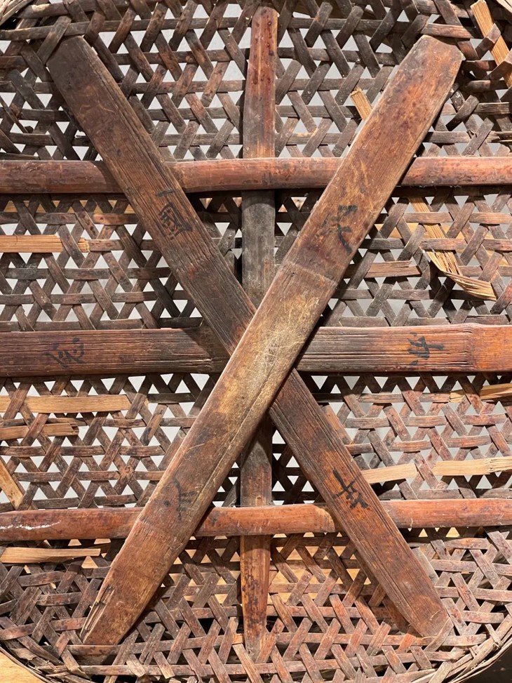 这是一件尺寸大、形式优雅的竹编手提圆形大盖篮,带圆弧顶盖的大圆盒上拱形提把,硬竹框架,编织精美,设计灵巧,整体造型古朴素雅,经年使用形成细腻温润之包浆皮壳,环绕圆盒外壁以墨书写商号名,底部书“民國二年念办”。是民国初年之高端竹编提篮,如今仍然保存大致完好,殊属难得。