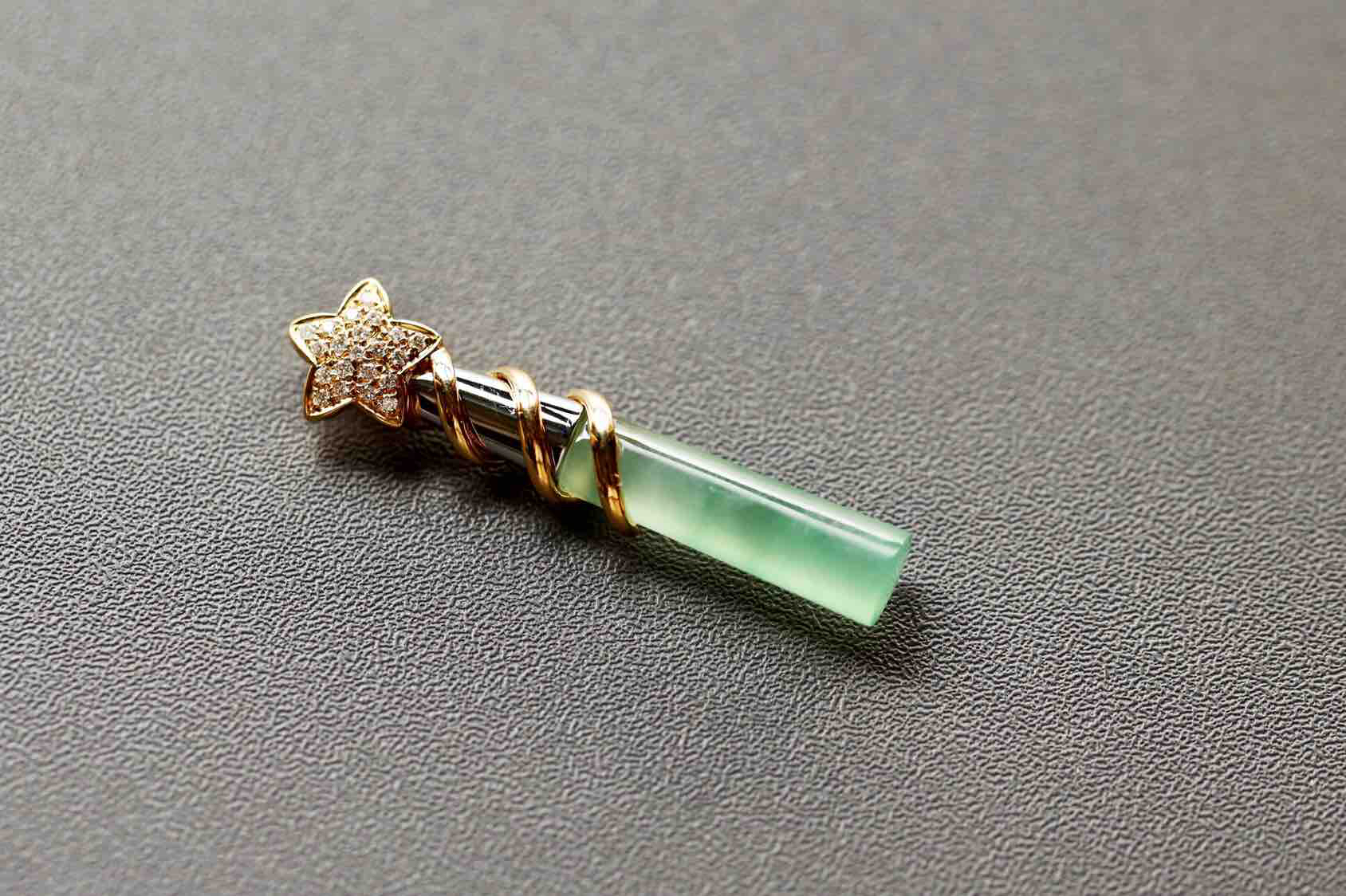 高冰种晴水飘绿花翡翠仙女棒魔法棒18k黄金钻石镶嵌,镶嵌后35.2×8.4×5.8mm,传说如果手中挥舞着魔法棒,你所有的愿望一定会实现。不会有比这更特别的翡翠吊坠了,高冰种晴水翡翠,晶莹剔透,荧光四射,一个真正的圆柱体形的翡翠,18k黄金钻石镶嵌,仙女棒中间裹着的是18k白金,这镶嵌工艺绝了,来自翡翠禄来原创设计,属于你的特别之物