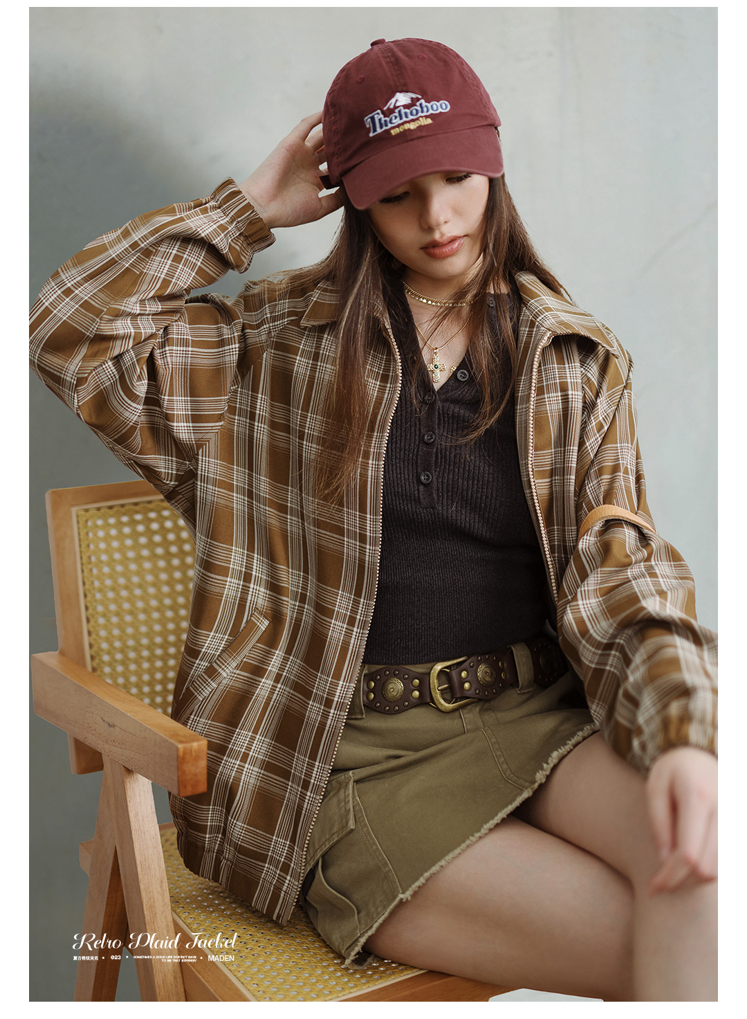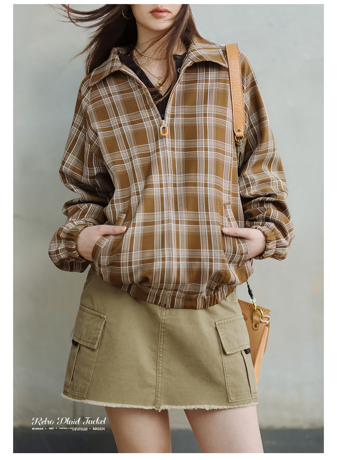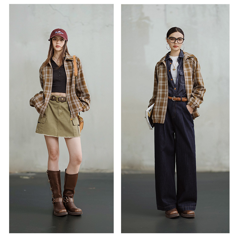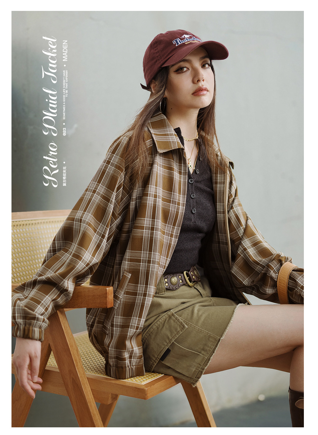 马登美式复古格纹夹克设计感撞色翻领外套休闲宽松百搭上衣春秋女