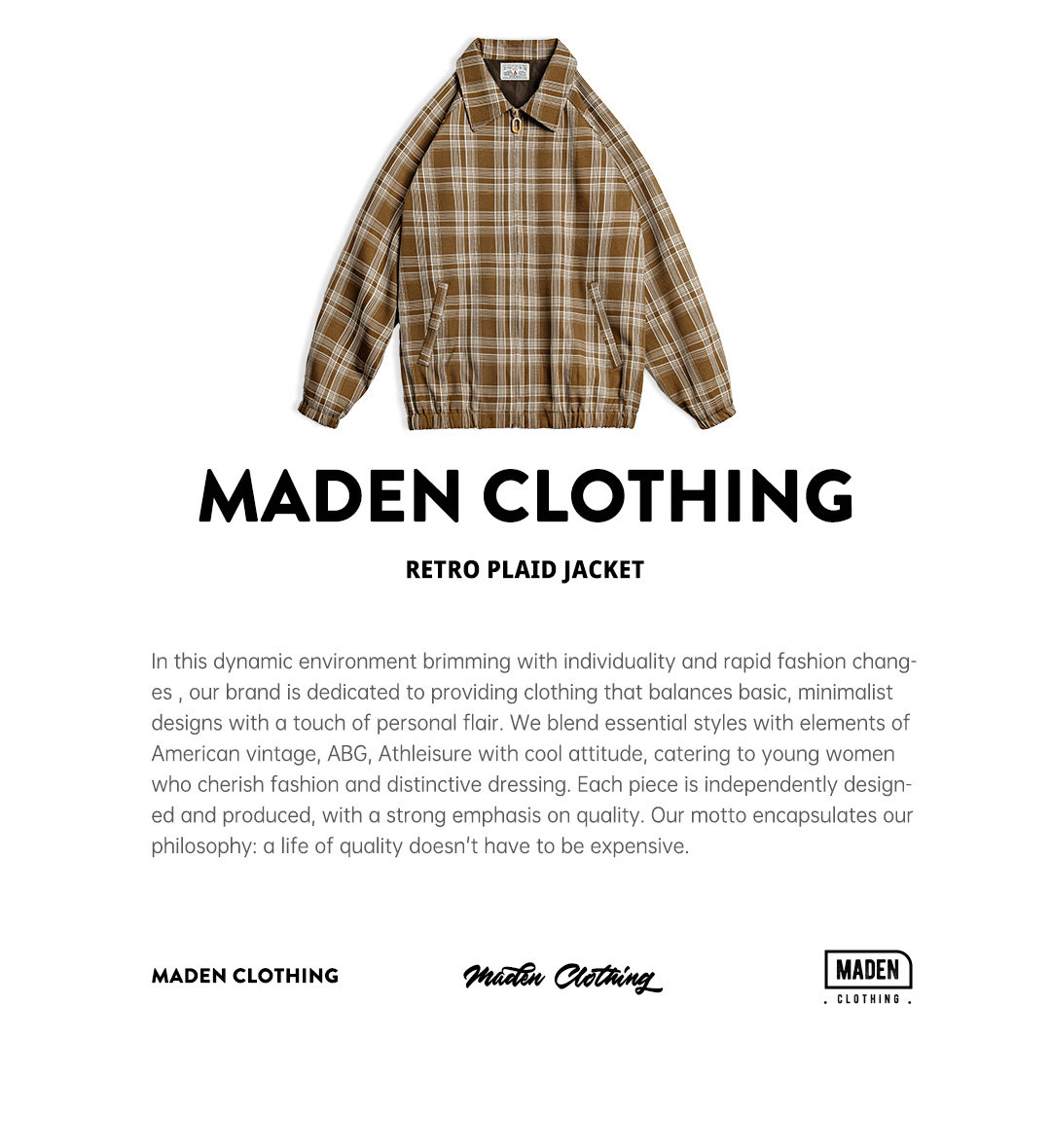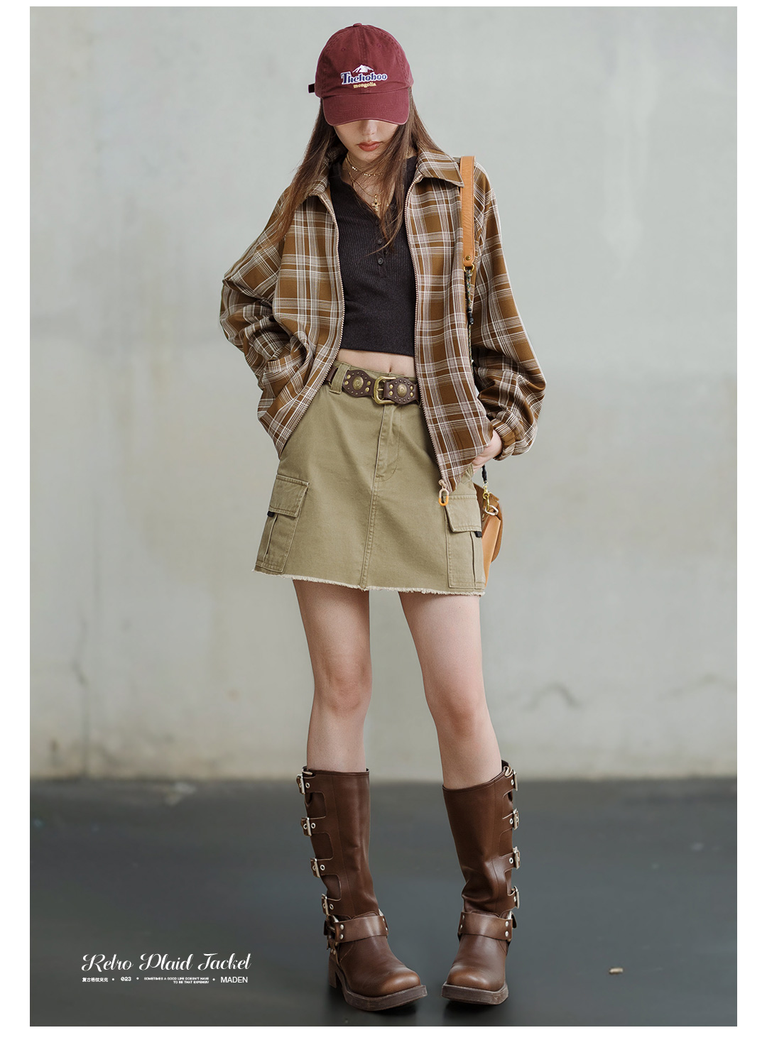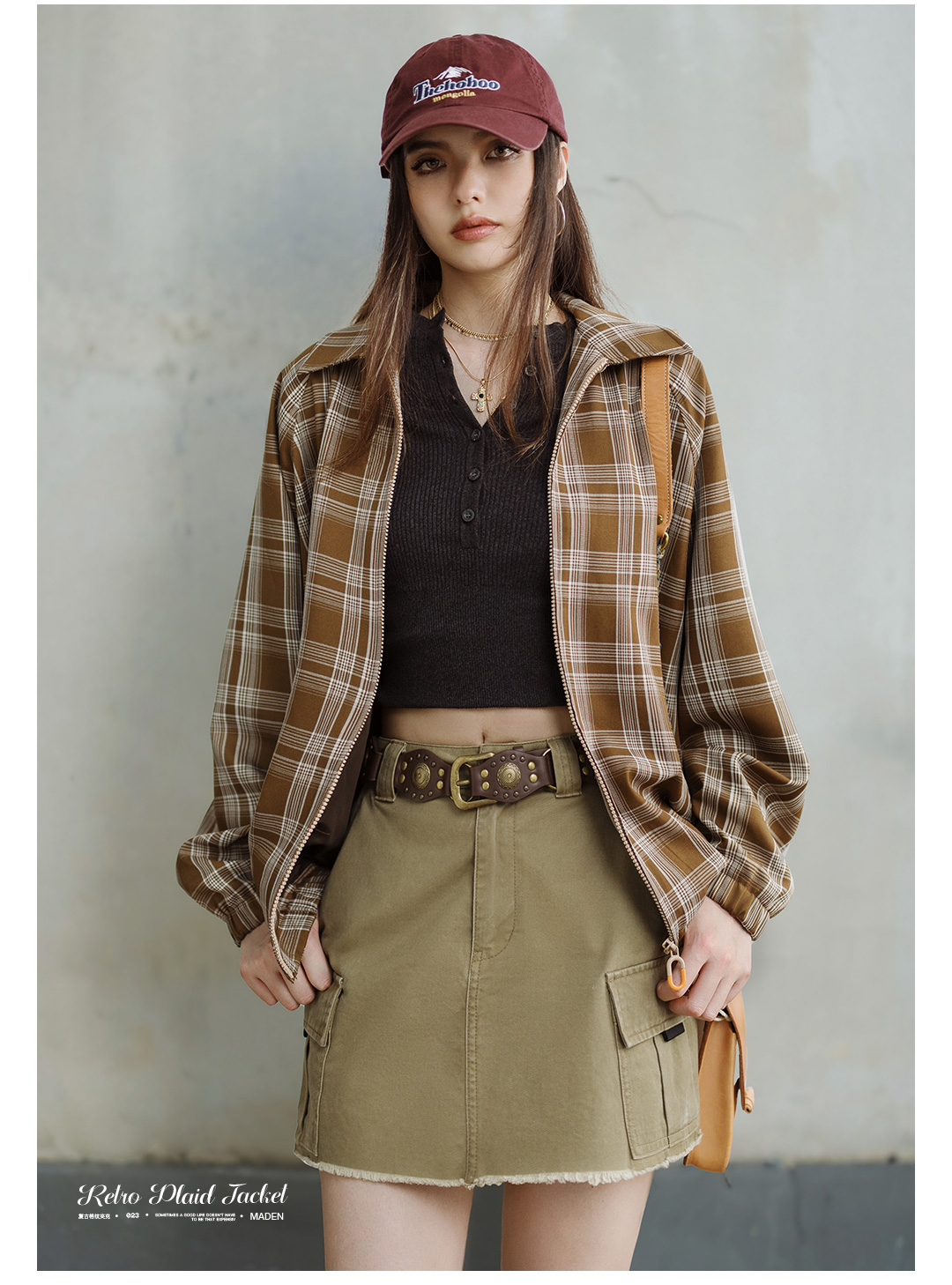 马登美式复古格纹夹克设计感撞色翻领外套休闲宽松百搭上衣春秋女