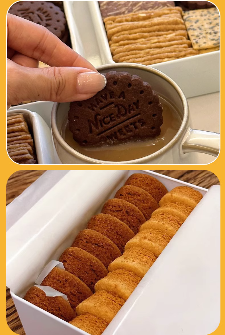 黄油奶香一打开就香住了,吃一口奶香突出, 入口酥酥与干脆之间,化口里像吃冰淇淋还有微 微咸香,一口气吃了好几块都不腻,蕾丝焦边好 看又好吃个头像个小蛋糕。一盒两个口味都有, 咖啡、原味不用纠结 ,2个味都好好吃。关键不 甜不腻!