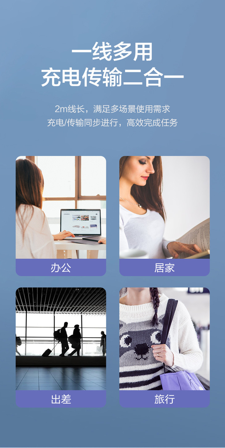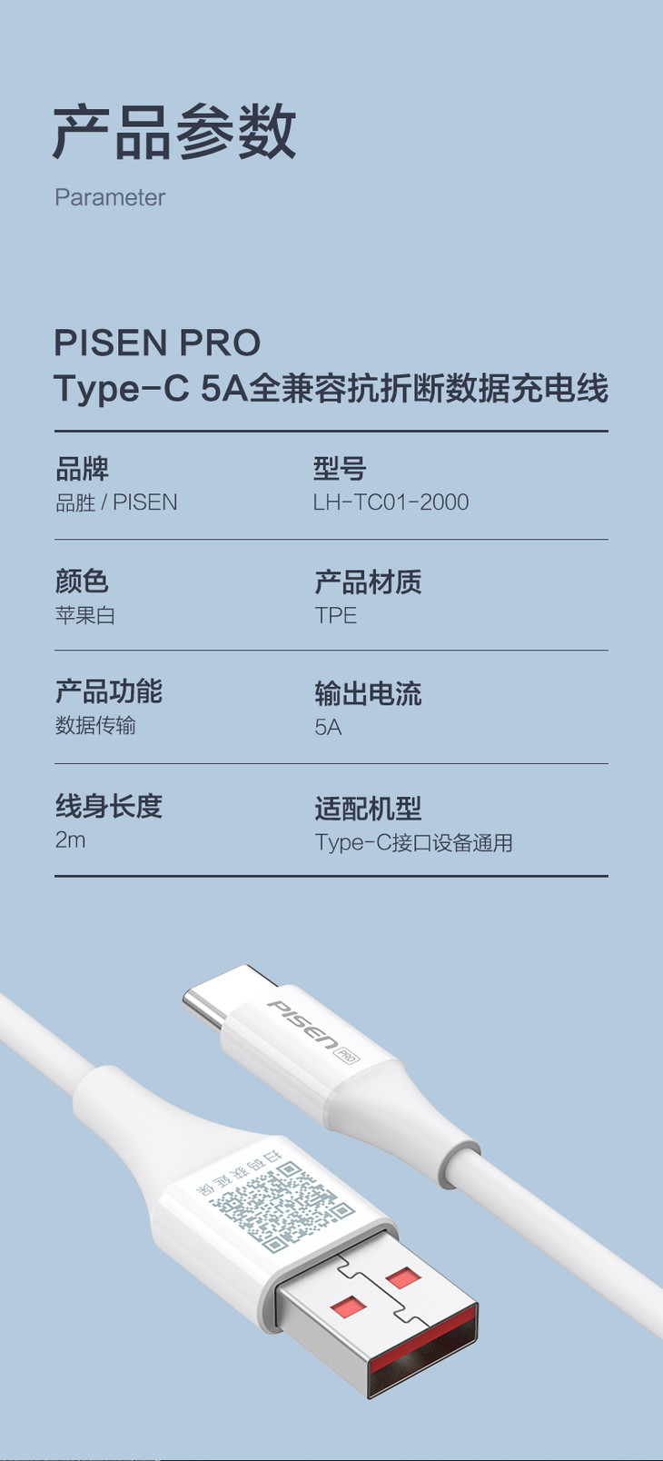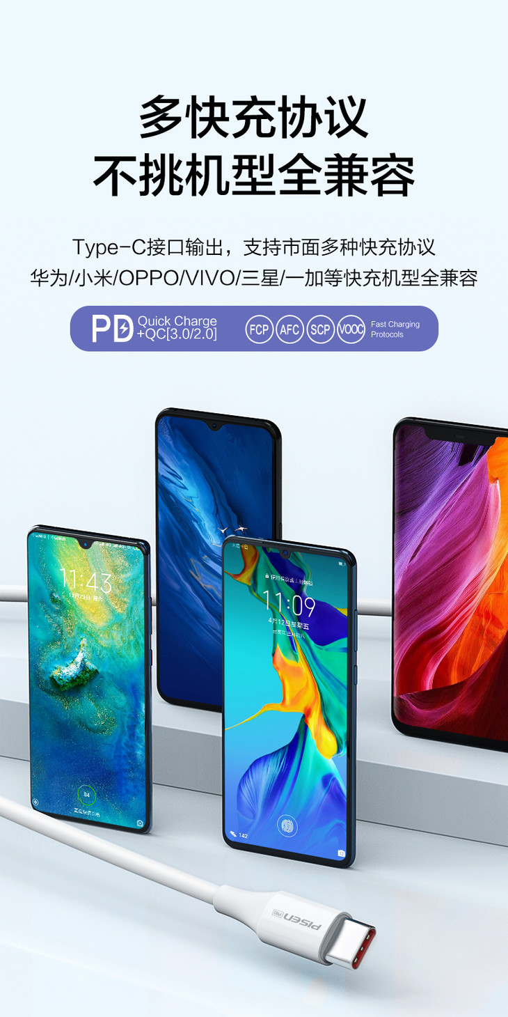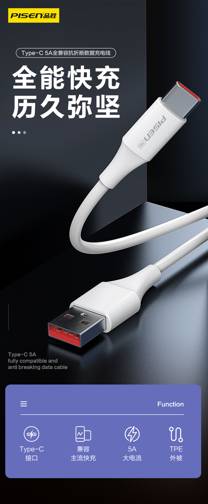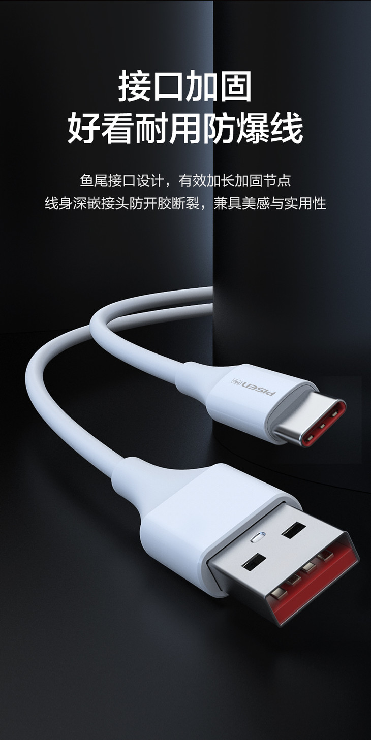 品胜 Type-C 5A全兼容抗折断数据线充电线2米 华为小米快充全兼容快充线