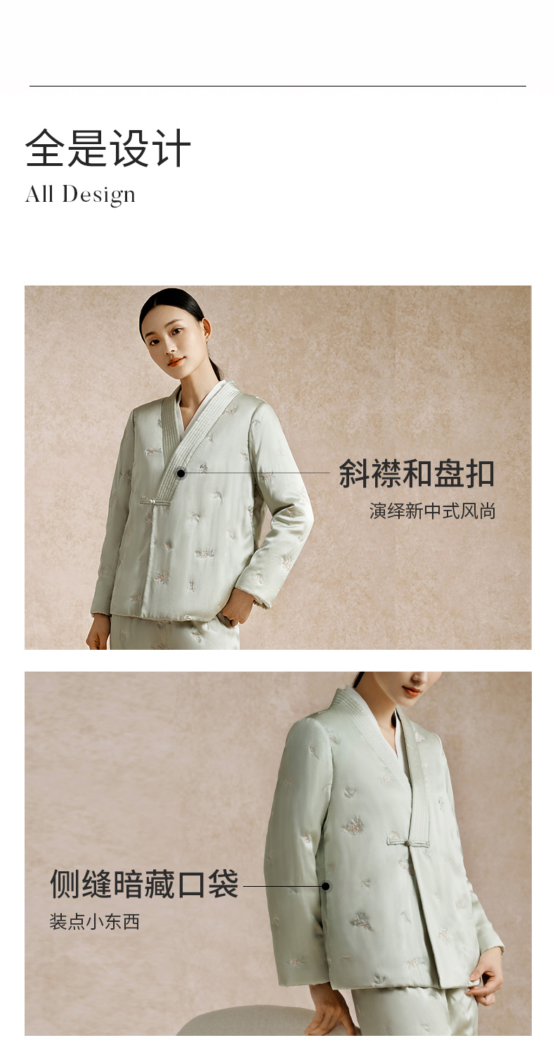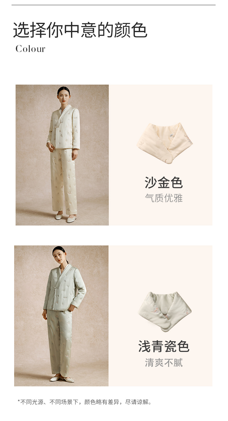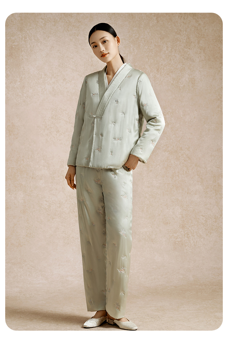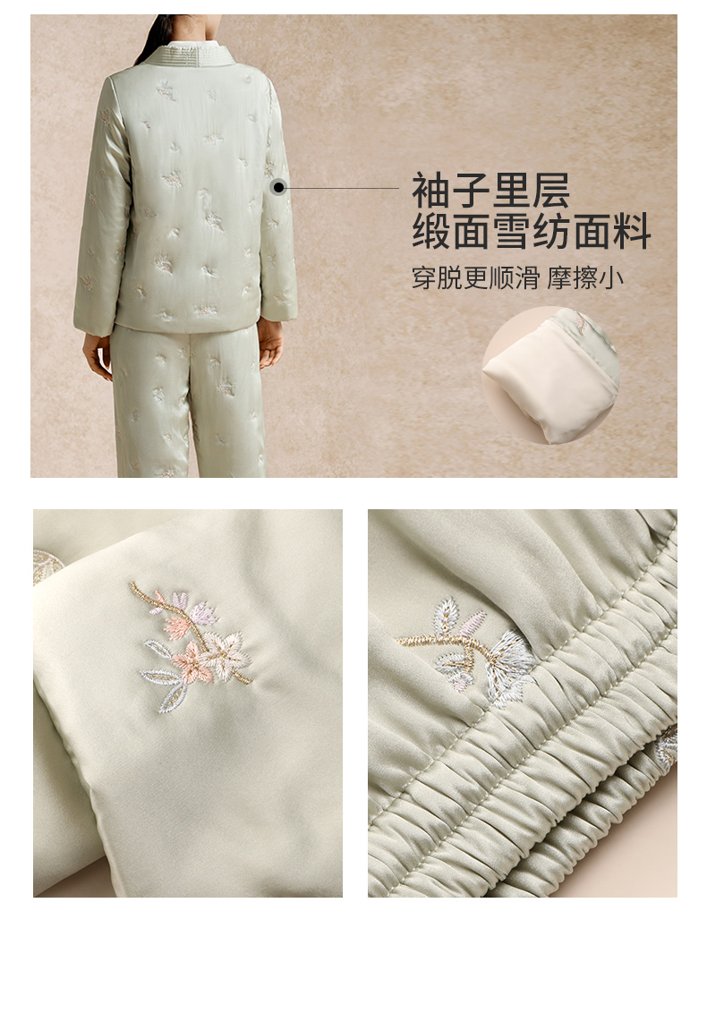 100%桑蚕丝夹棉衣裤套新中式保暖睡衣女真丝缎面长袖家居服金三塔 YSFED201
