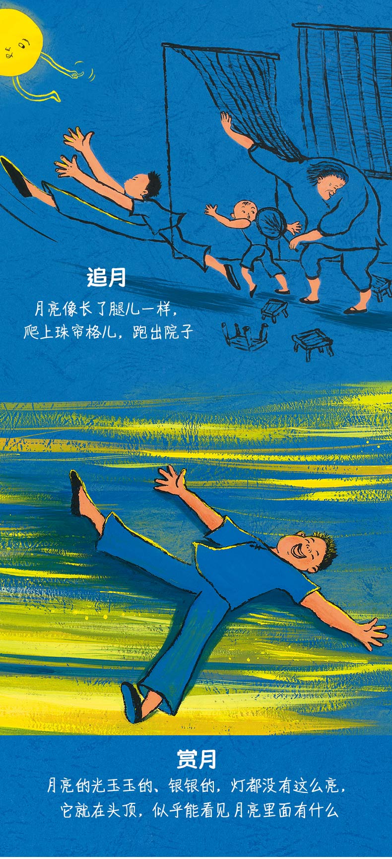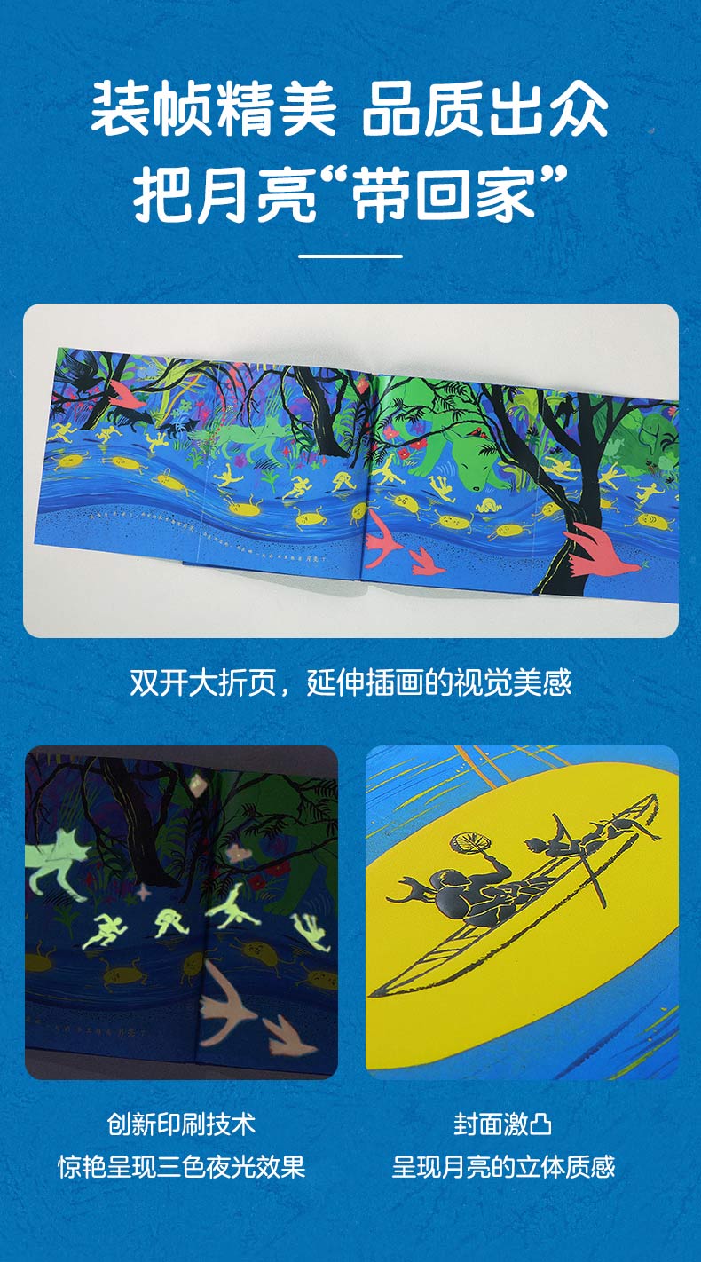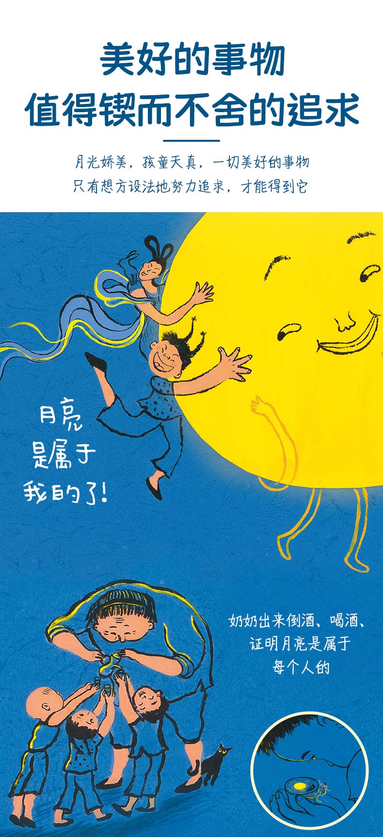 对尚且年幼、涉世未深的孩子来说,中秋节最大的诱惑莫过于吃月饼和玩游戏。在中秋节;欣赏自然美景、期盼亲人团圆的意义,对孩子来说并不是一个特别清晰的情感概念。《月迹》这本书,则以绘本的形式,记录下三个小孩在中秋节的夜里如何追寻月亮,欣赏月亮,为月亮的美所感动的故事。故事选取;我一个七八岁的小男孩作为第一视角来讲述中秋夜里我们的所见所闻。无论是听奶奶讲故事,还是盼月亮,寻月亮,对月亮产生无限遐想的过程,都无一不透露出一个孩子对月亮的认识、理解和喜爱。通过这样一个以孩子为主角的故事,让每一位读到这本绘本的小读者都能与主角一起进入中秋之夜,切身地感受到月亮的美,自然万物之美,从而激发对万事万物的怜惜之情,对未来人生的无限向往。