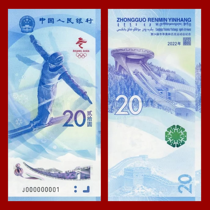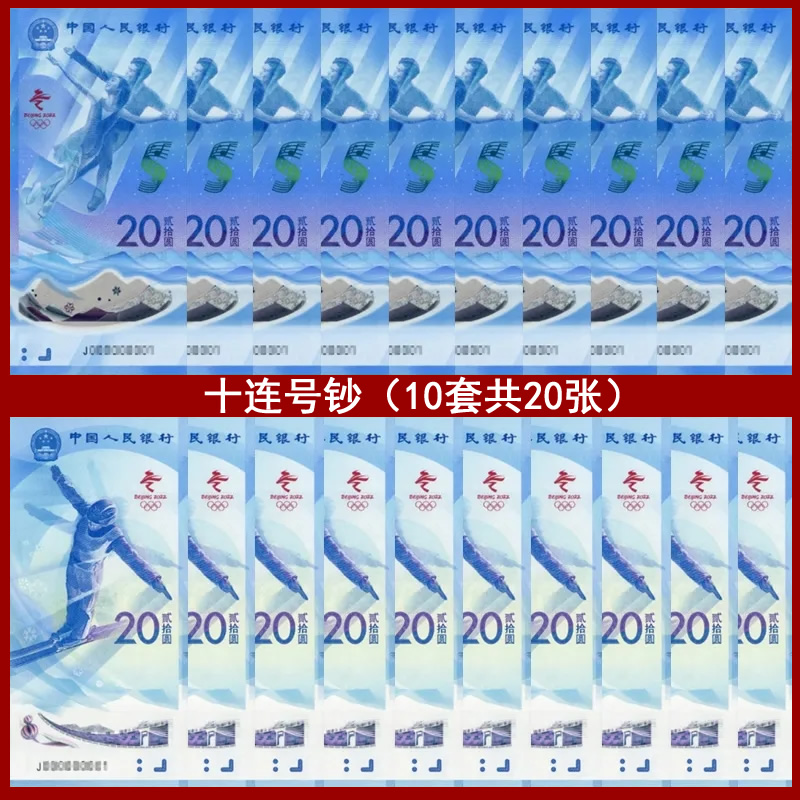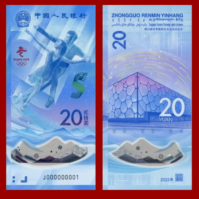 这是中国人民银行发行的首套对钞、首张面值20元的纪念钞,其中,冰上运动为塑料钞,雪上运动为纸钞。