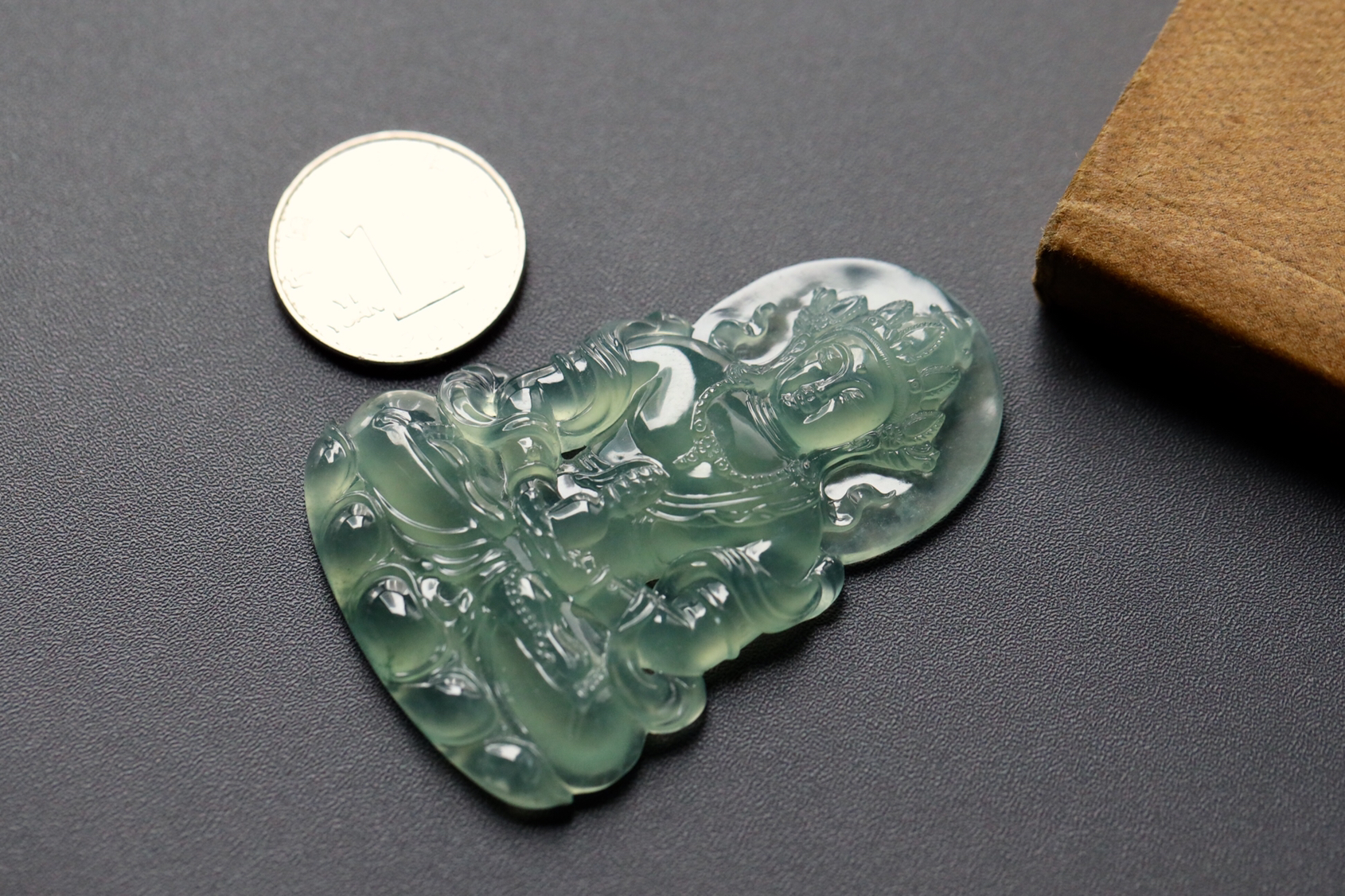 高冰种晴水绿翡翠度母,尺寸特别大气,刚刚做出来的,实在太美了,高冰种晴水,大师工,看细节有多美。杜母是观音菩萨的化身,是慈悲的象征。可以带来美貌、财富和家庭和谐。尺寸67.4×45.1×7.5mm