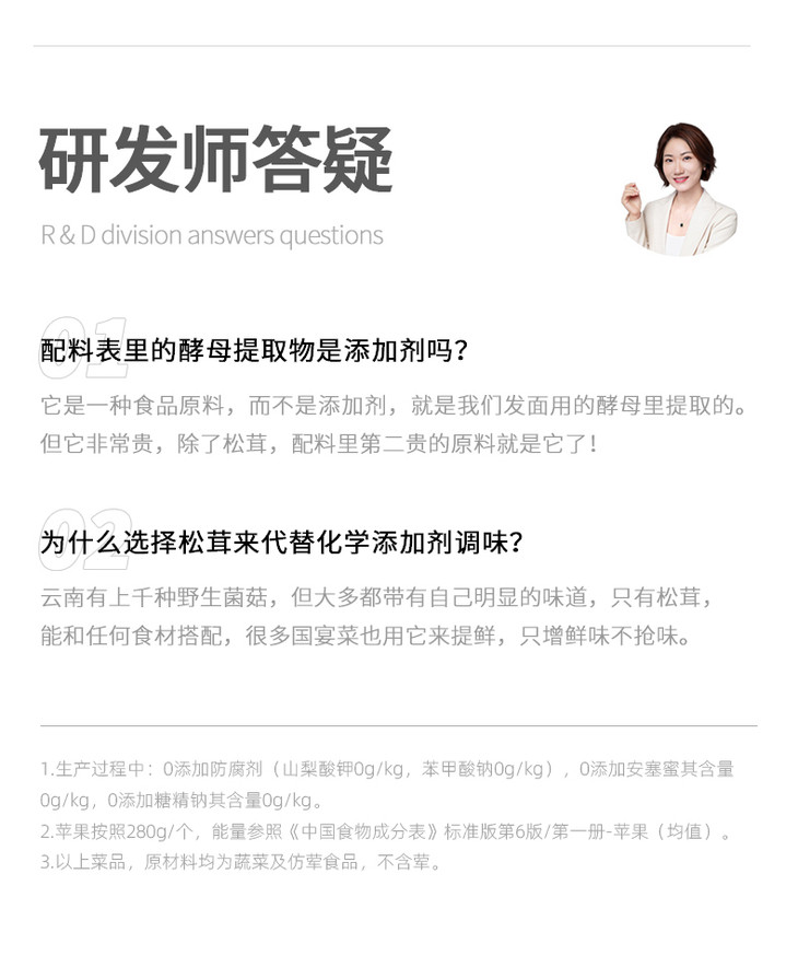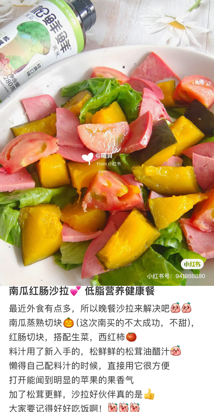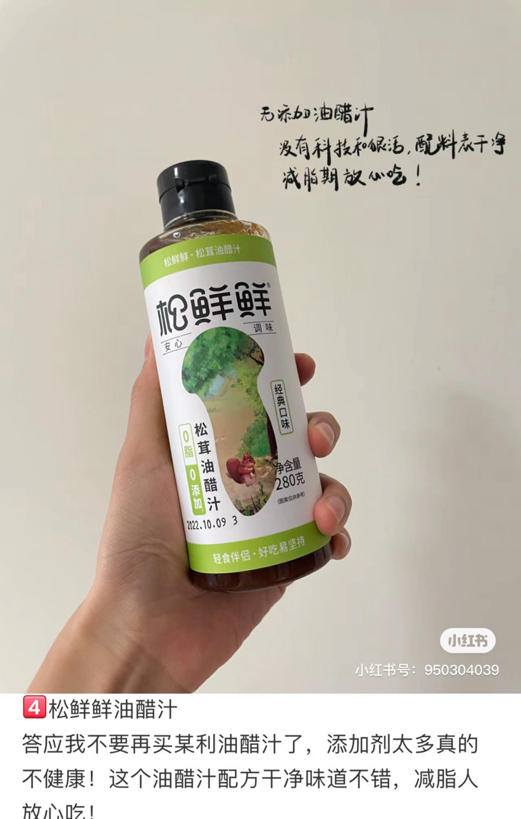 松鲜鲜的松茸油醋汁,甄选来自香格里拉的新鲜松茸、苹果等代替普通调味品里的提鲜添加剂,既满足了我们对鲜味的追求,又兼顾了健康。配料表更是干净,坚持不添加防腐剂、增味剂、着色剂等有害物质,让我们在享受美食的同时,也能更安心!为了让我们减脂人不再小心翼翼,更是用0卡糖代替蔗糖,一瓶油醋汁的热量小于一个苹果,真的不用拿小量杯了,大胆倒!