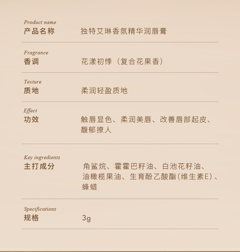 9楼母婴生活馆 独特艾琳香氛精华润唇膏保湿补水防干淡化唇纹口红打底唇膜3ml 吊牌价:89元 活动价:59元