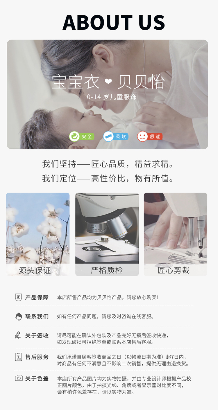 - 贝贝怡专注0-6岁婴幼儿服饰,坚持安全、柔软、舒适的产品理念,为千万中国家庭提供超高品质、安全可靠的婴幼儿服饰产品,妈妈放心,宝宝开心!