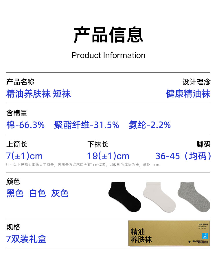 【品名】【真正的新疆棉袜】花里家旗下巧趣猫男女同款精油袜 七双装 【规格】 短袜:黑色、白色、灰色 中筒袜四季款:黑色、白色、灰色 中筒袜升级款:黑色、白色、灰色、红色 【产地】国内 【材质】棉66.3% 聚酯纤维31.5% 氨纶2.2% 【发货包装】独立包装 【发货地】杭州 【发货快递】中通、申通随机发 【补邮费地区】新疆、西藏、青海+15元 【发货时效】48-72小时,周末节假日顺延 【温馨提示】备孕、孕妇、精油过敏体质不宜使用!!! |