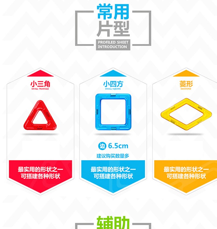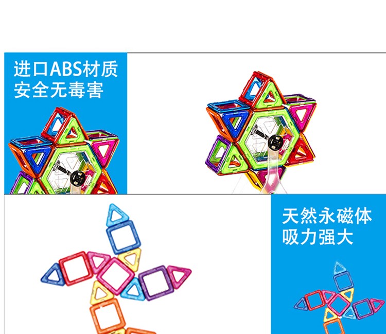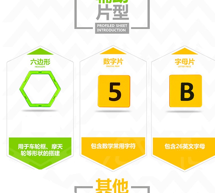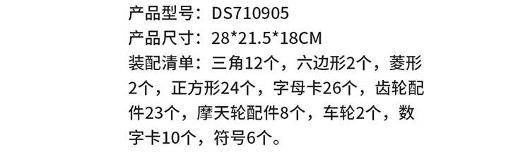 内配:三角12个,六边形2个,菱形2个,正方形24个,字母卡26个,齿轮配件23个,车轮2个,数字卡10个,符号6 个。