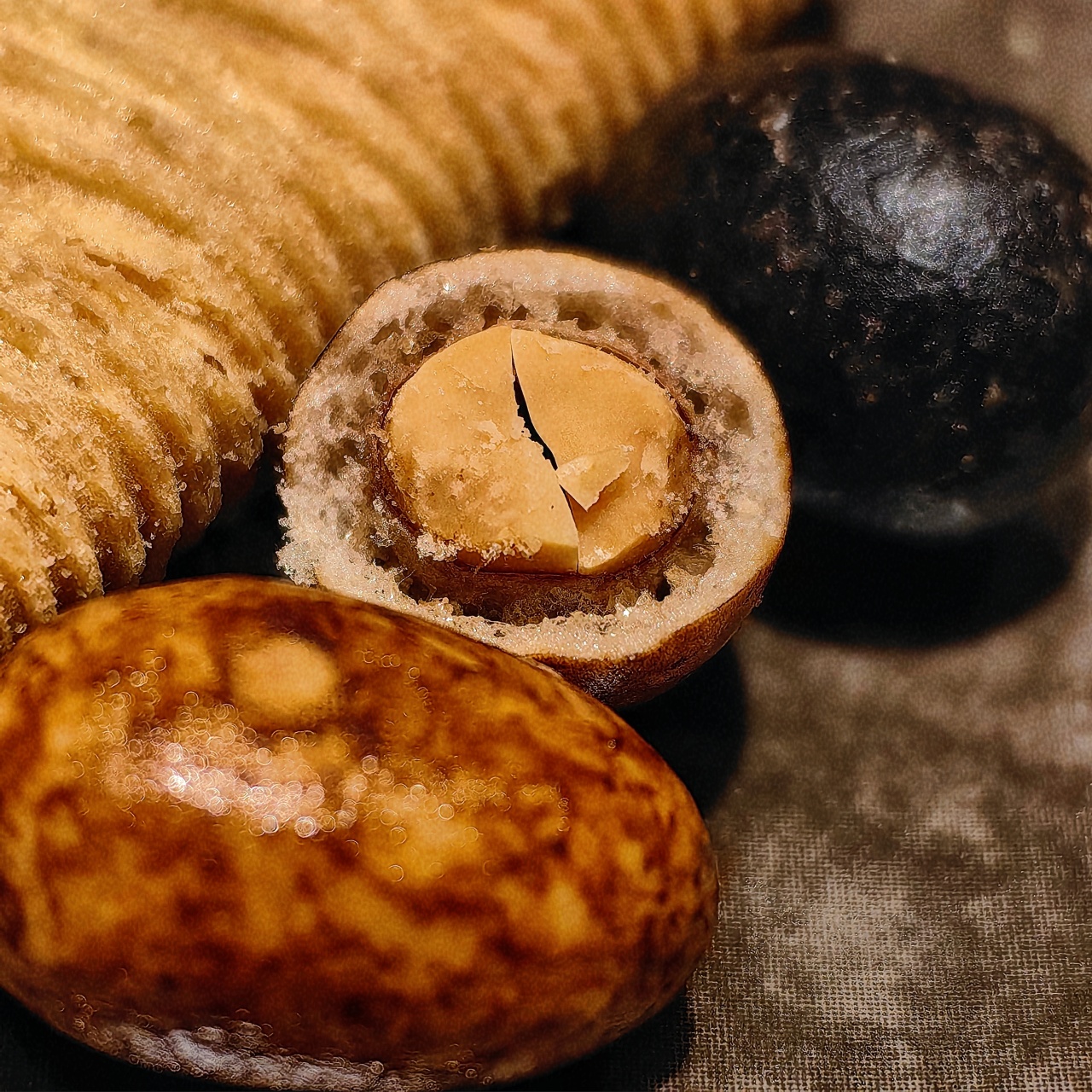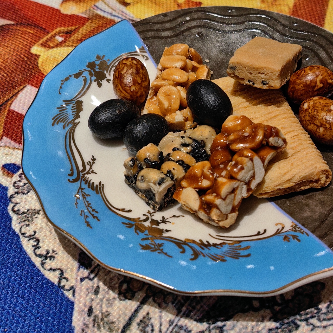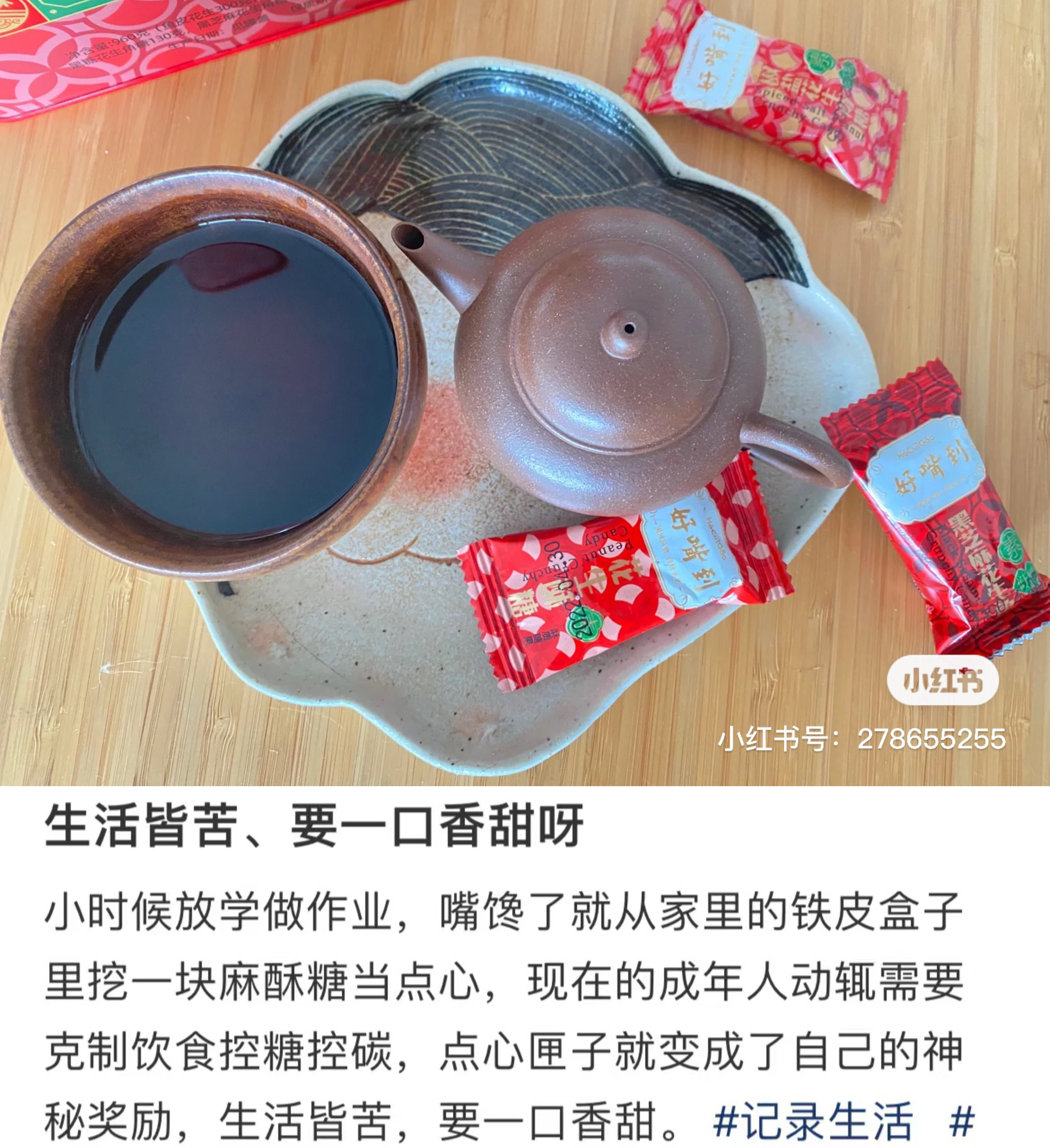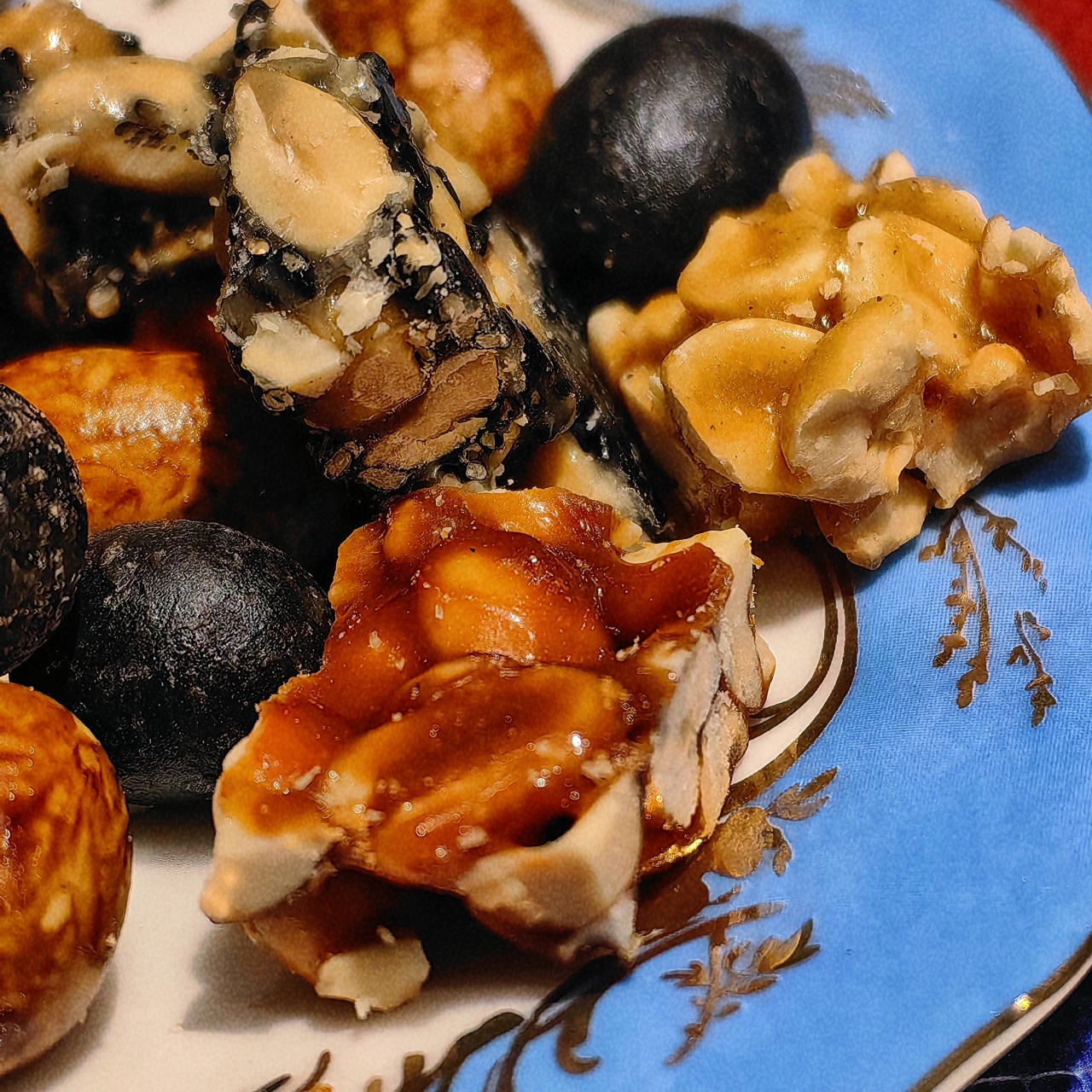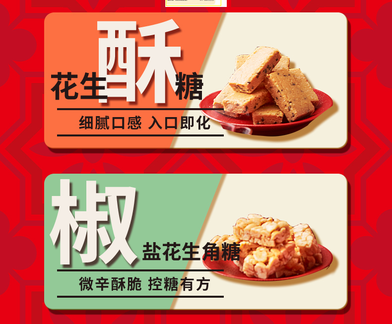 花生角糖,包括椒盐花生角糖 、黑芝麻花生角糖、黑糖花生角糖 。椒盐角糖前味儿略甜,后味儿泛出浅浅的咸,酥脆爽口;芝麻花生角糖,黑芝麻多到爆,越嚼越香;黑糖花生角糖则用手工炒制的黑糖,为花生裹上一层更馥郁的香甜和迷人的琥珀色,把对食物的诚意都写进了时间和色泽里。每咬一口,清脆的声响敲碎花生的油脂香,回味无穷!