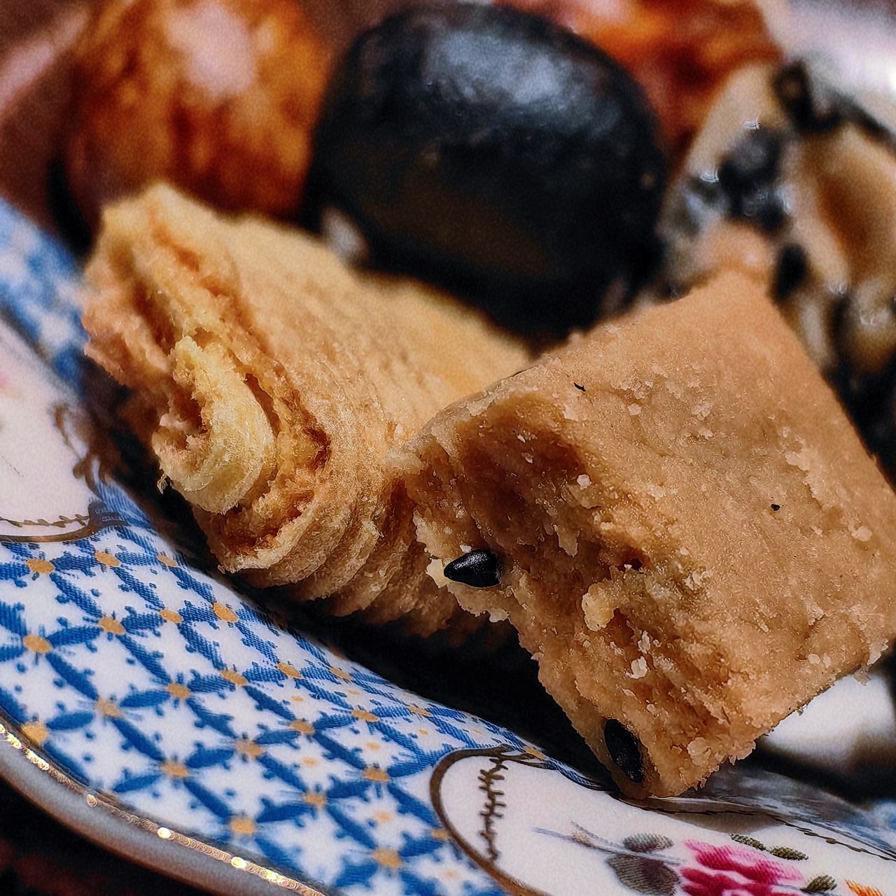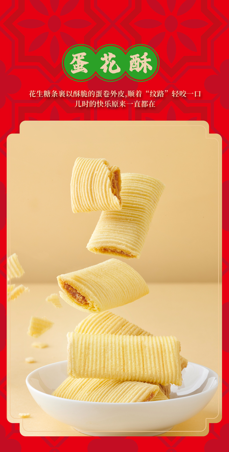 蛋花酥,内馅由老师傅精心调制,在传统馅料的基础上,加入咸蛋黄炒糖,达到咸甜交织的黄金平衡点。糖馅酥松、不粘牙,咸香惹味,与香脆的蛋卷外衣谱出最美妙的交响曲,吃货只要一口就能懂它的用心,一口咬下,酥皮在嘴里炸开了花,随后花生糖馅的香甜迅速在舌尖攻城略地。就是藏在童年记忆里的那口香、脆、甜。