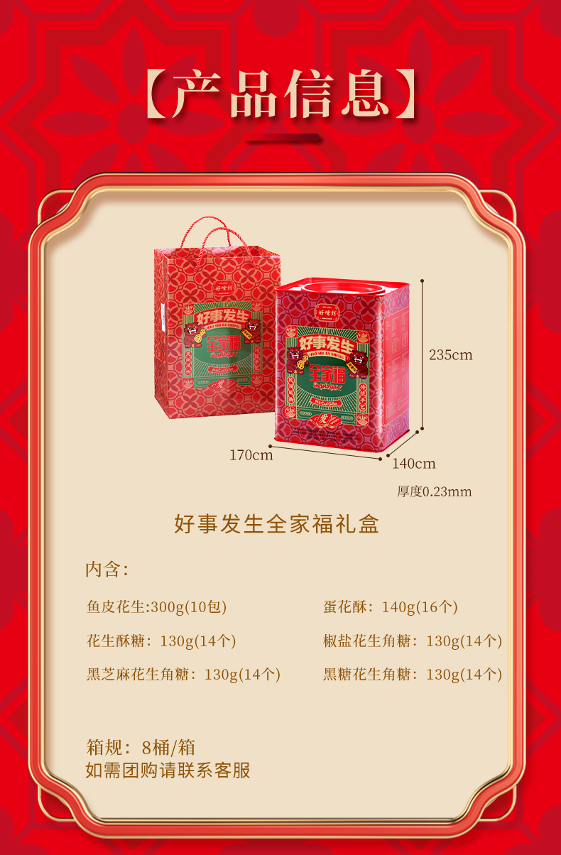 全家福是有大铁桶的哦!里面包括:鱼皮花生 300g(10包) 、蛋花酥 140g(16个)、 花生酥糖 130g(14个)、 椒盐花生角糖 130g(14个) 、黑芝麻花生角糖 130g(14个)、 黑糖花生角糖 130g(14个),好大一堆!