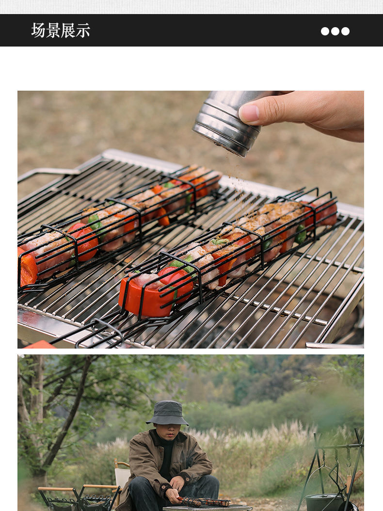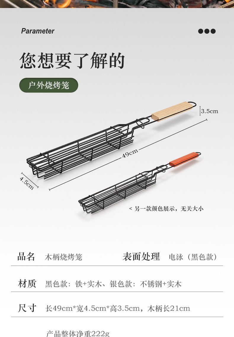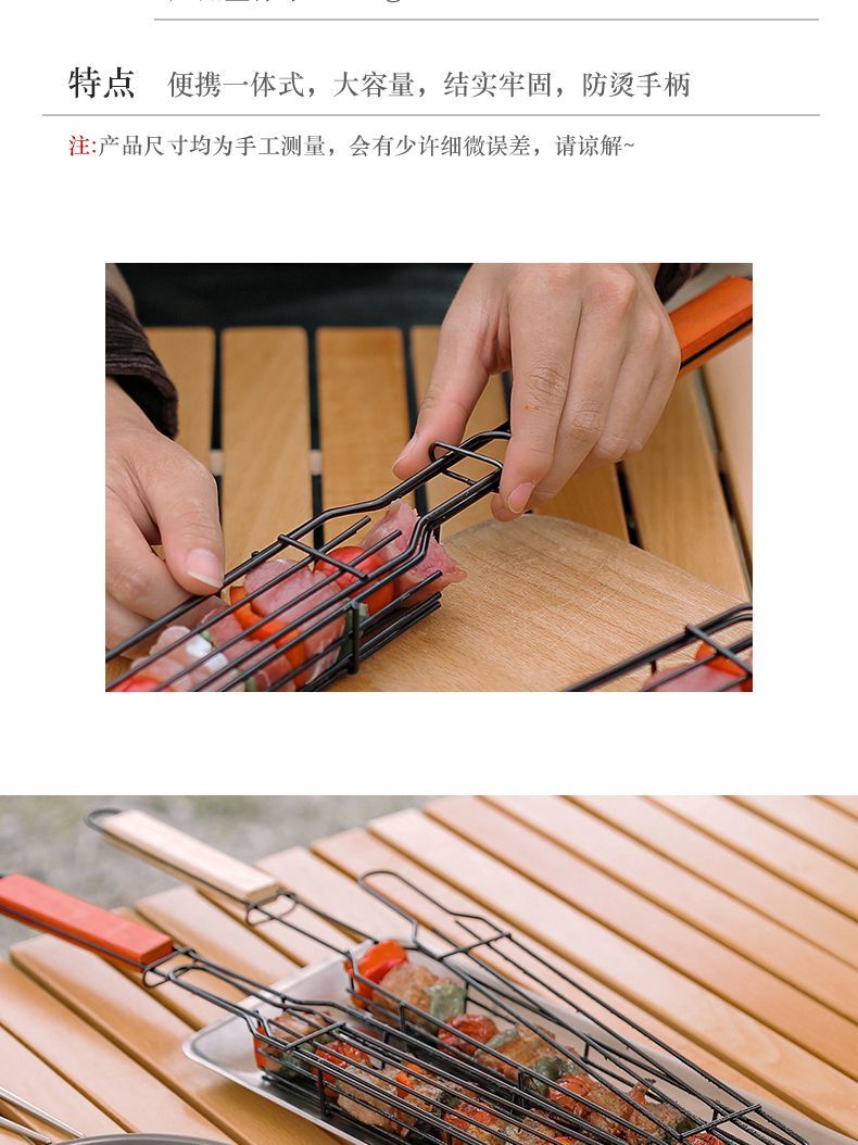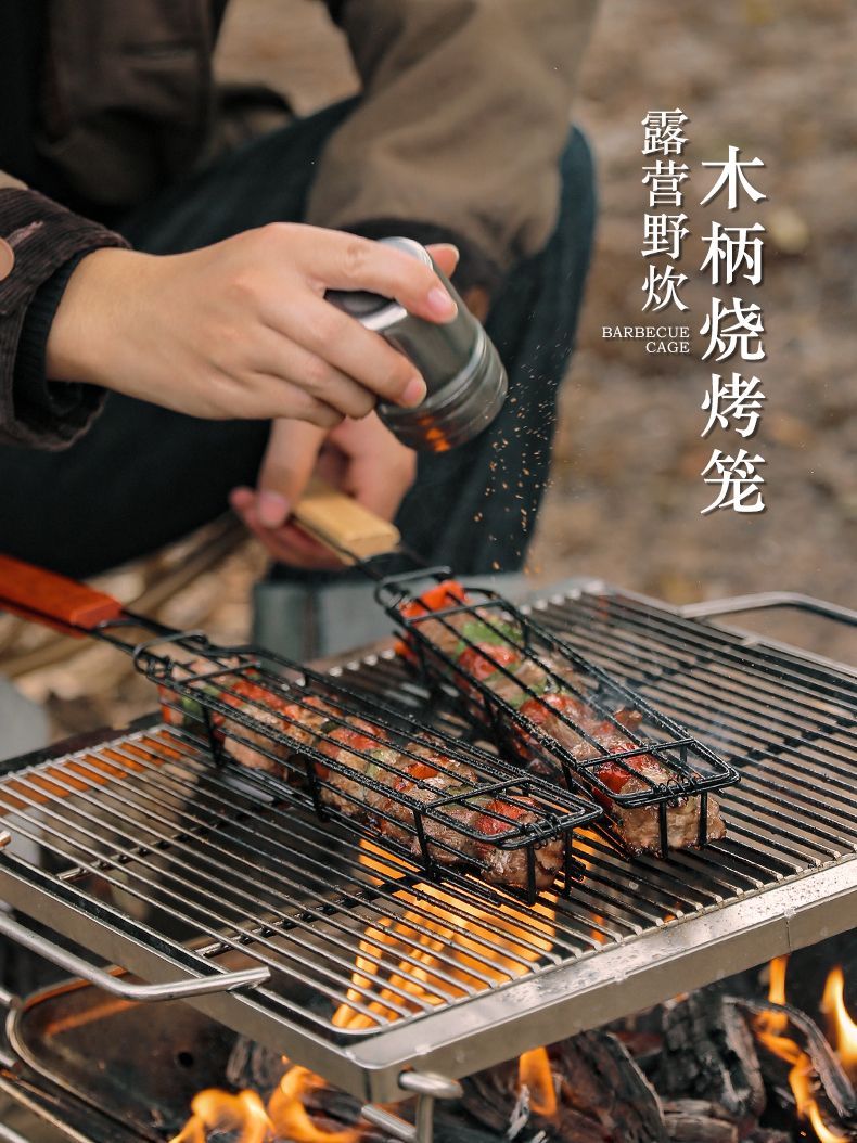 户外木柄烧烤笼露营肉类蔬菜烧烤网架野餐BBQ烤肉工具炭烤香肠签