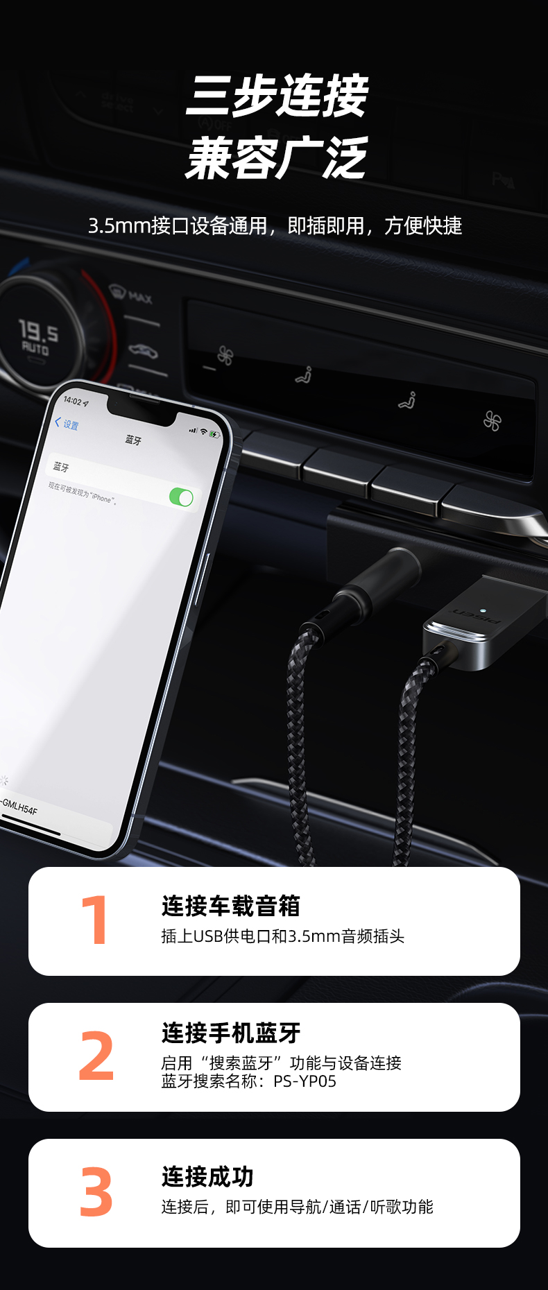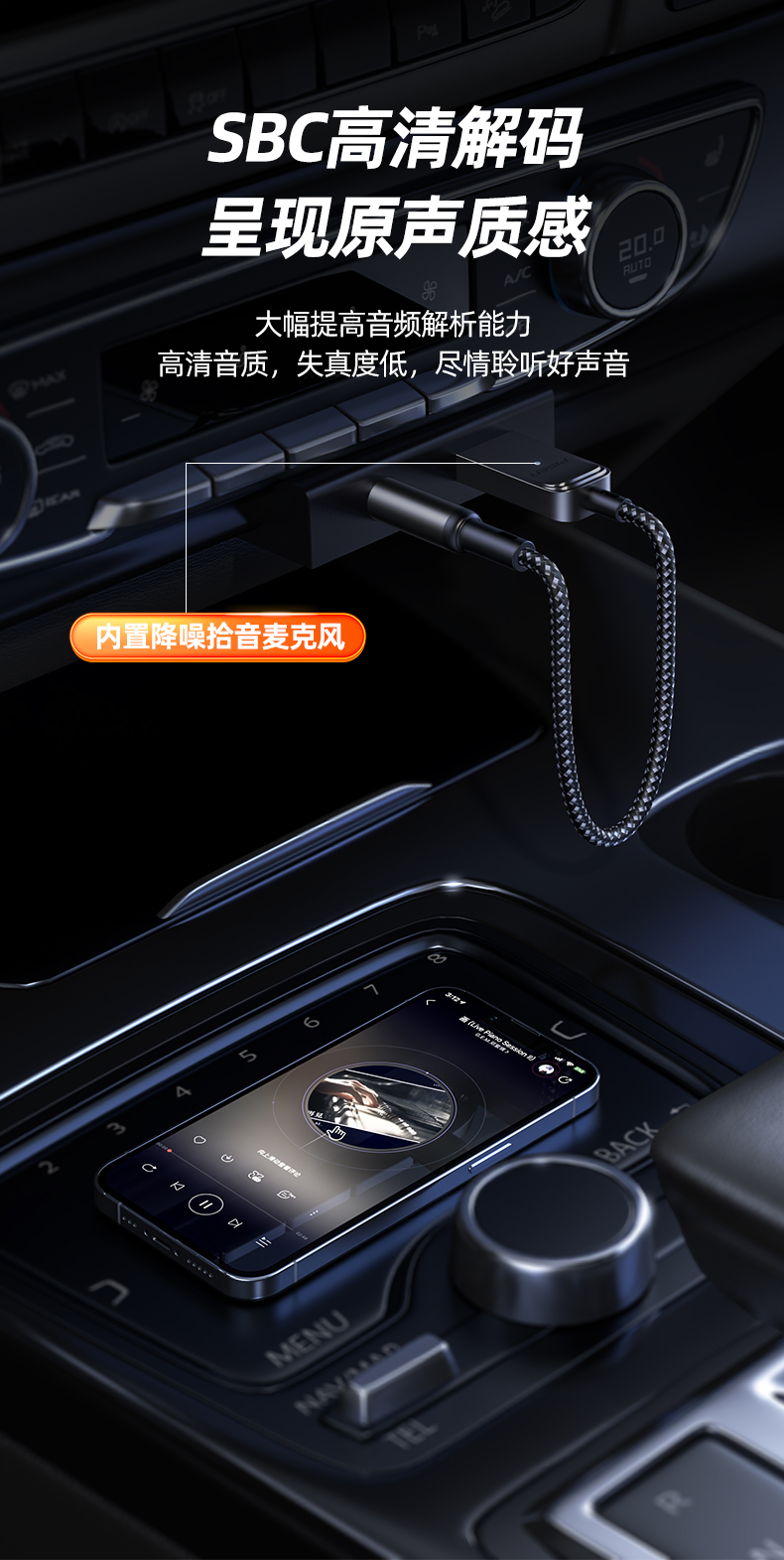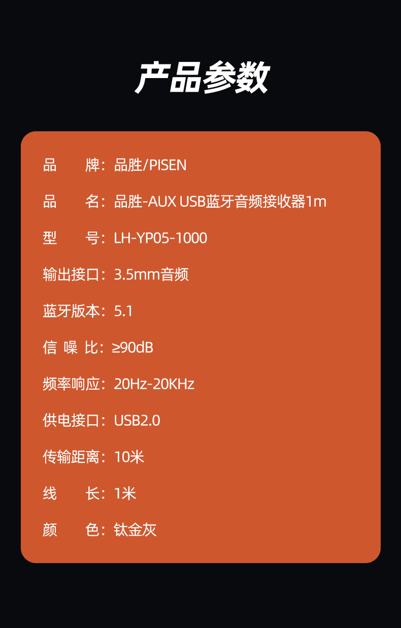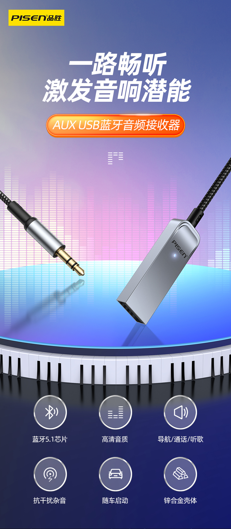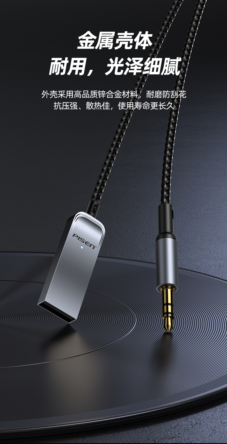 品胜 AUX转USB蓝牙音频接收器1m音频转接线 适配器车载免提通话3.5mm普通音箱转无线蓝牙音响