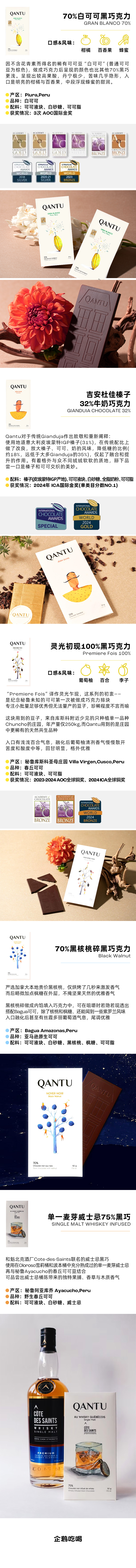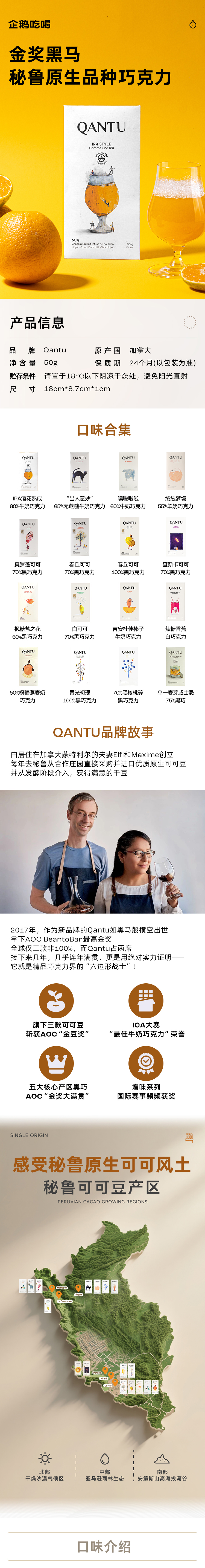 企鹅市集|加拿大Qantu坎涂金奖巧克力50g 增味奶巧/无糖奶巧/羊奶巧克力/黑巧克力可选