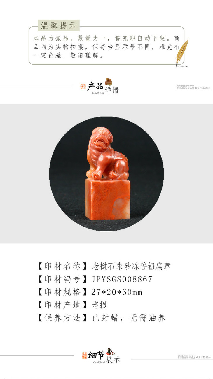 金石印坊 老挝石朱砂冻兽钮扁章 27*20*60mm JPYSGS008867