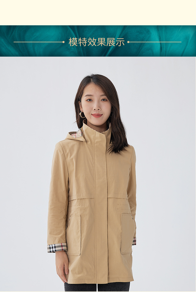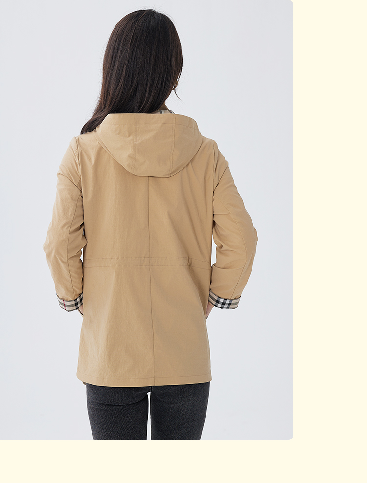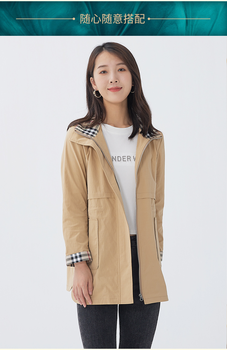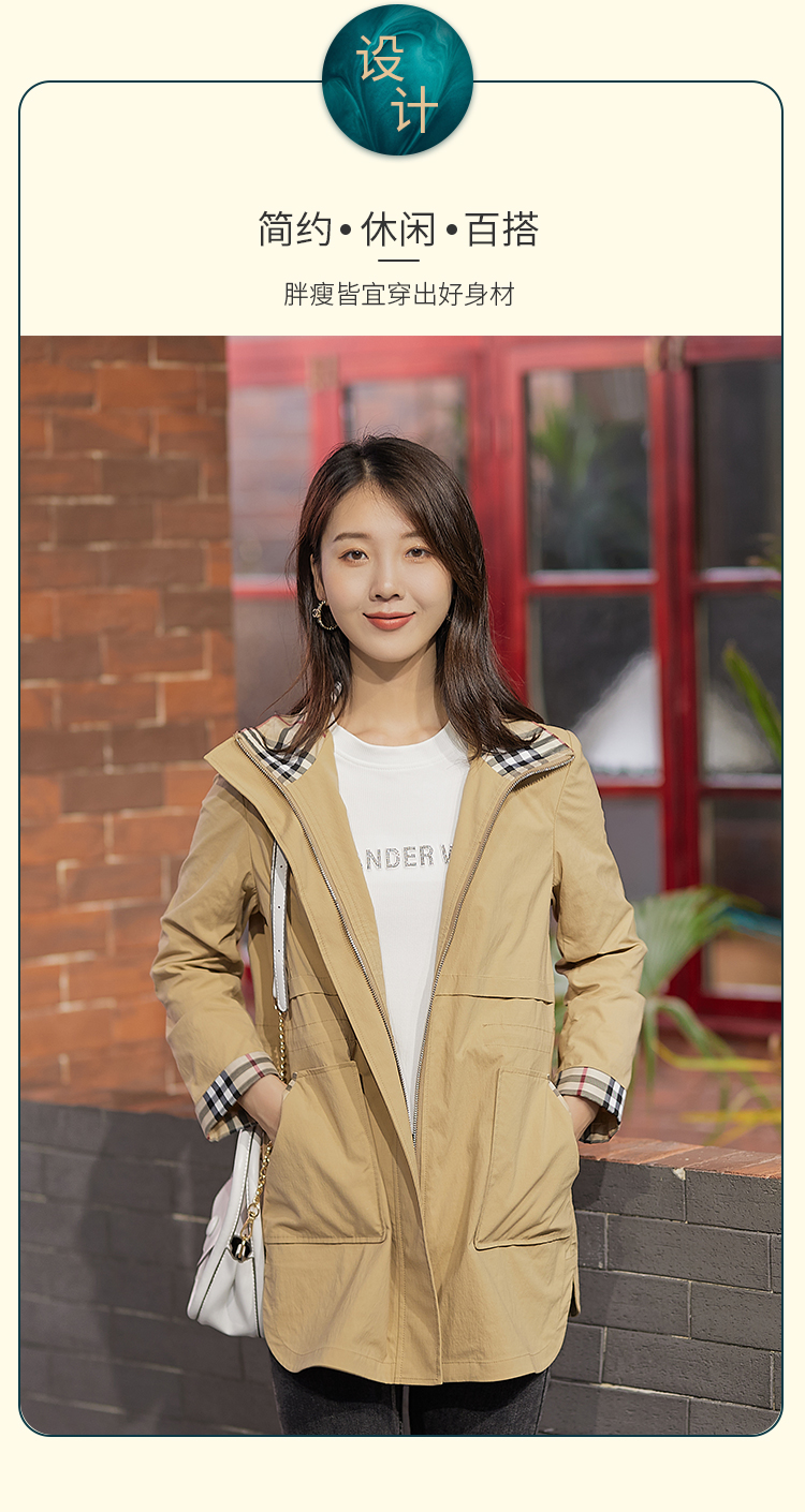 【舒适休闲,简单时髦】慕云姿2021秋季新款英伦经典格子连帽休闲风衣