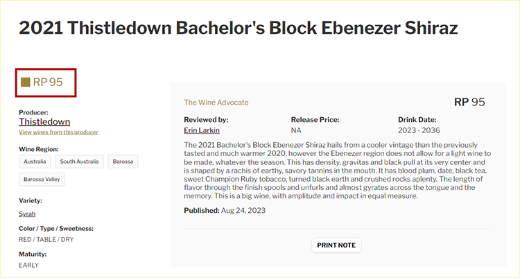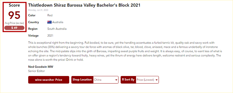 澳洲红五星名庄!3个95分单一西拉!紫绒单身汉社区西拉 Thistledown Bachelor’s Block Shiraz 2021