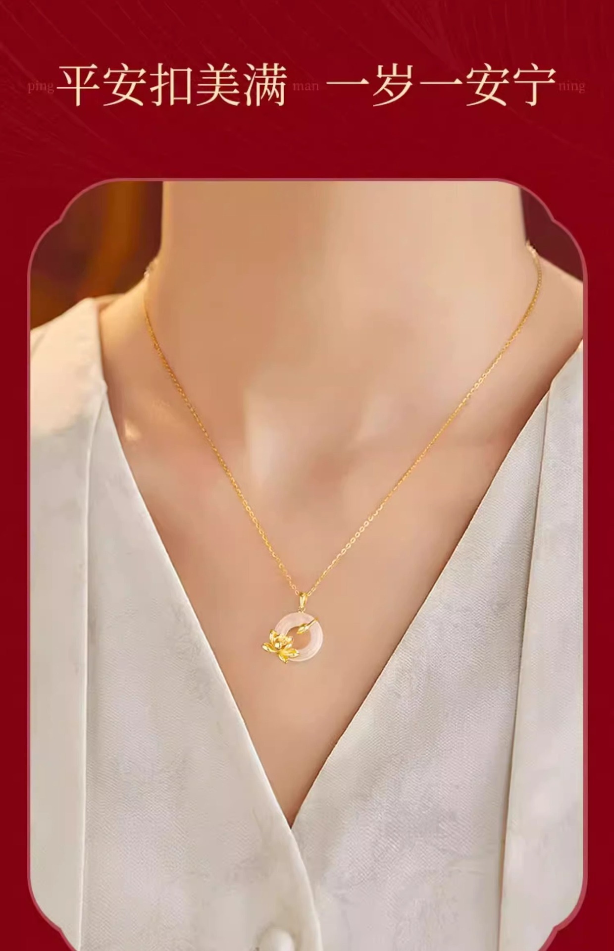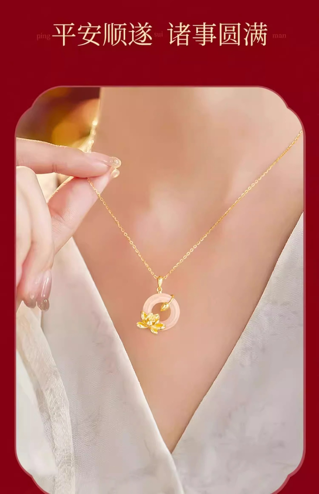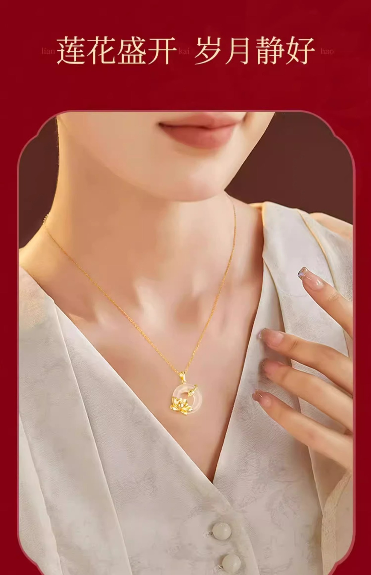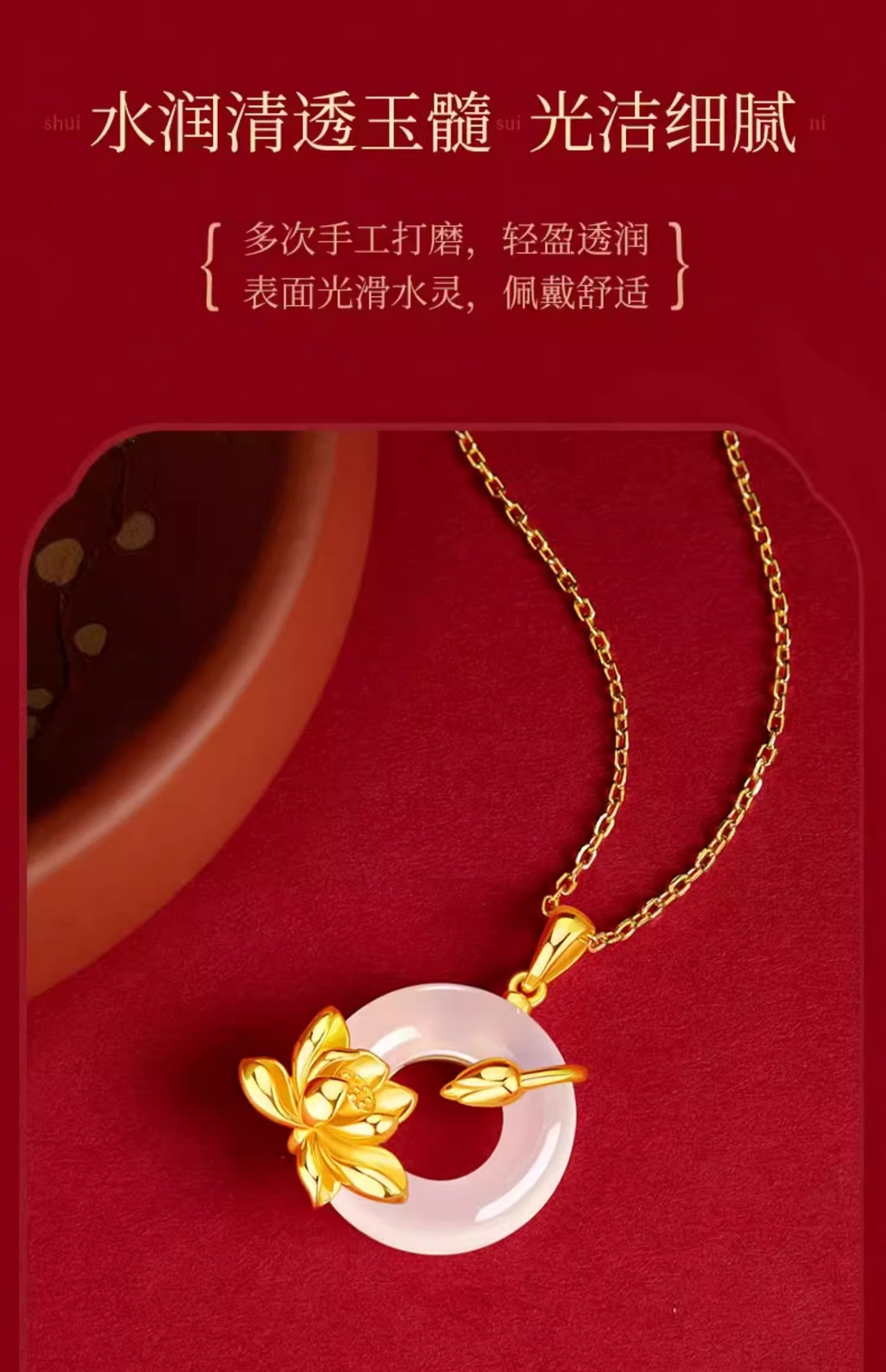 【母亲节礼物】六鑫珠宝 荷塘月色平安扣 国潮新中式玉髓荷花吊坠 s925纯银
