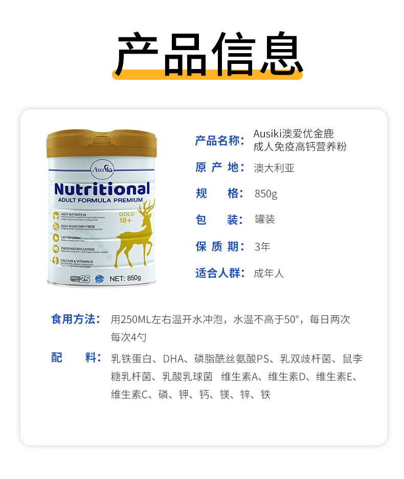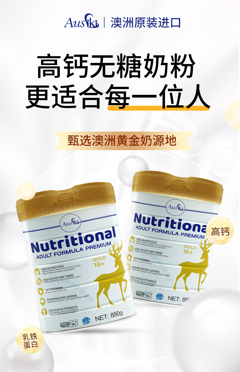 【保税区包邮直发】 Ausiki澳爱优金鹿 40+活性蛋白营养成人奶粉850g/罐