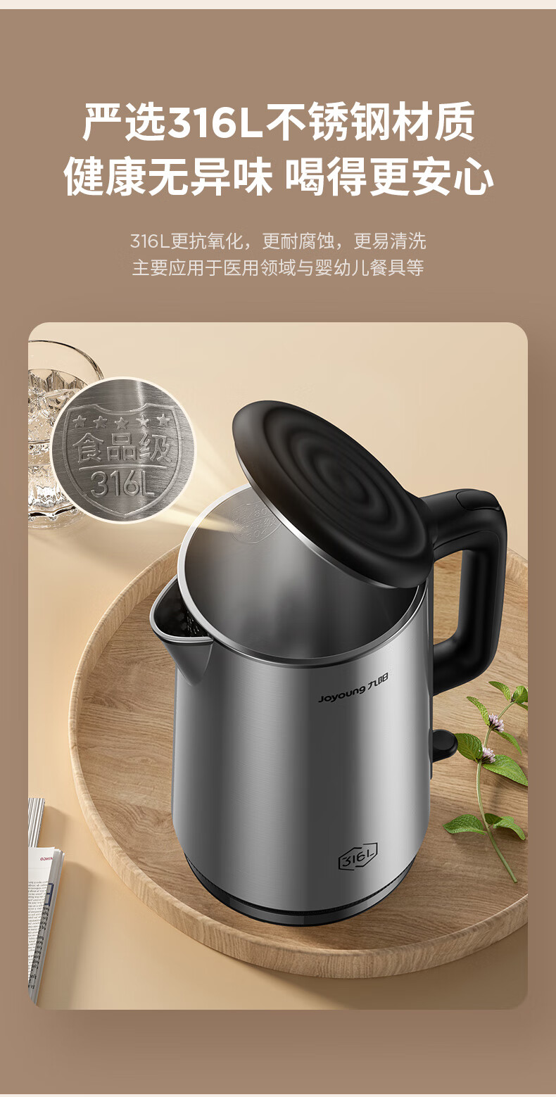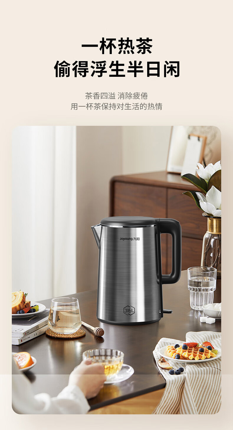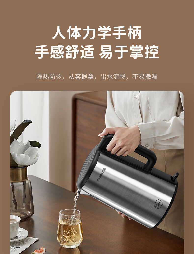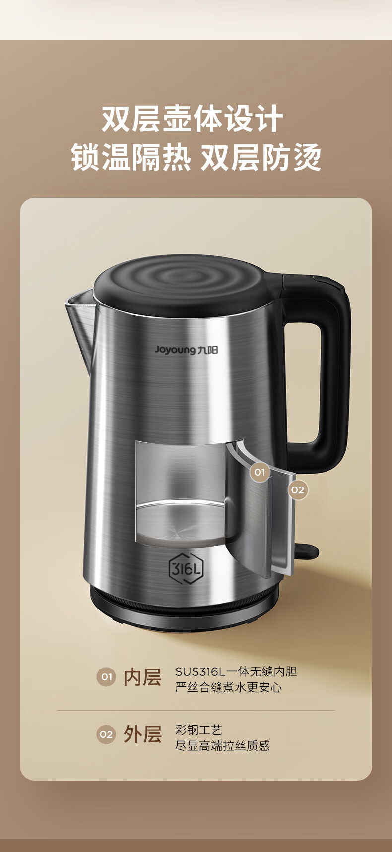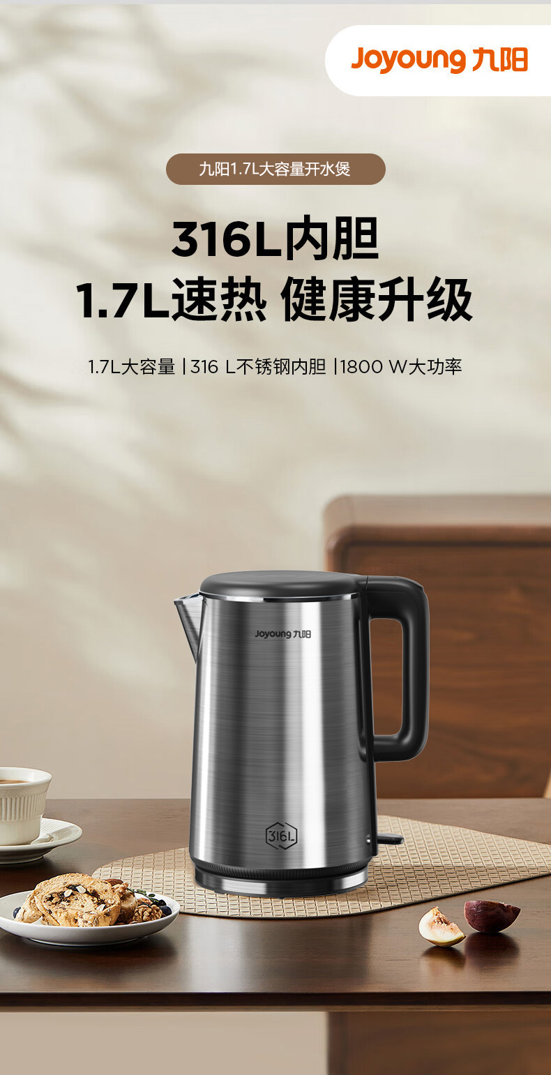 九阳电热水壶316L不锈钢内胆1.7L升大容量开水煲家用烧水壶电水壶