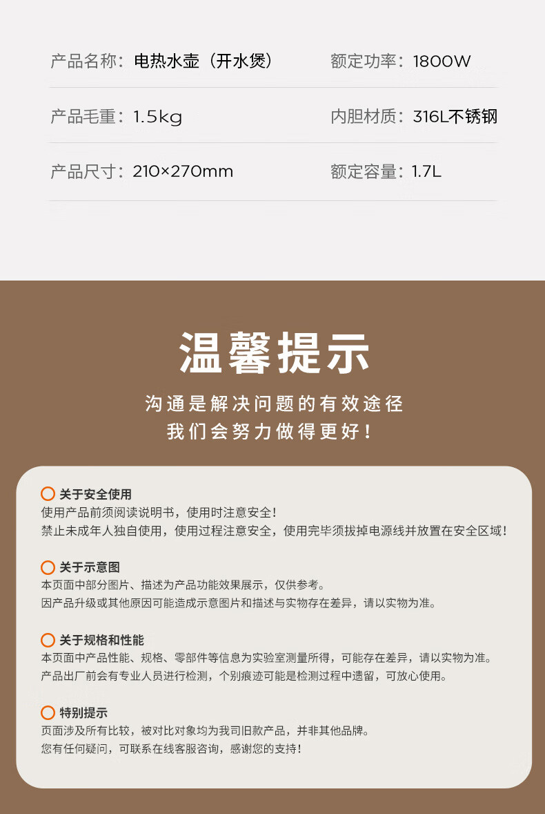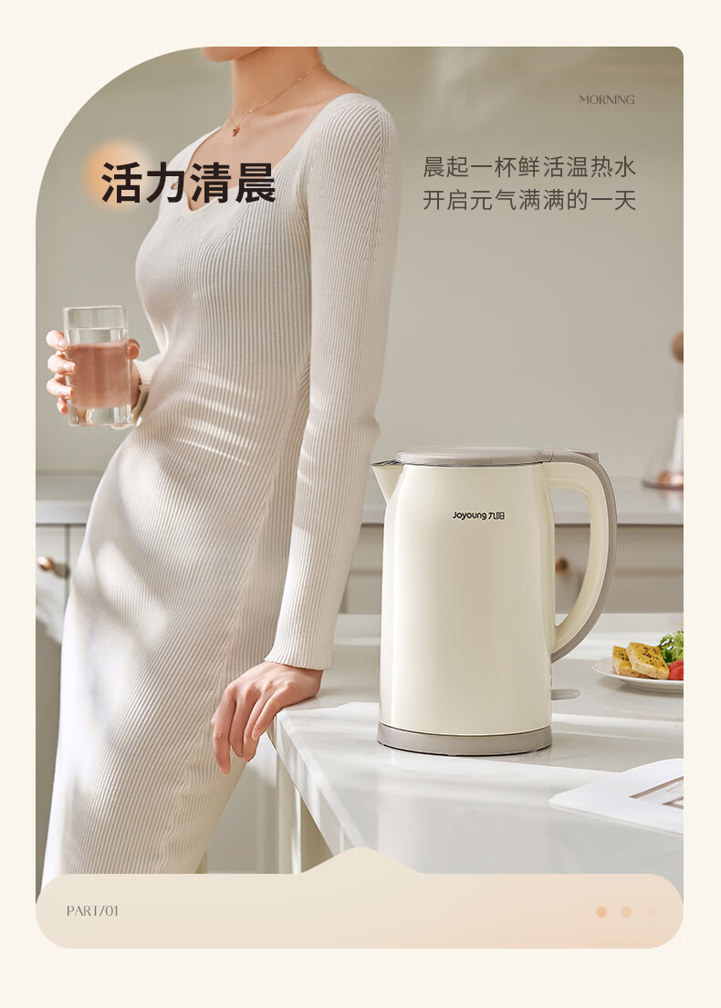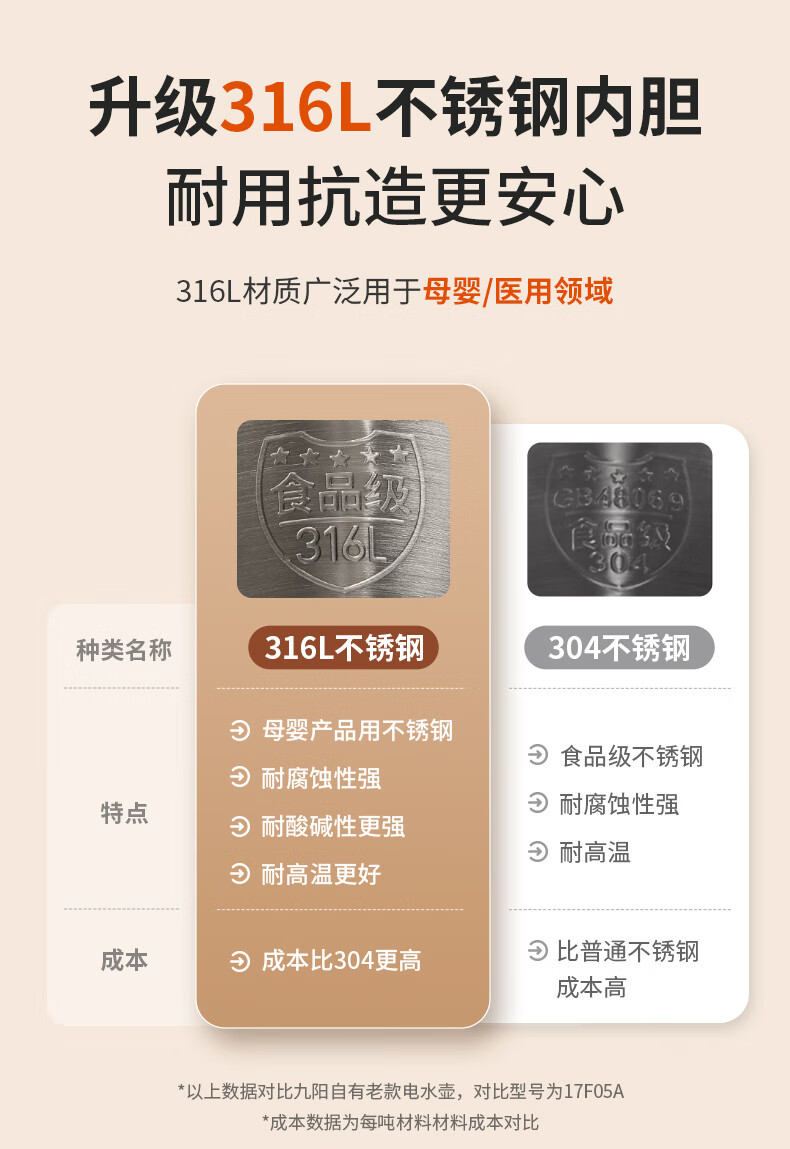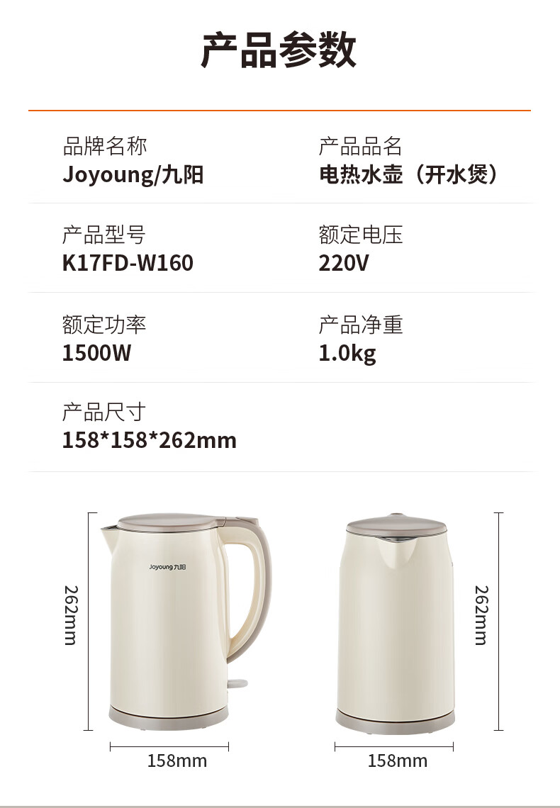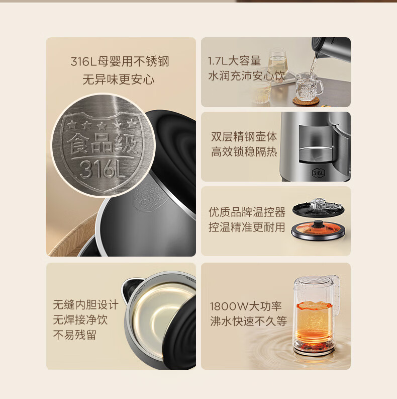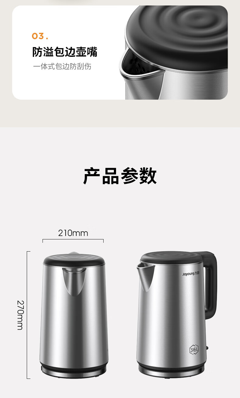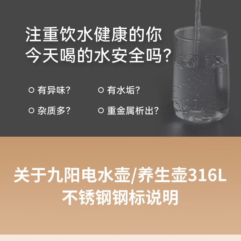 九阳电热水壶316L不锈钢内胆1.7L升大容量开水煲家用烧水壶电水壶