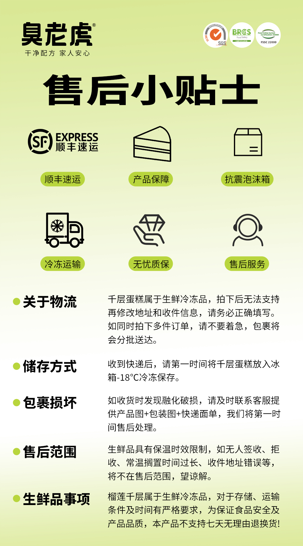 - 未按照产品说明进行正确储存,导致蛋糕变质等情况,不予退货。