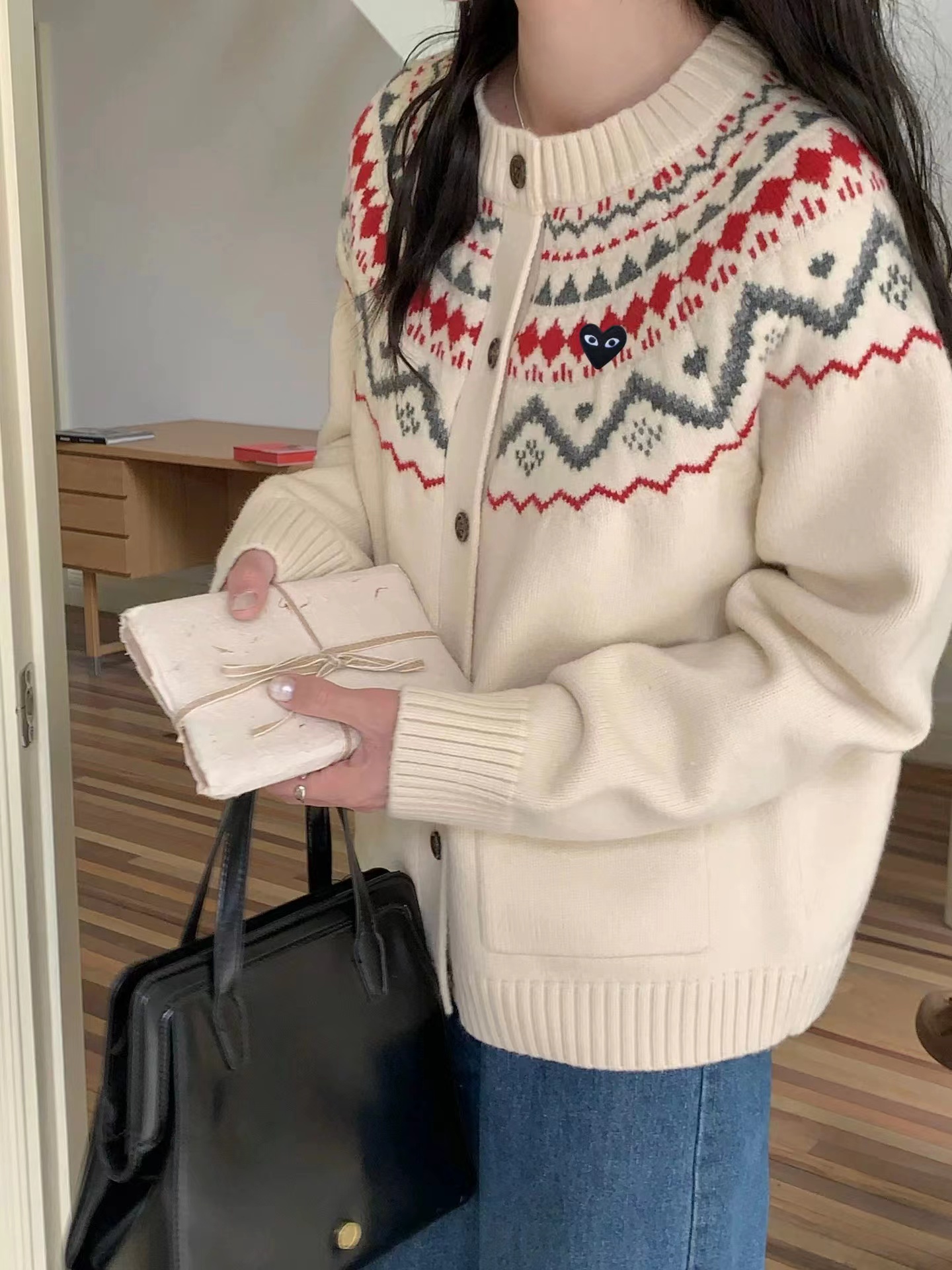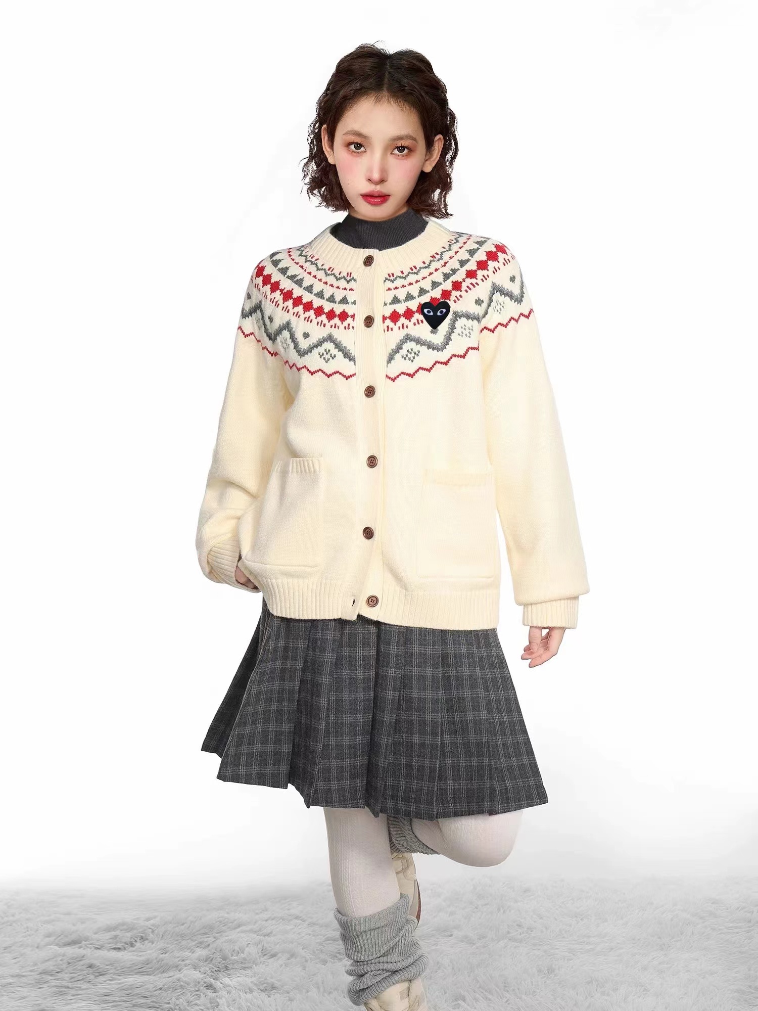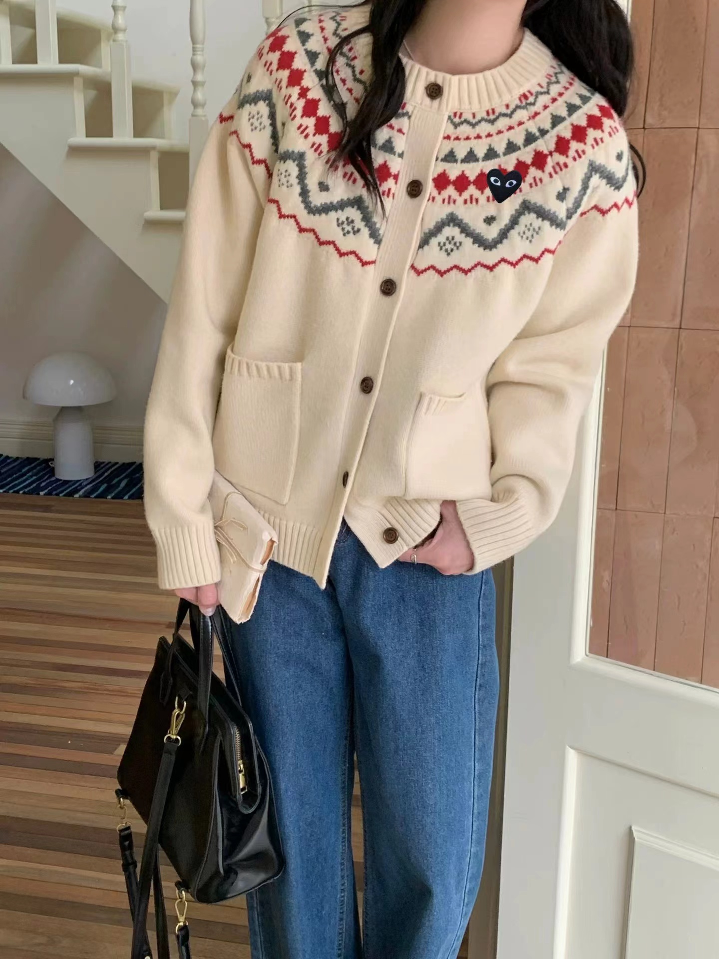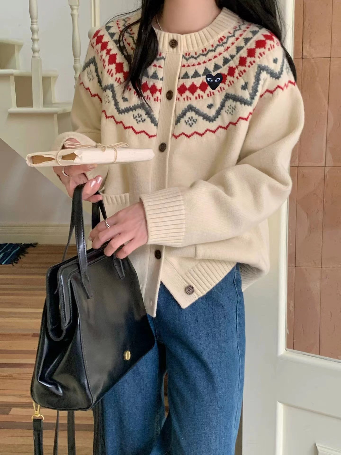 米白色费尔岛提花针织开衫,为宽松的圆领开襟版型,门襟处有金属纽扣设计,袖口和下摆是jing典的罗纹收边,增加了衣物的贴合度与耐穿性。衣身肩部到胸前位置饰有红灰撞色的费尔岛复古提花纹样,左侧胸口点缀标志性的黑色爱心带眼刺绣,整体针织面料软糯厚实,兼具保暖性与设计感。搭配蓝色牛仔下装,营造出复古温柔又休闲的日常穿搭风格。