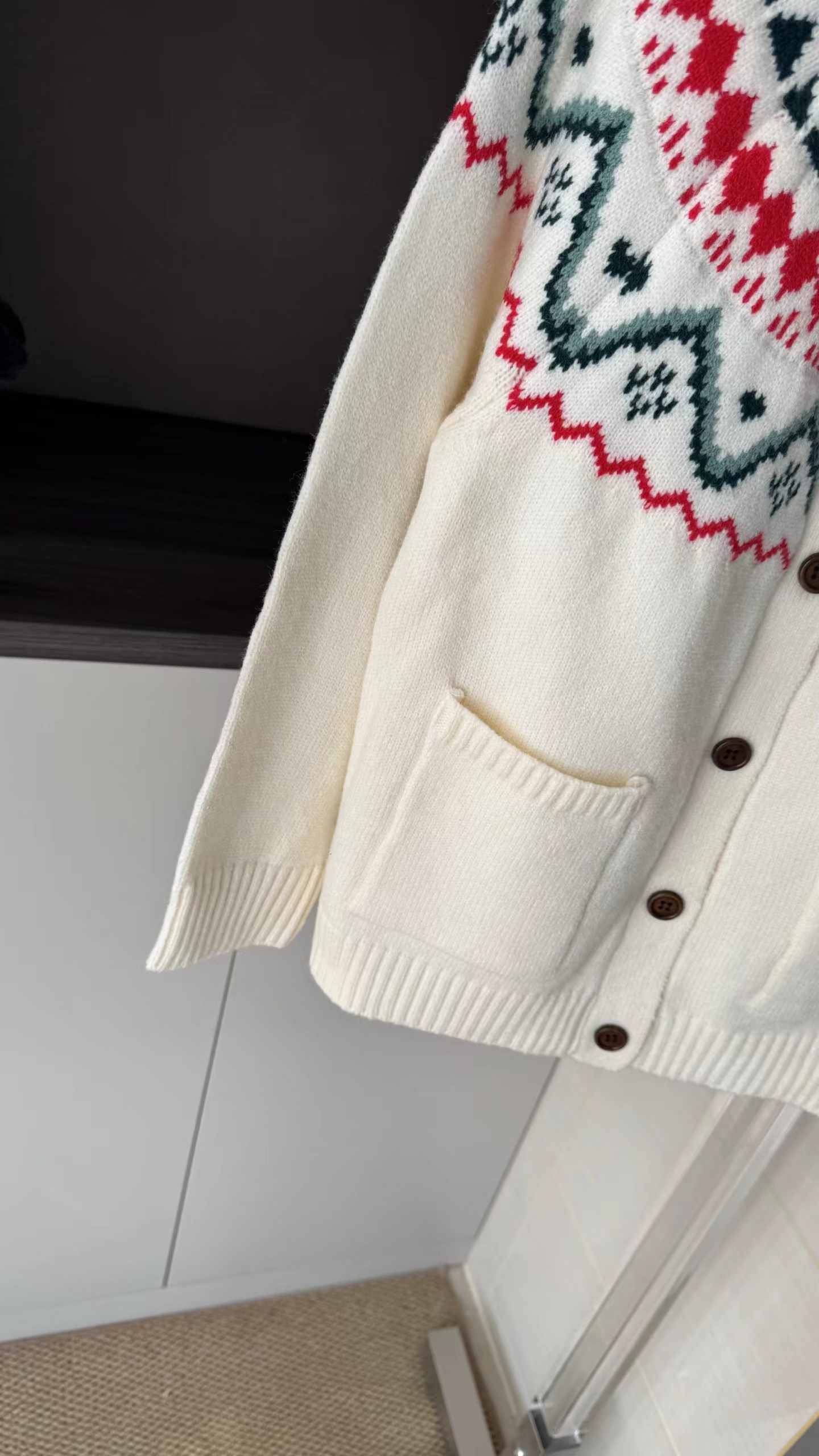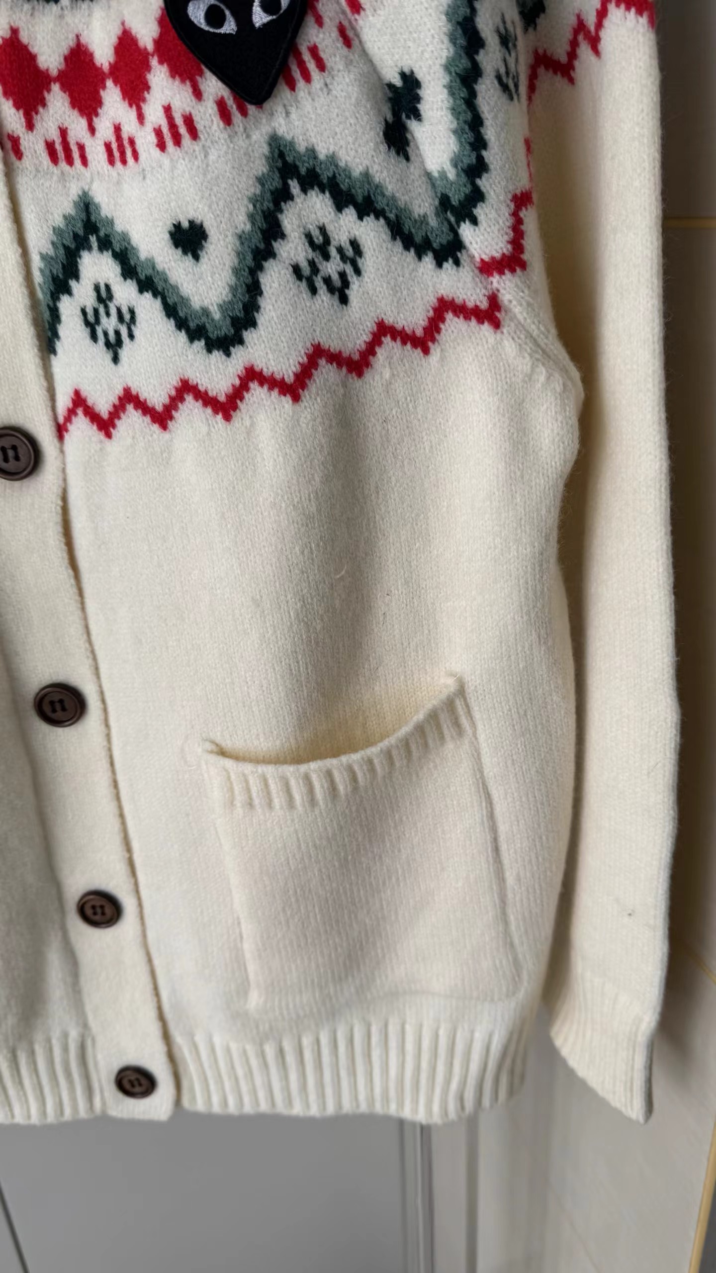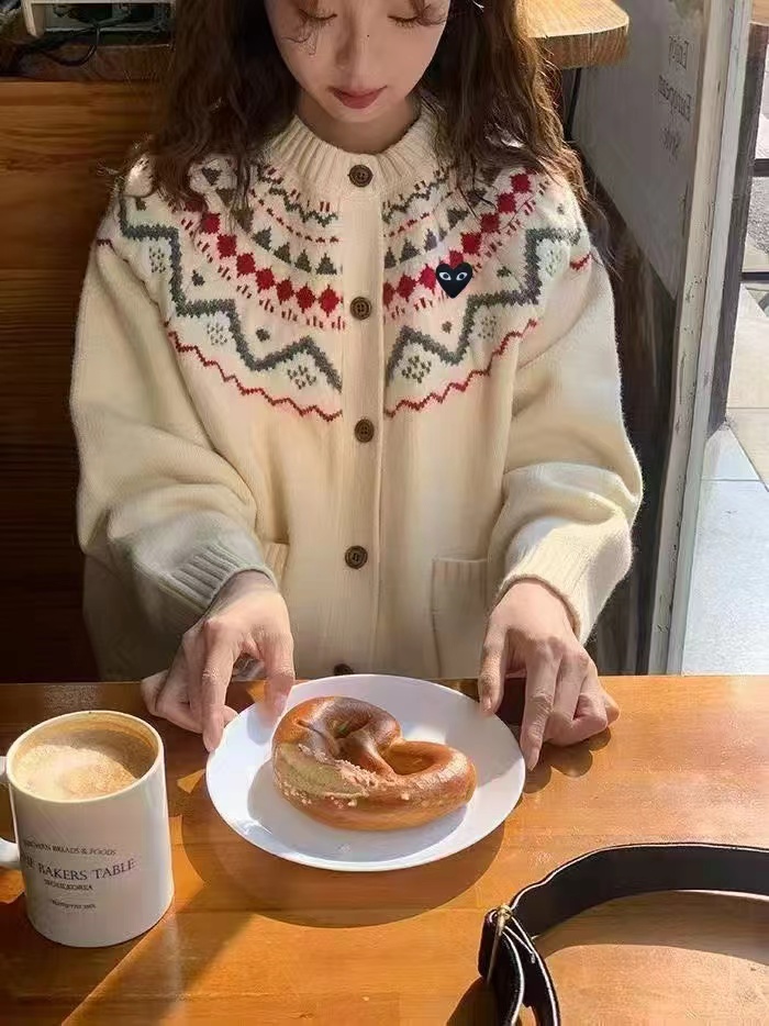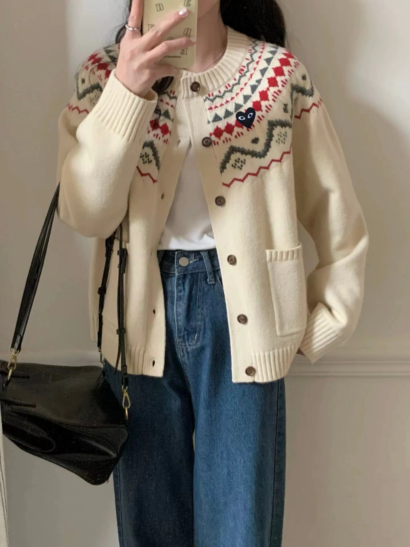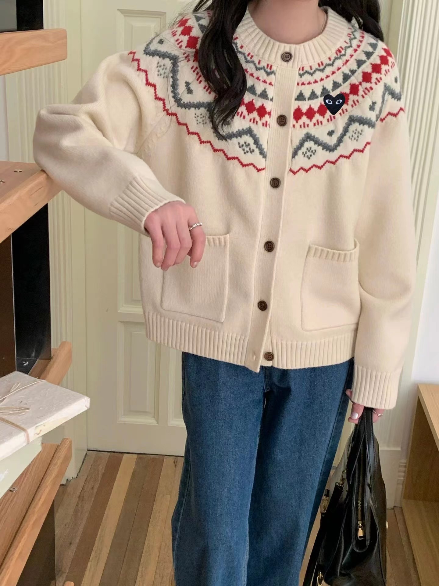 米白色费尔岛提花针织开衫,为宽松的圆领开襟版型,门襟处有金属纽扣设计,袖口和下摆是jing典的罗纹收边,增加了衣物的贴合度与耐穿性。衣身肩部到胸前位置饰有红灰撞色的费尔岛复古提花纹样,左侧胸口点缀标志性的黑色爱心带眼刺绣,整体针织面料软糯厚实,兼具保暖性与设计感。搭配蓝色牛仔下装,营造出复古温柔又休闲的日常穿搭风格。