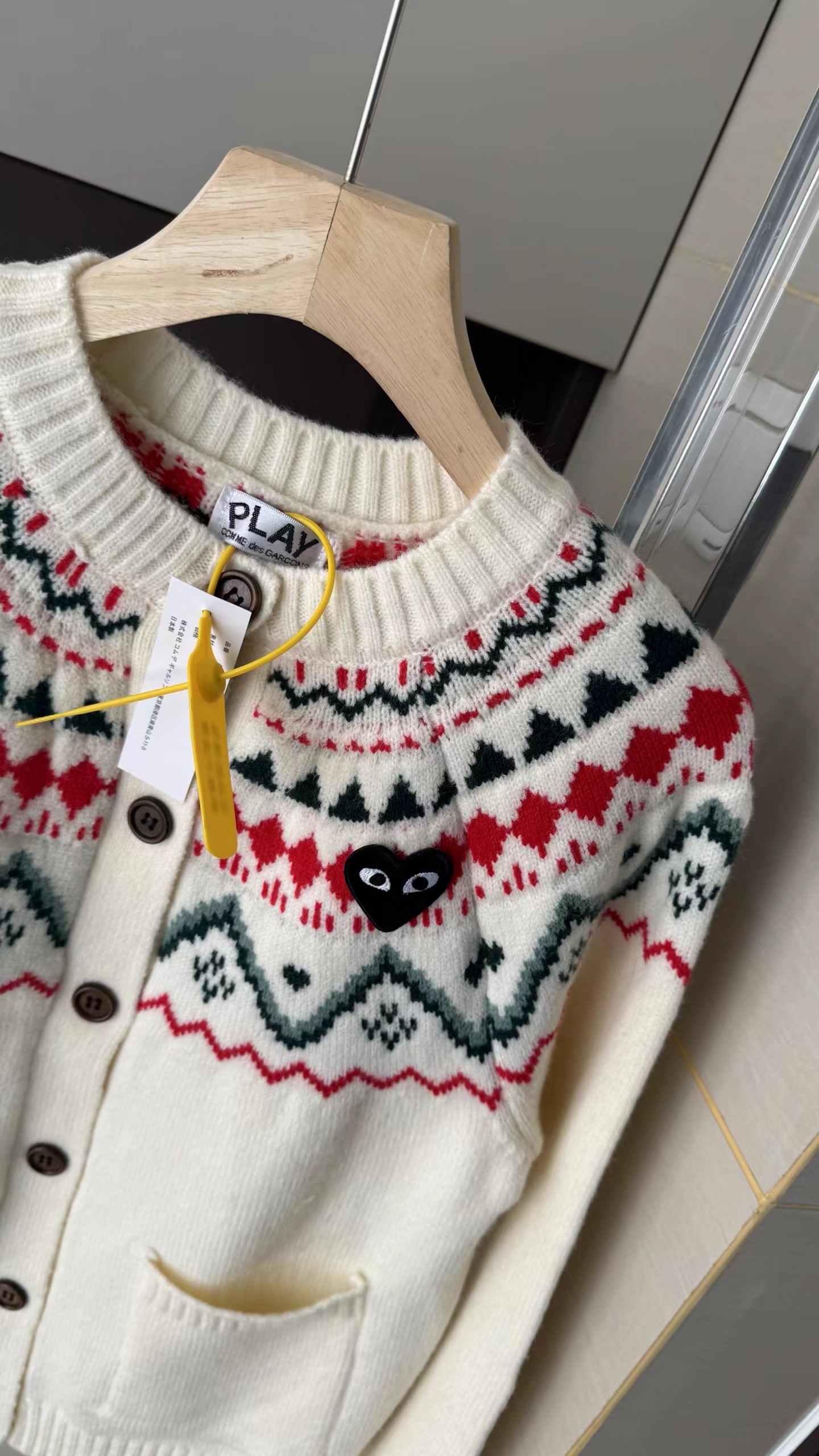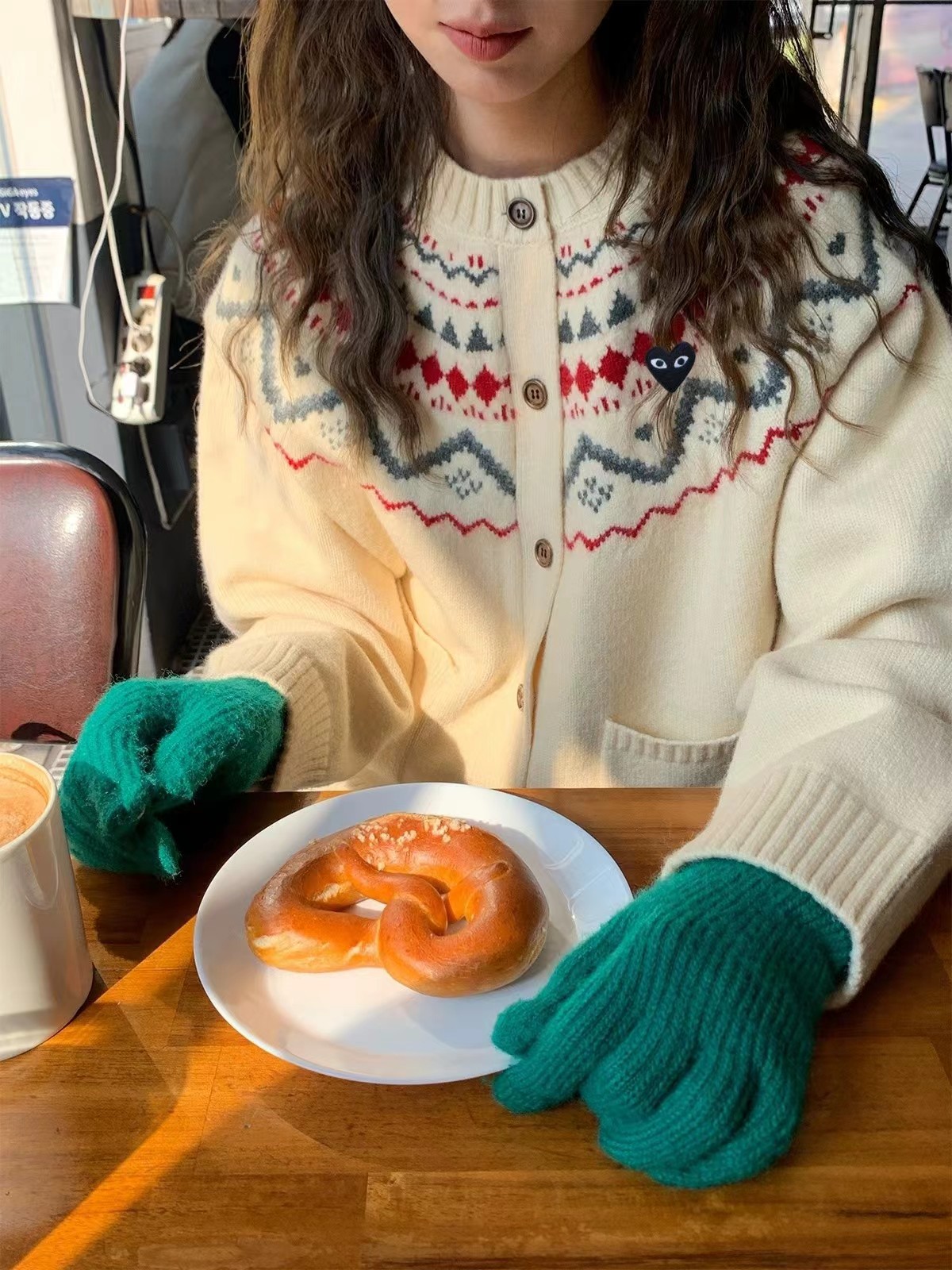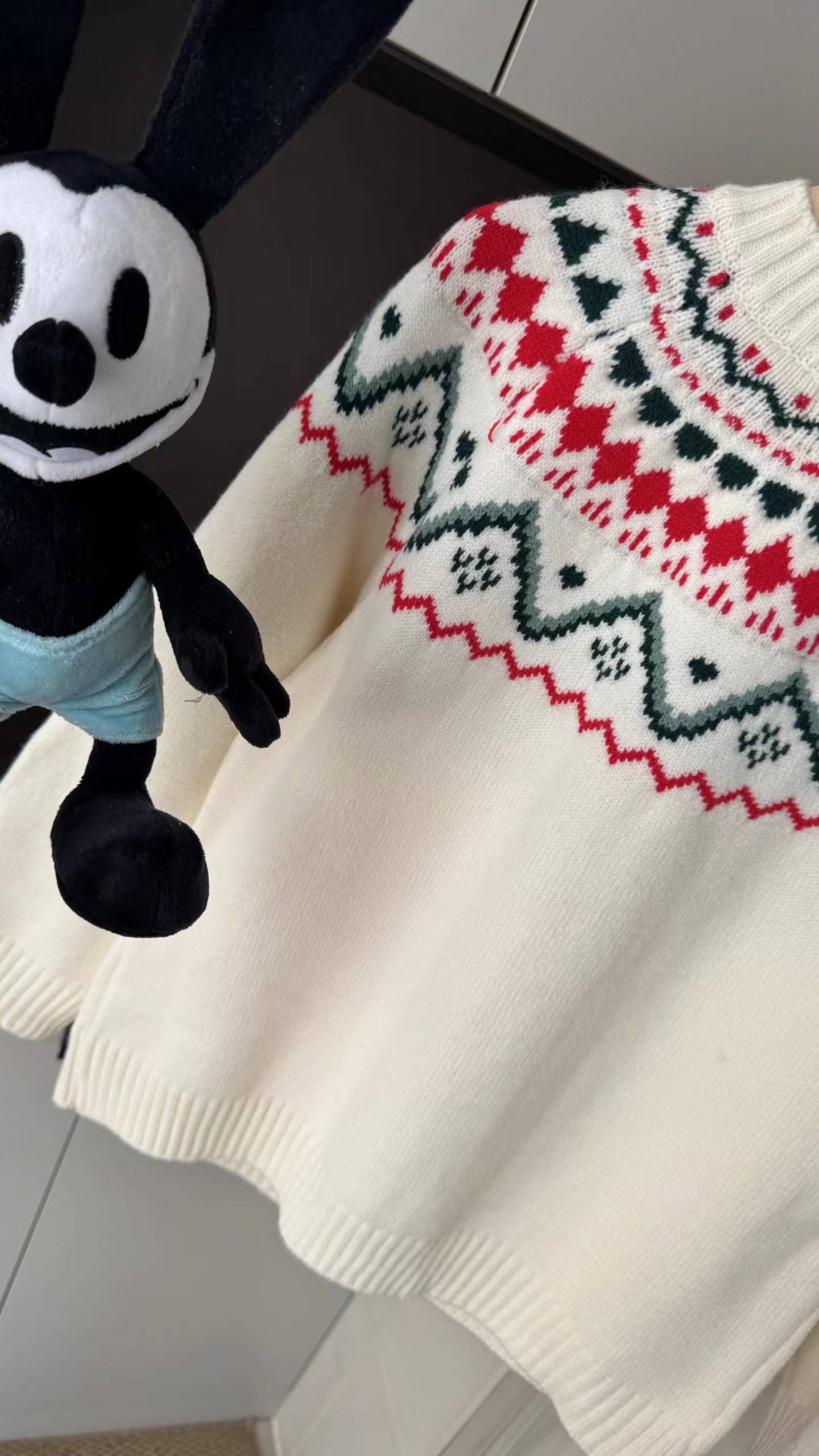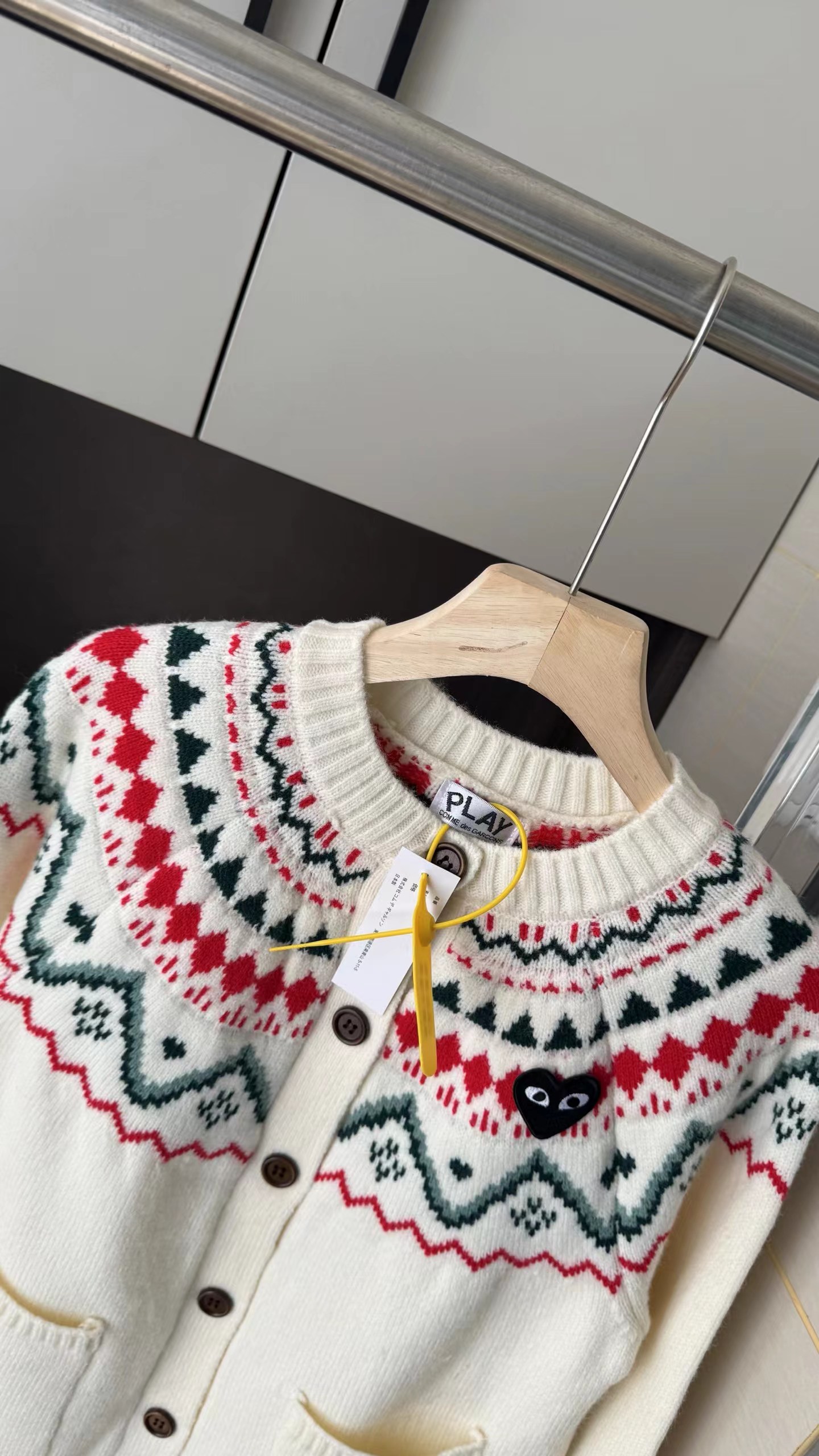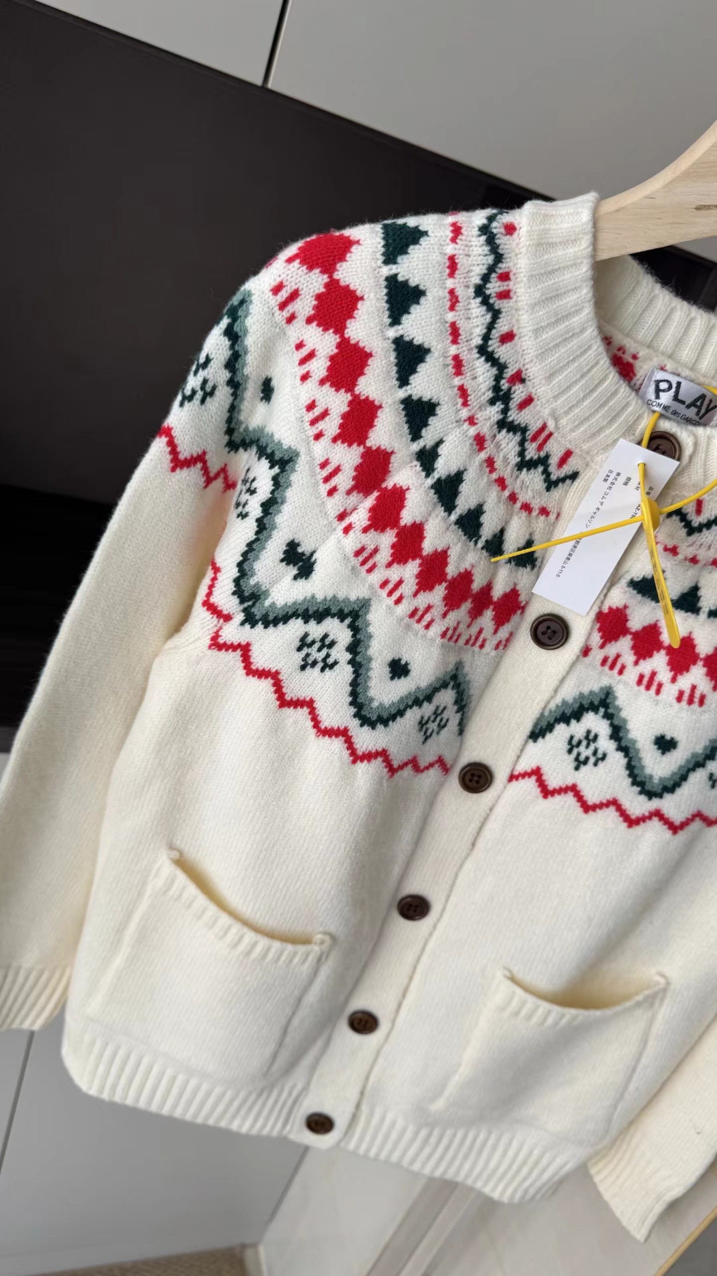 米白色费尔岛提花针织开衫,为宽松的圆领开襟版型,门襟处有金属纽扣设计,袖口和下摆是jing典的罗纹收边,增加了衣物的贴合度与耐穿性。衣身肩部到胸前位置饰有红灰撞色的费尔岛复古提花纹样,左侧胸口点缀标志性的黑色爱心带眼刺绣,整体针织面料软糯厚实,兼具保暖性与设计感。搭配蓝色牛仔下装,营造出复古温柔又休闲的日常穿搭风格。