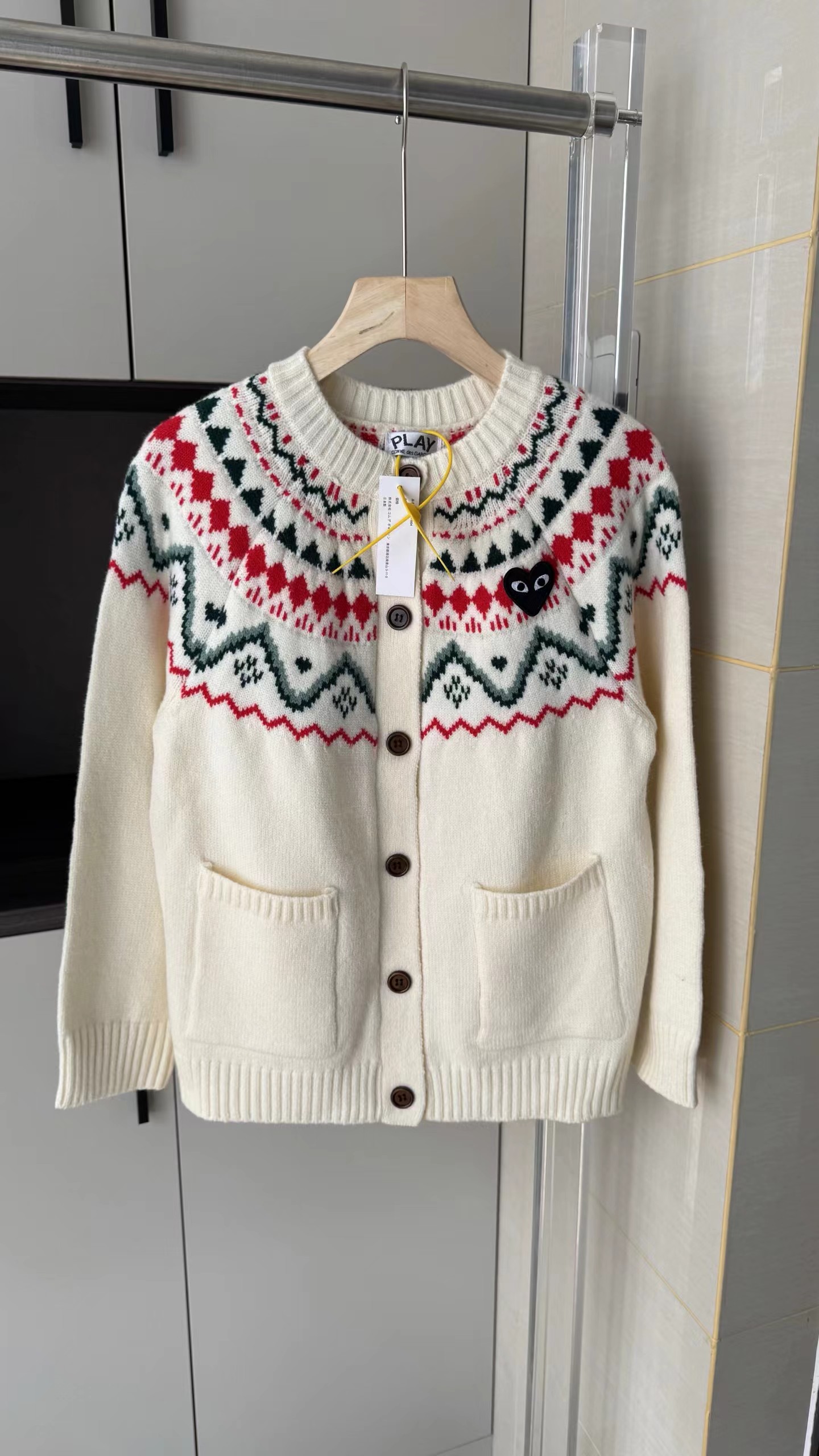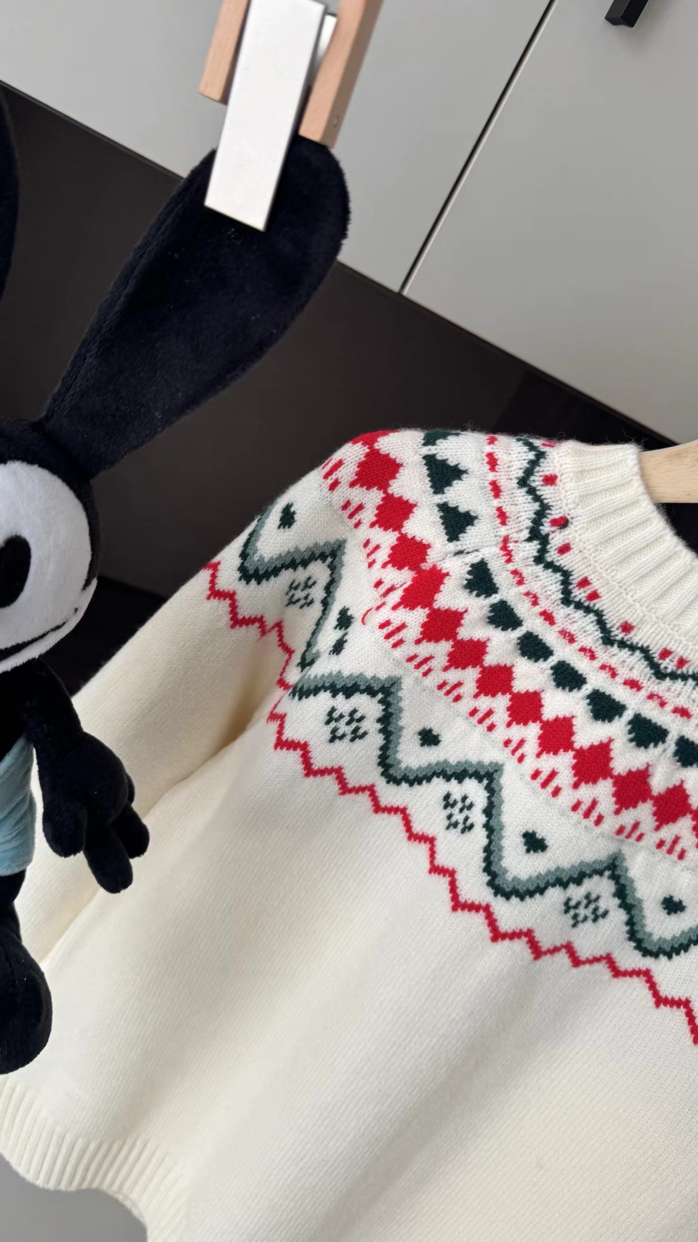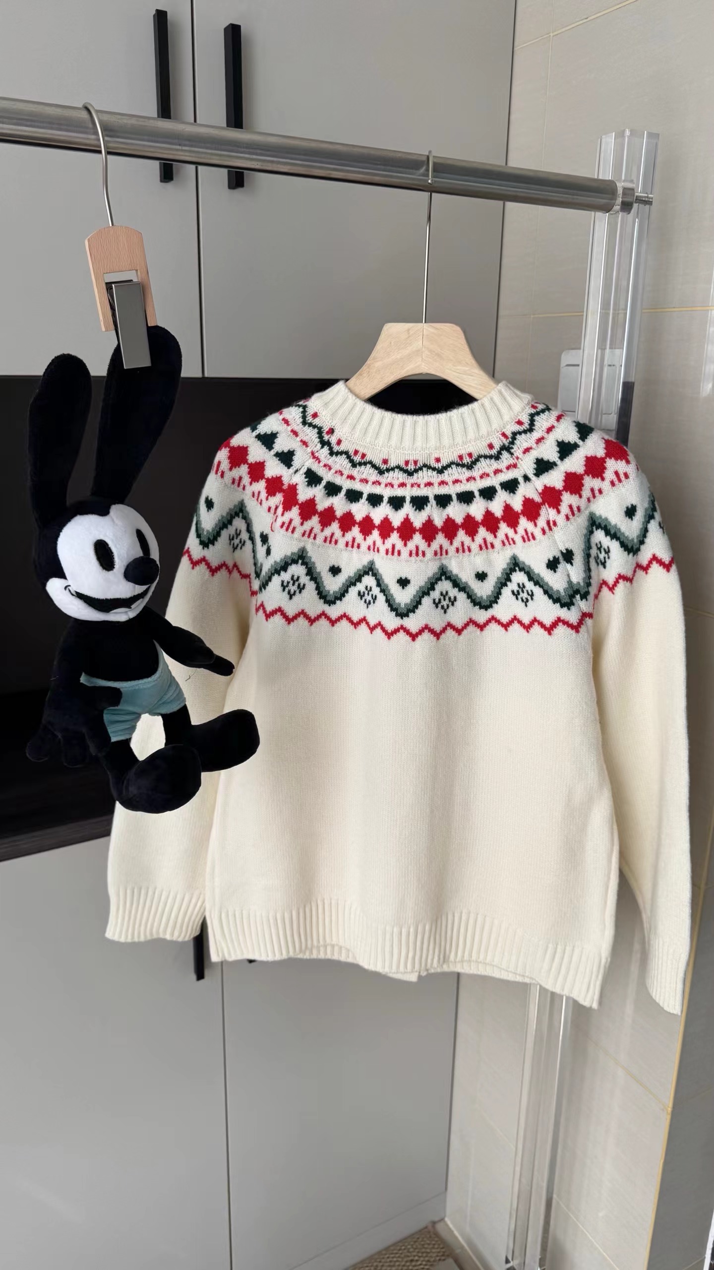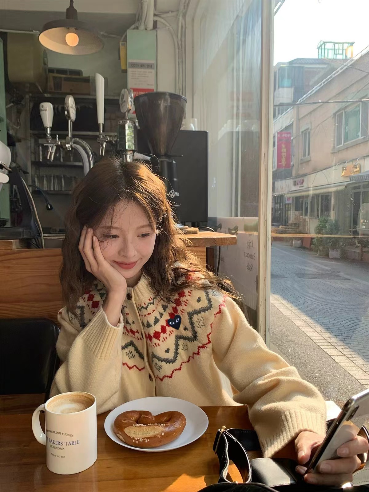 米白色费尔岛提花针织开衫,为宽松的圆领开襟版型,门襟处有金属纽扣设计,袖口和下摆是jing典的罗纹收边,增加了衣物的贴合度与耐穿性。衣身肩部到胸前位置饰有红灰撞色的费尔岛复古提花纹样,左侧胸口点缀标志性的黑色爱心带眼刺绣,整体针织面料软糯厚实,兼具保暖性与设计感。搭配蓝色牛仔下装,营造出复古温柔又休闲的日常穿搭风格。