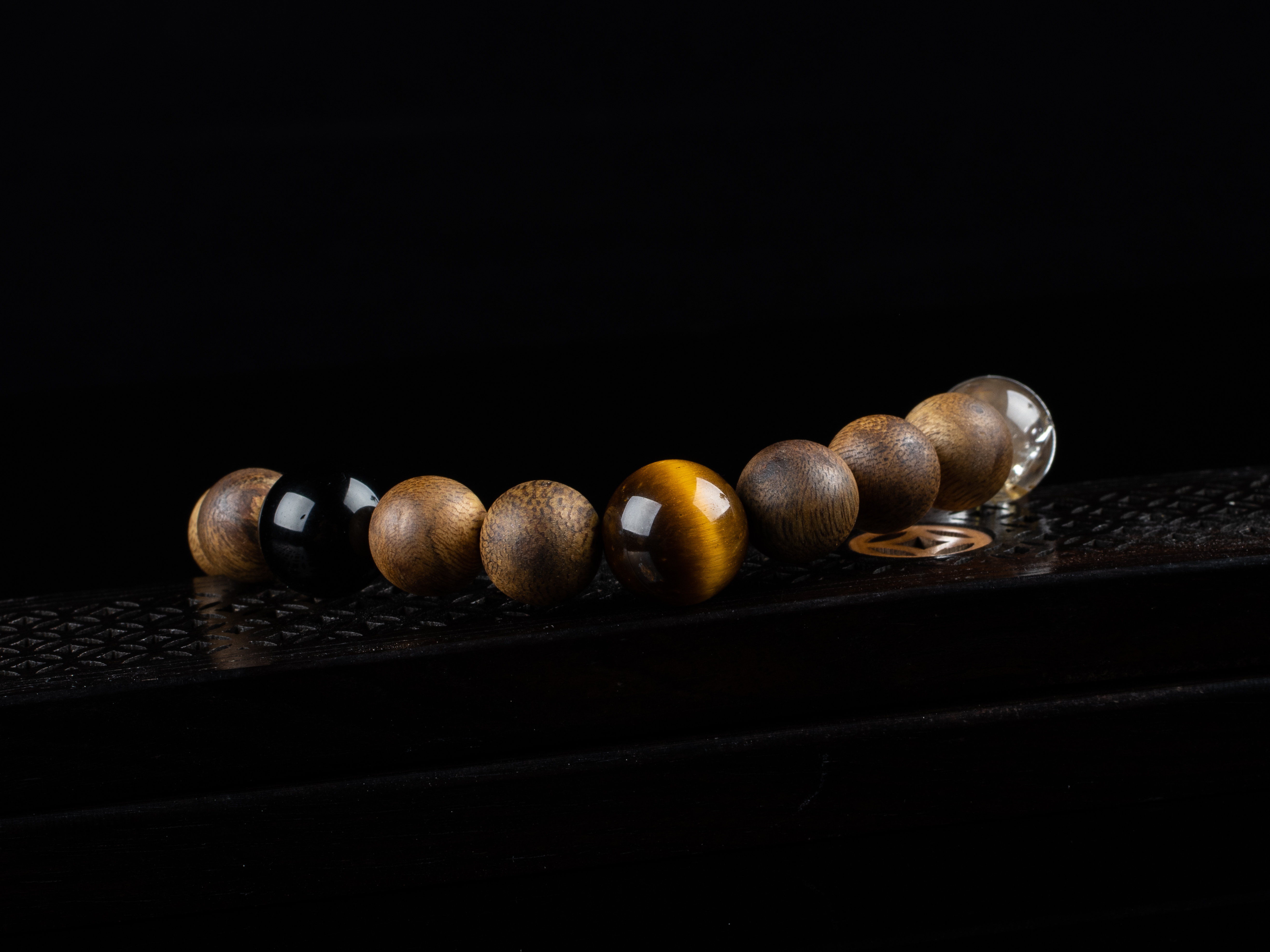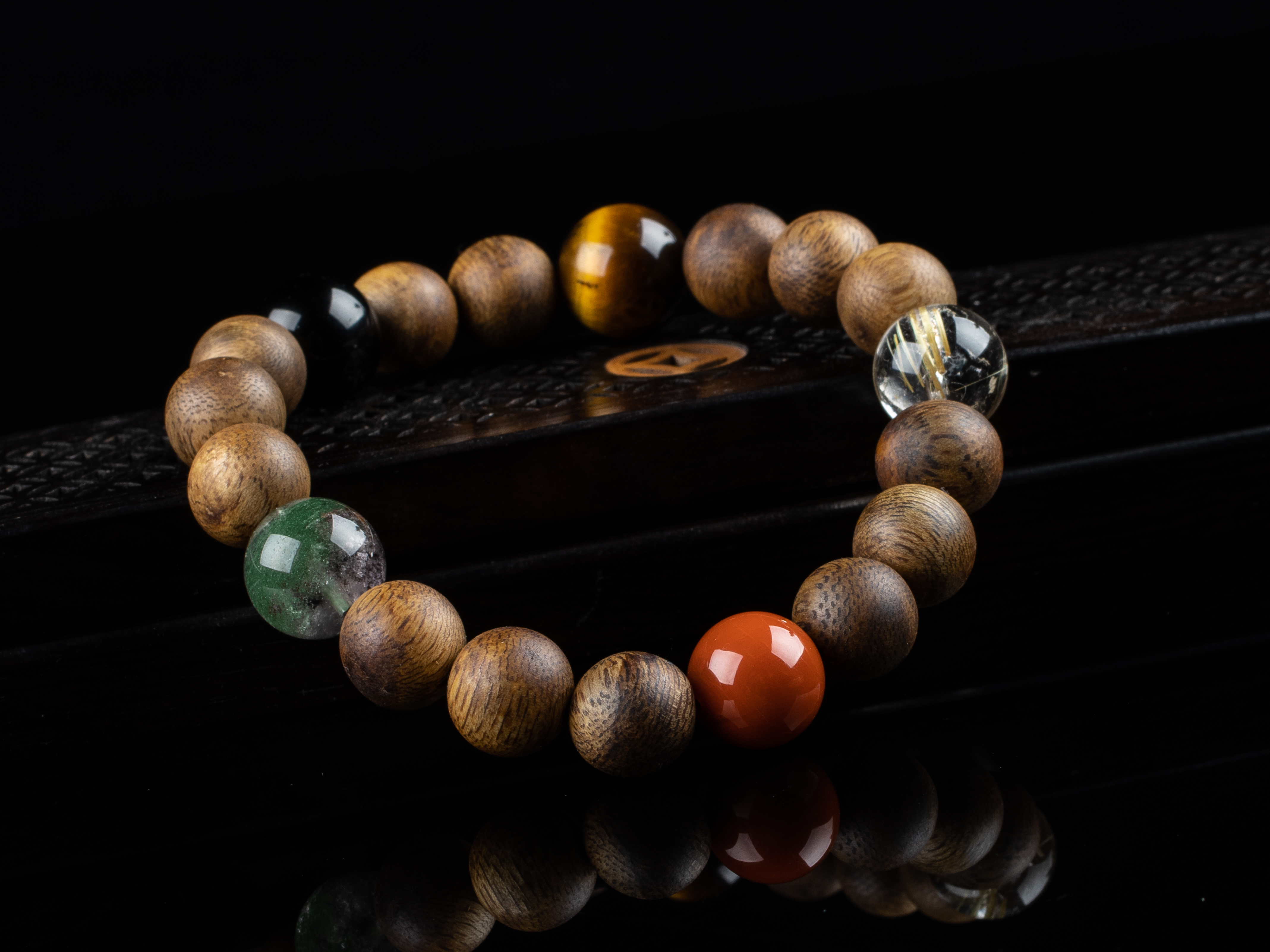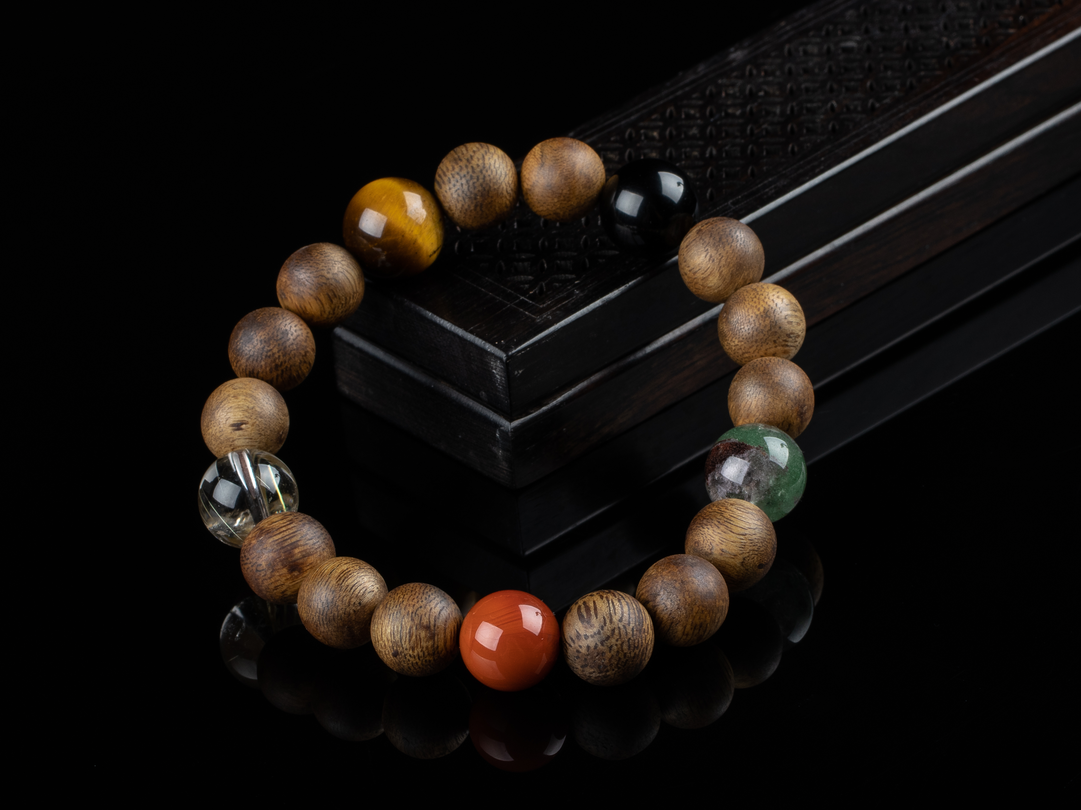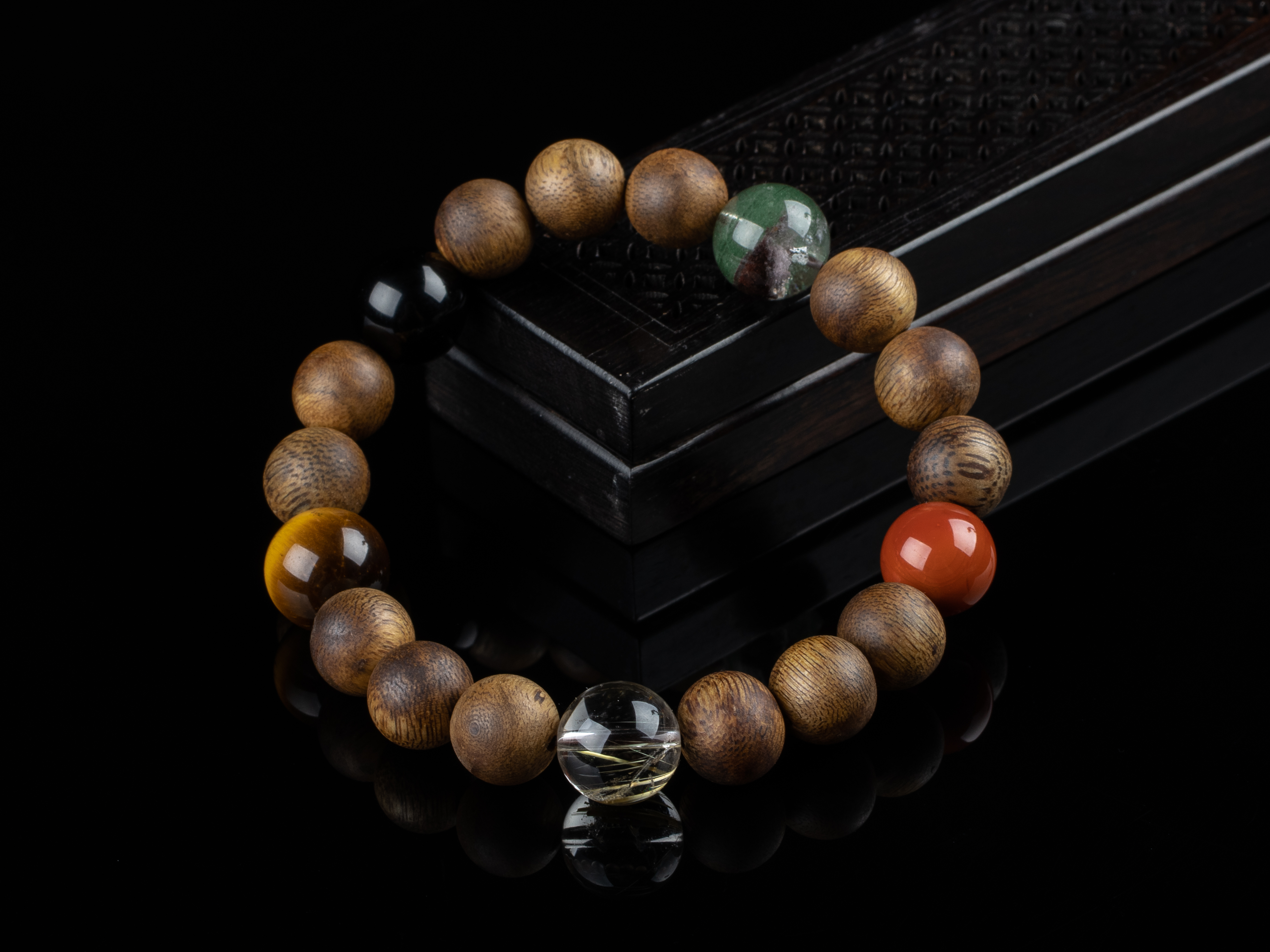 XY0163沉香+五行宝珠手串,天然沉香圆珠10.3mm,原色原味,香味自然清甜,五行宝珠:发晶、虎睛石、黑曜石、绿幽灵、南红。五行之道,相生相克,均衡之势,挡煞转运,回到健康的发展轨道之上。