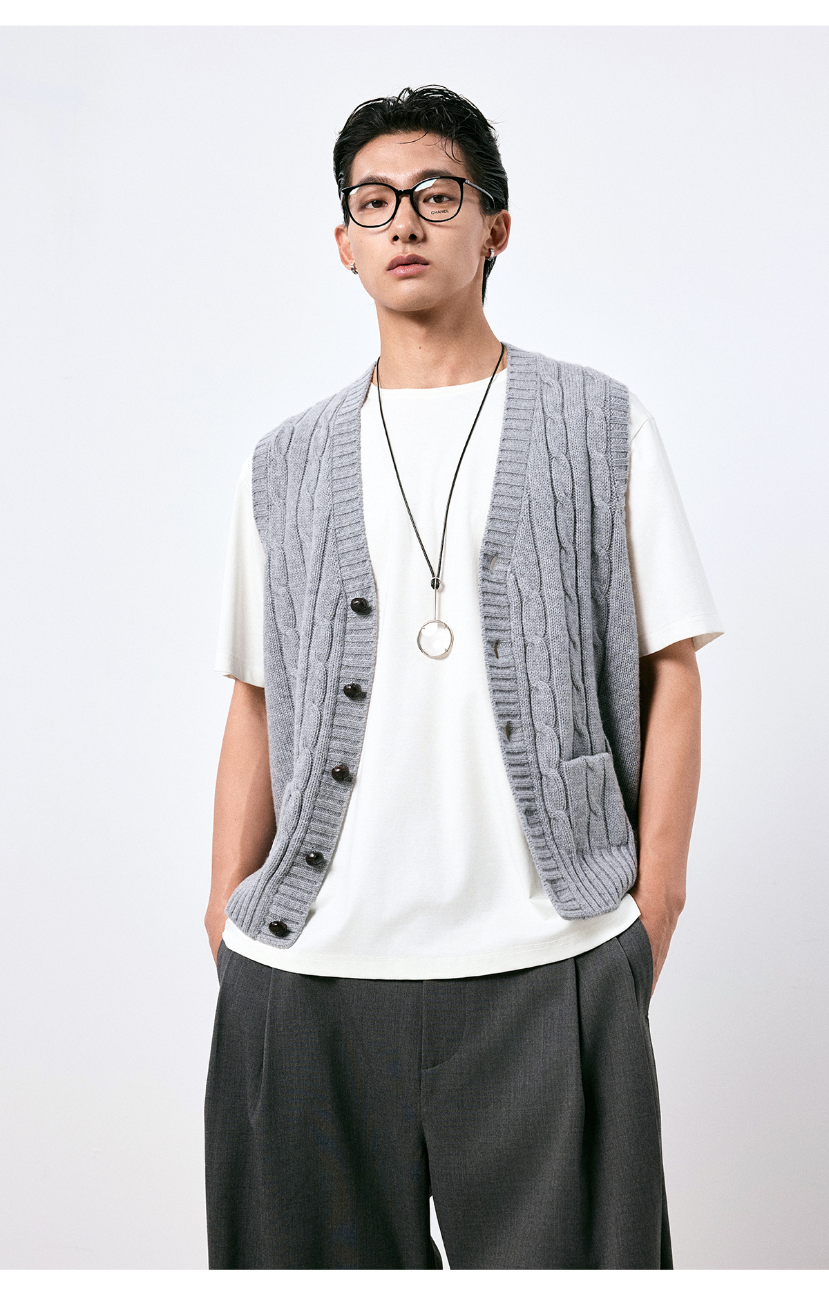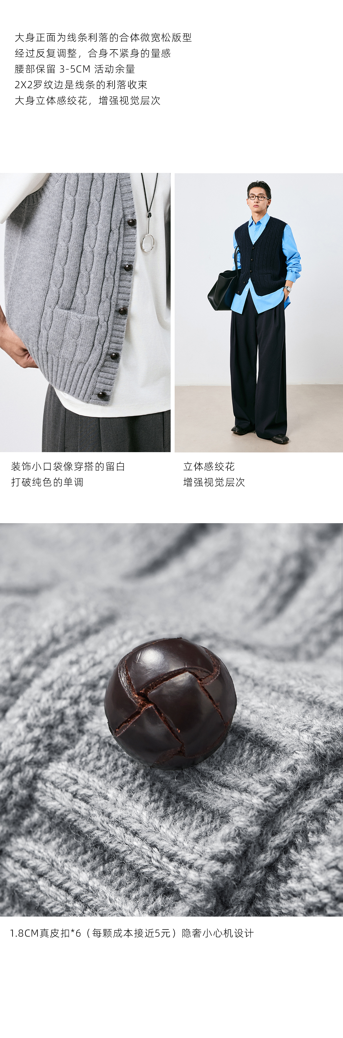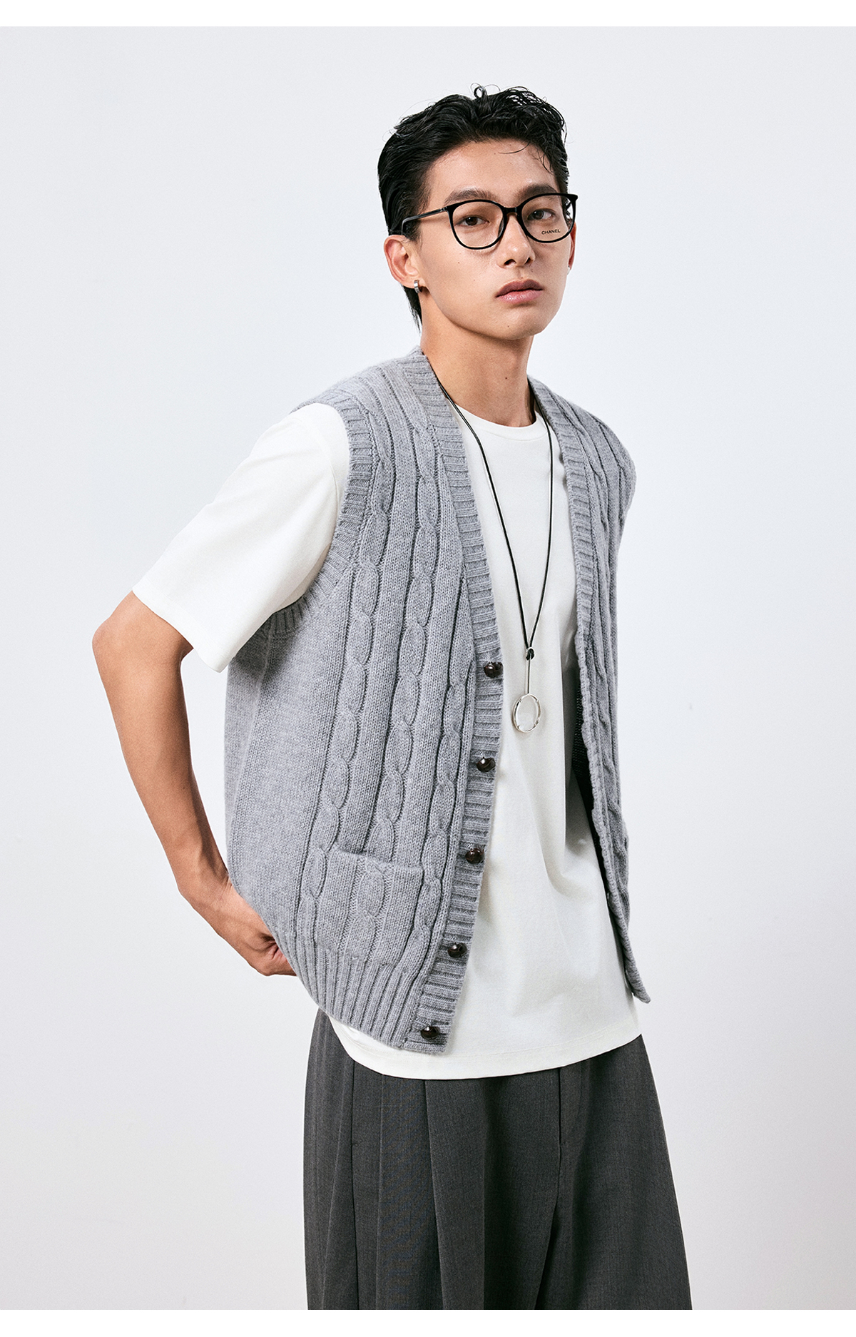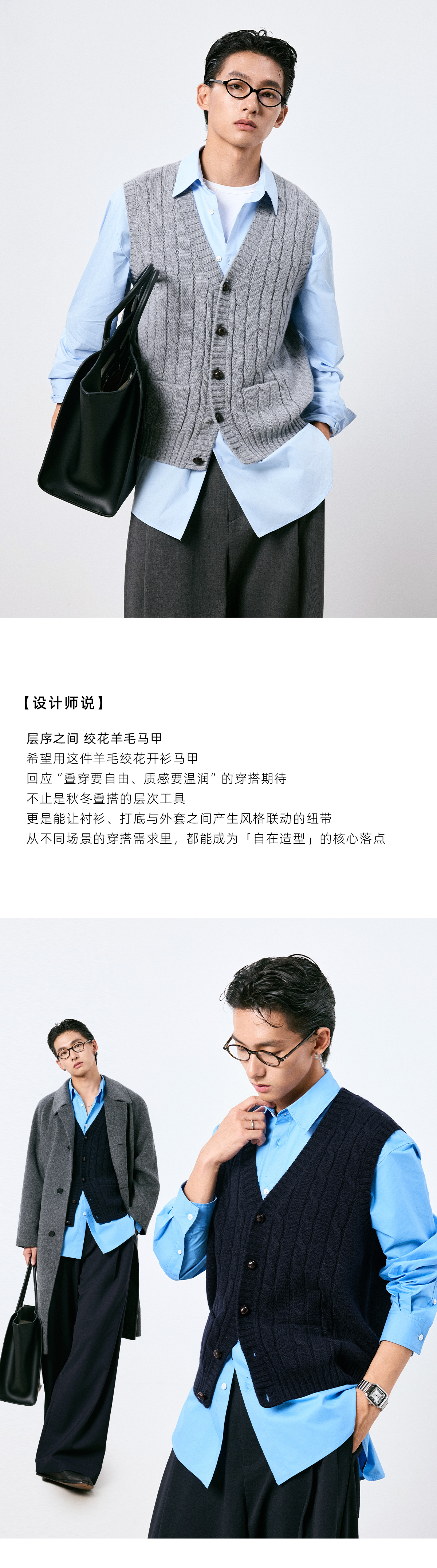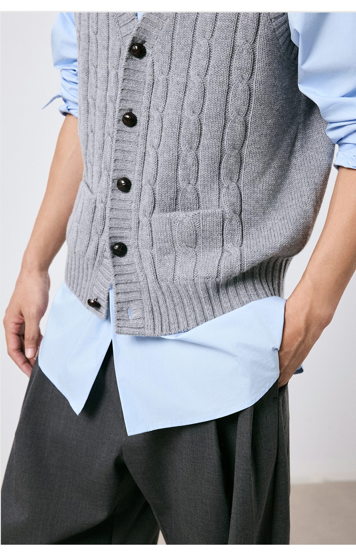 棉仓3661026002-【层序之间】灰色v领针织马甲全羊毛绞花叠穿背心开衫