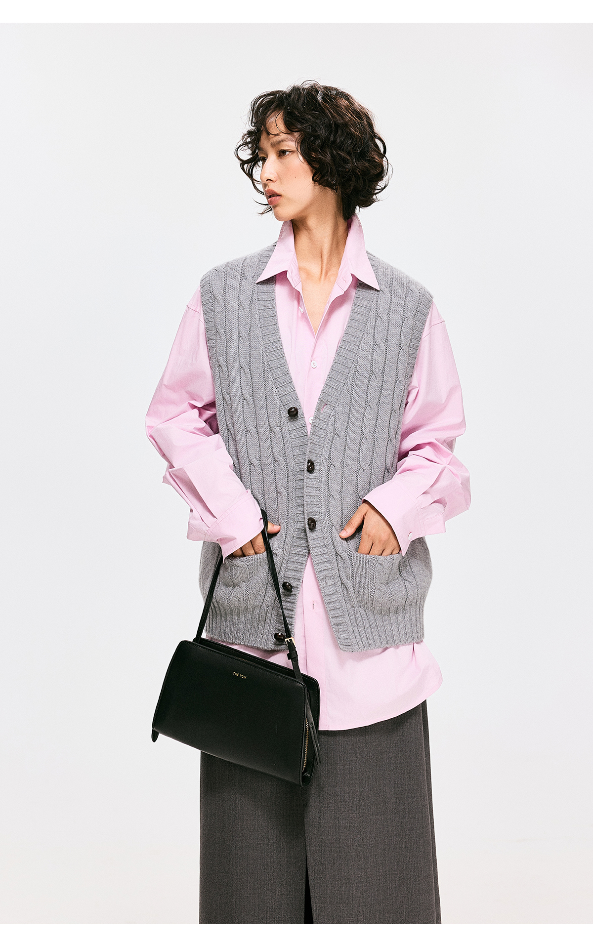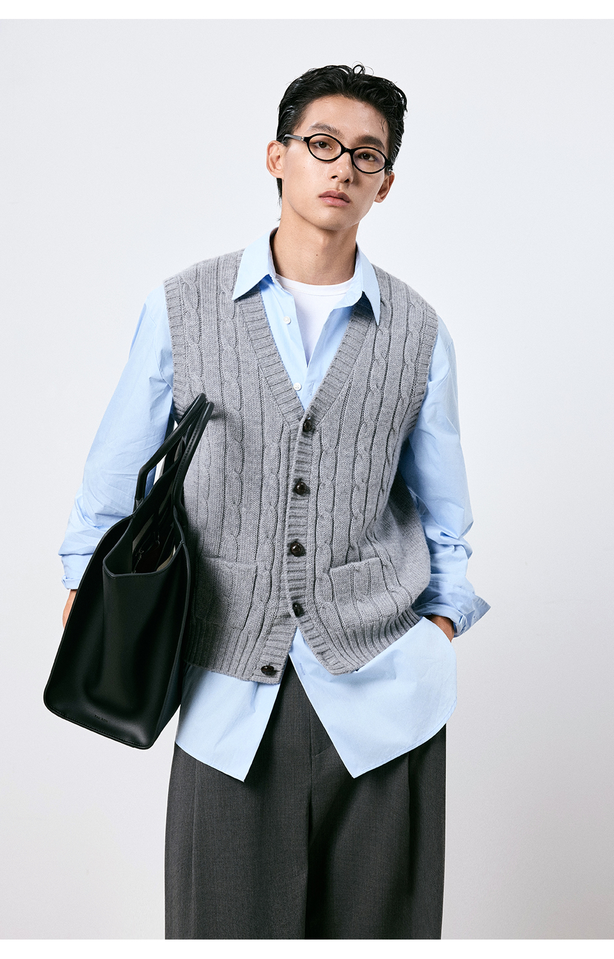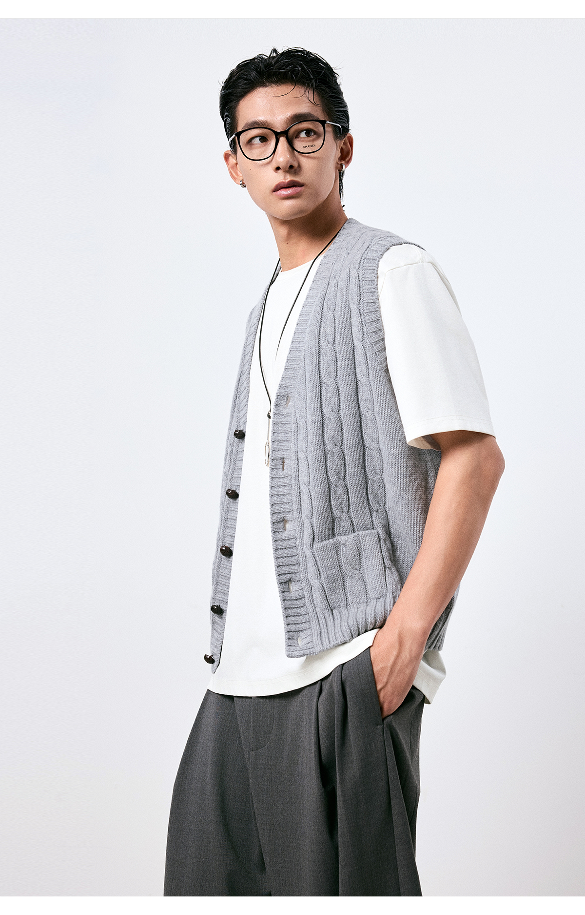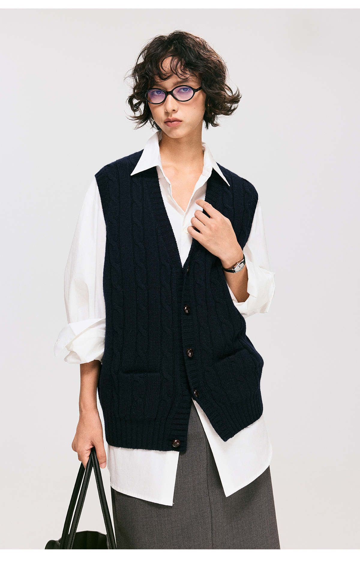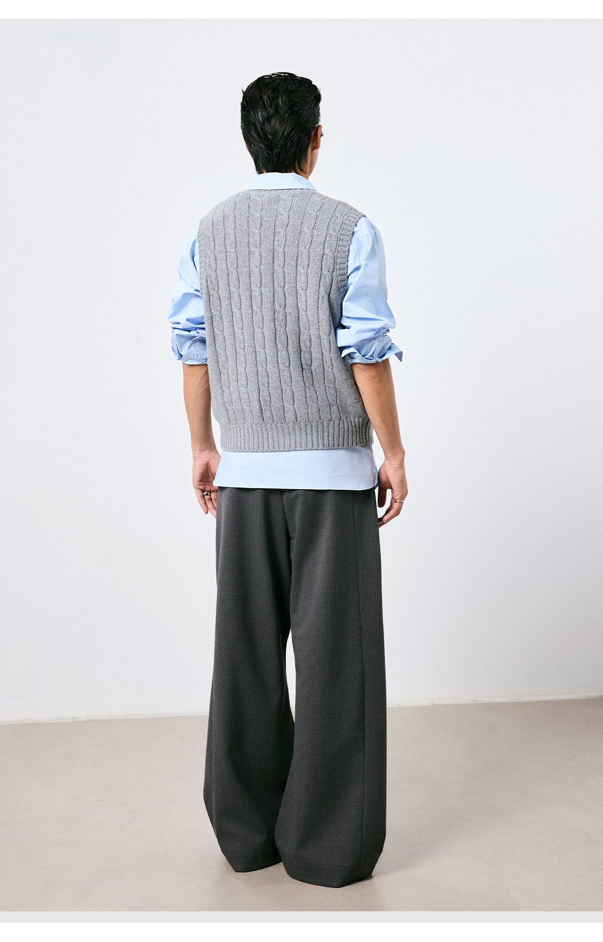 棉仓3661026002-【层序之间】灰色v领针织马甲全羊毛绞花叠穿背心开衫