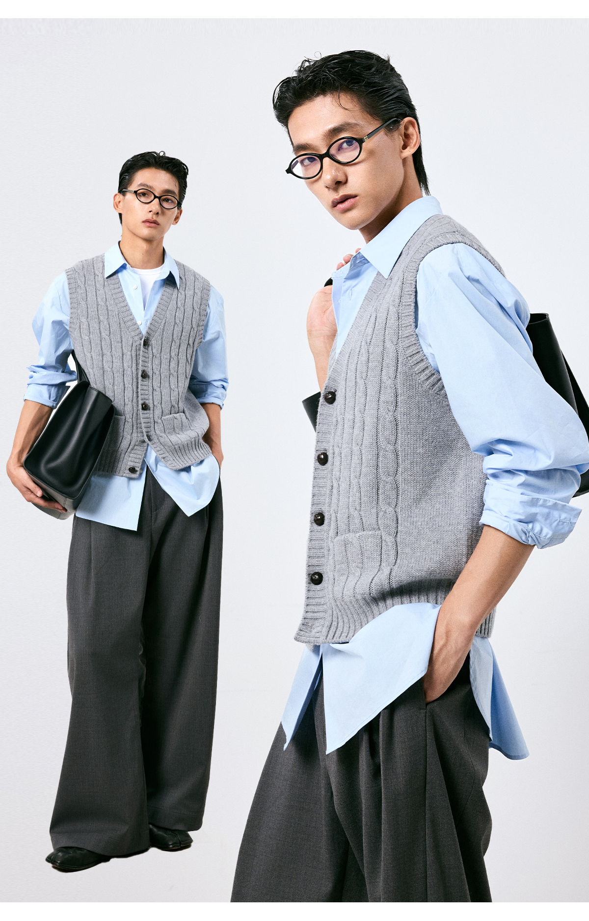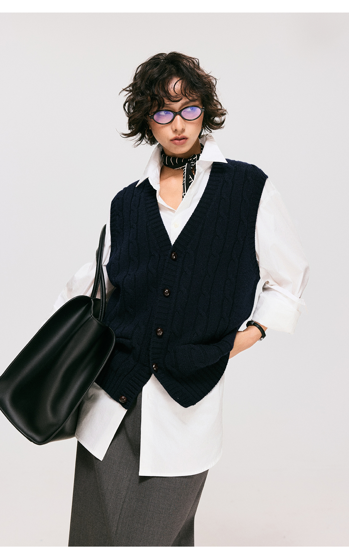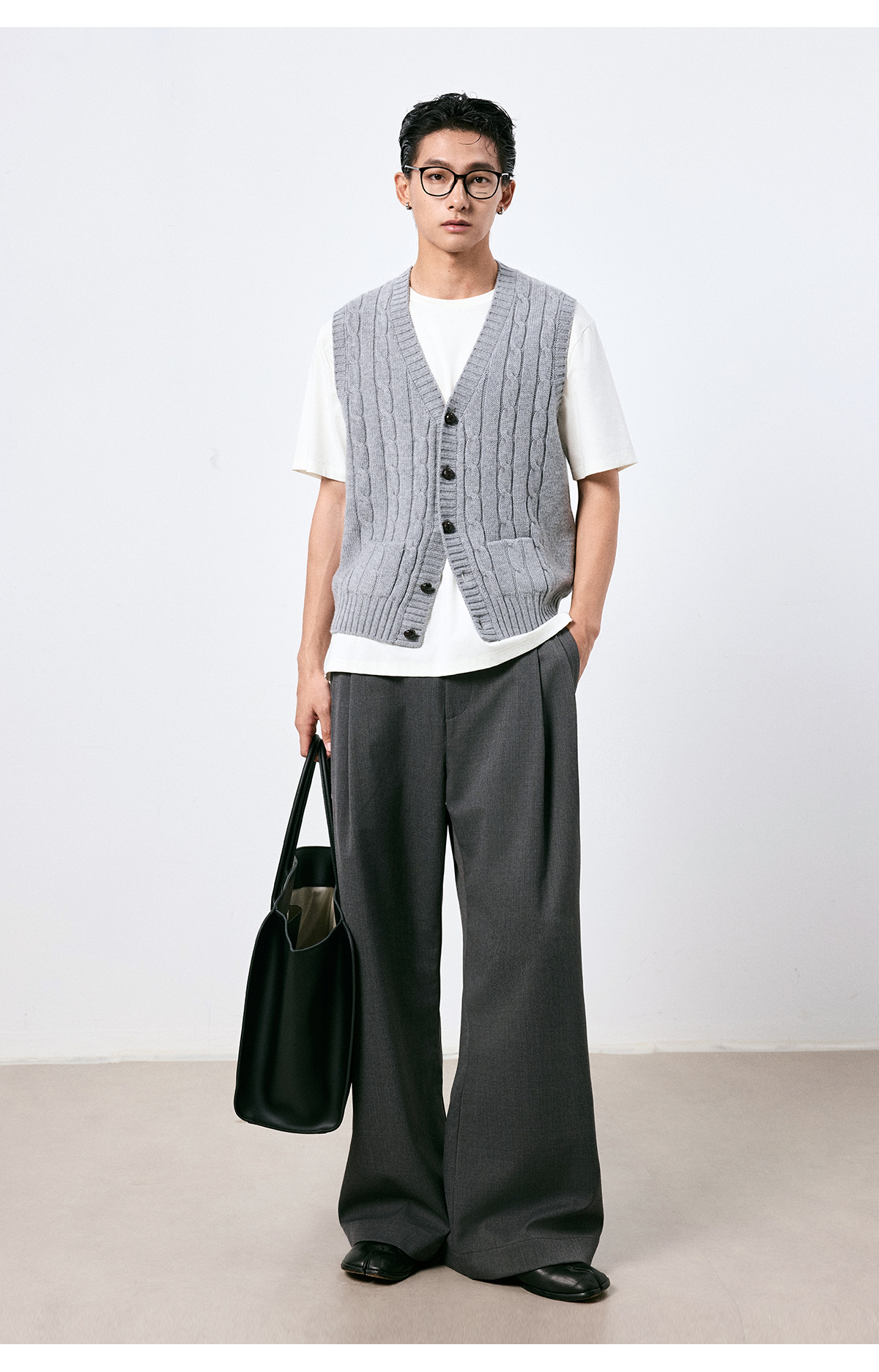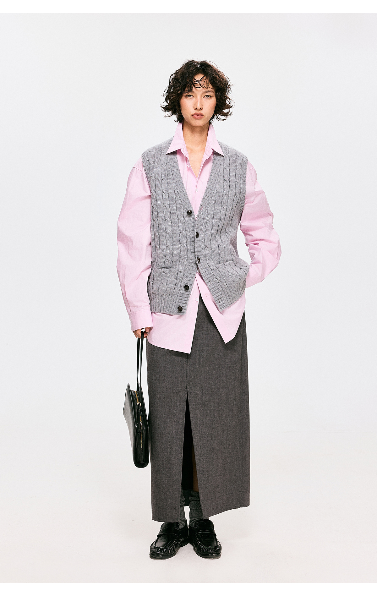 棉仓3661026002-【层序之间】灰色v领针织马甲全羊毛绞花叠穿背心开衫
